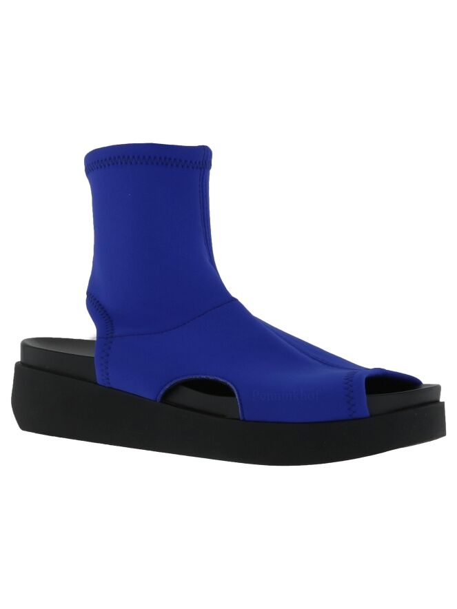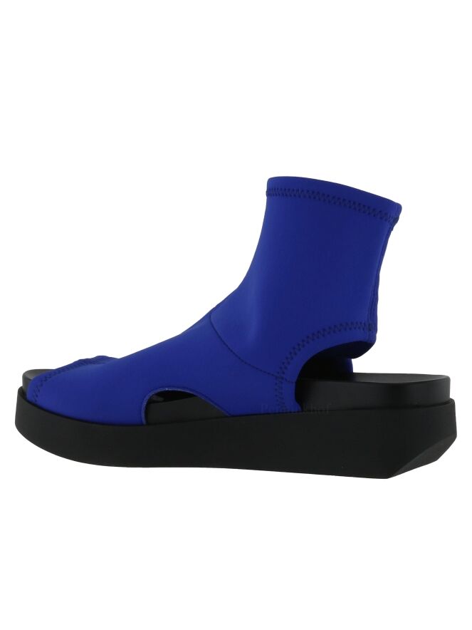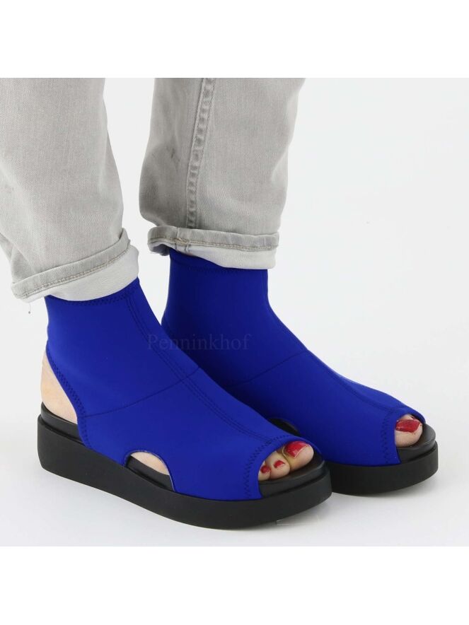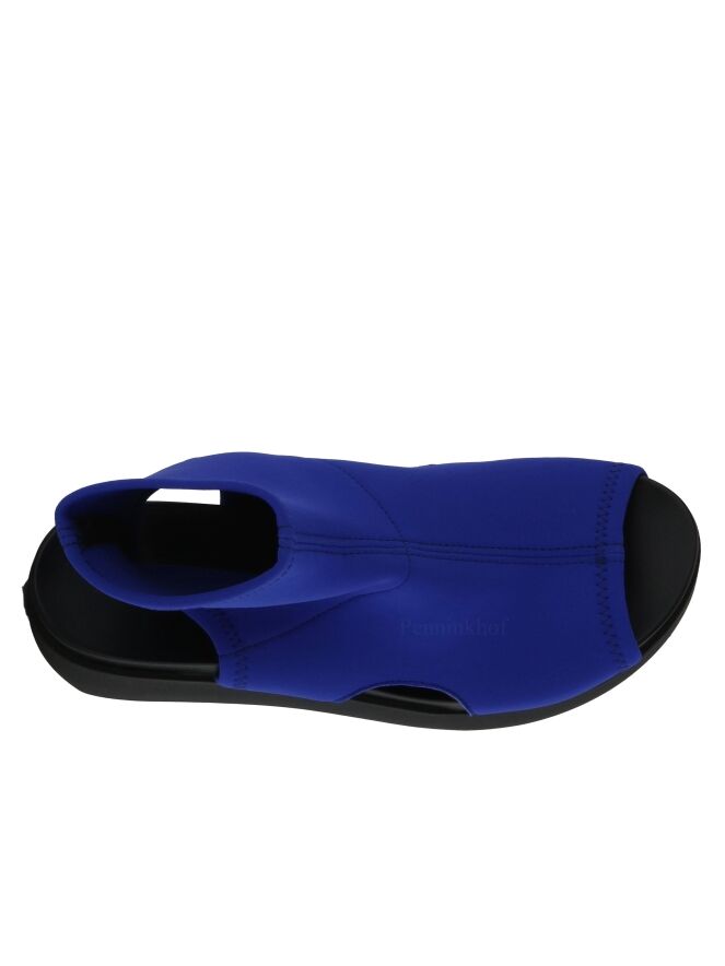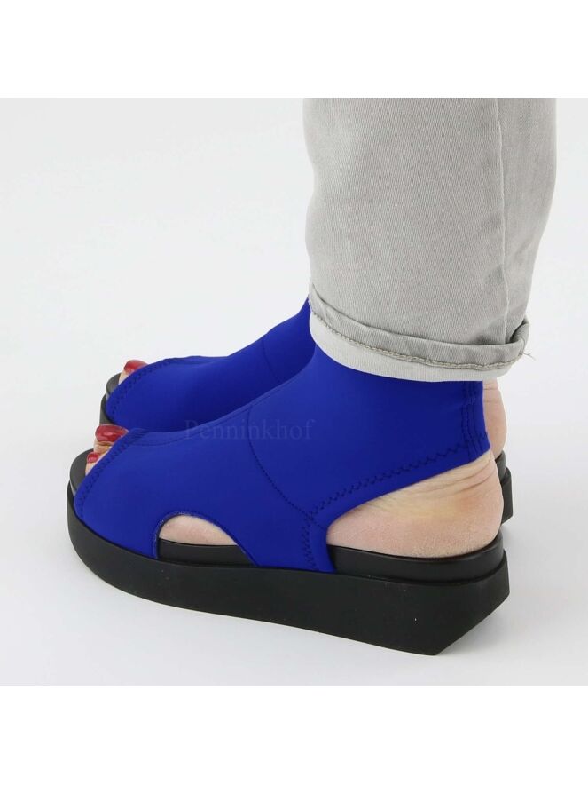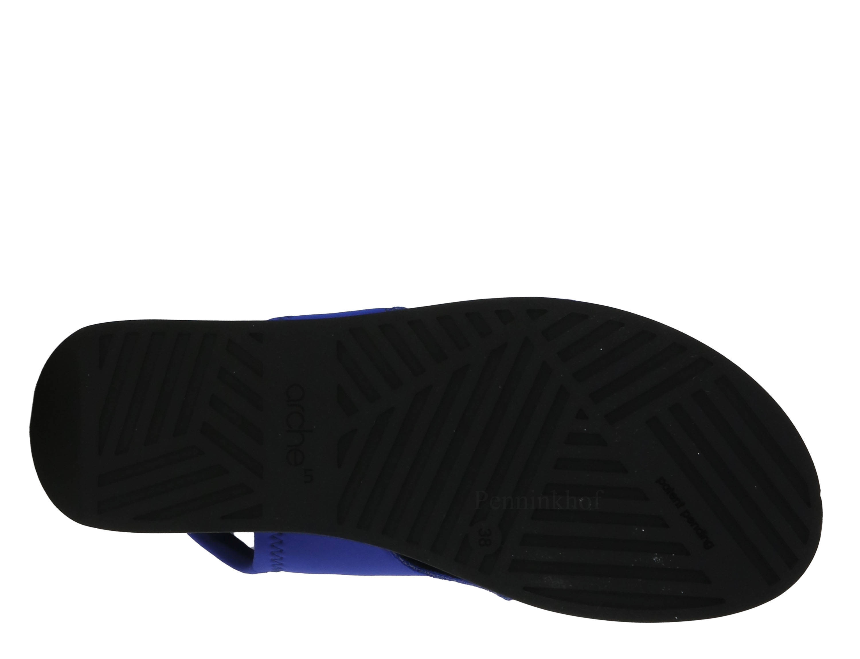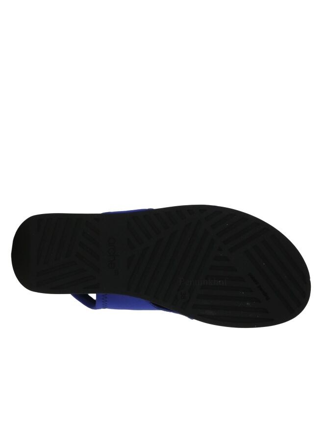 Eine kobaltblaue Sandalette der Schuhmarke Arche. Das Material ist ein elastisches Gewebe. Die Sohle ist aus Latex. Der Zehenbereich und die Ferse sind offen und die Seiten sind mit Öffnungen versehen.