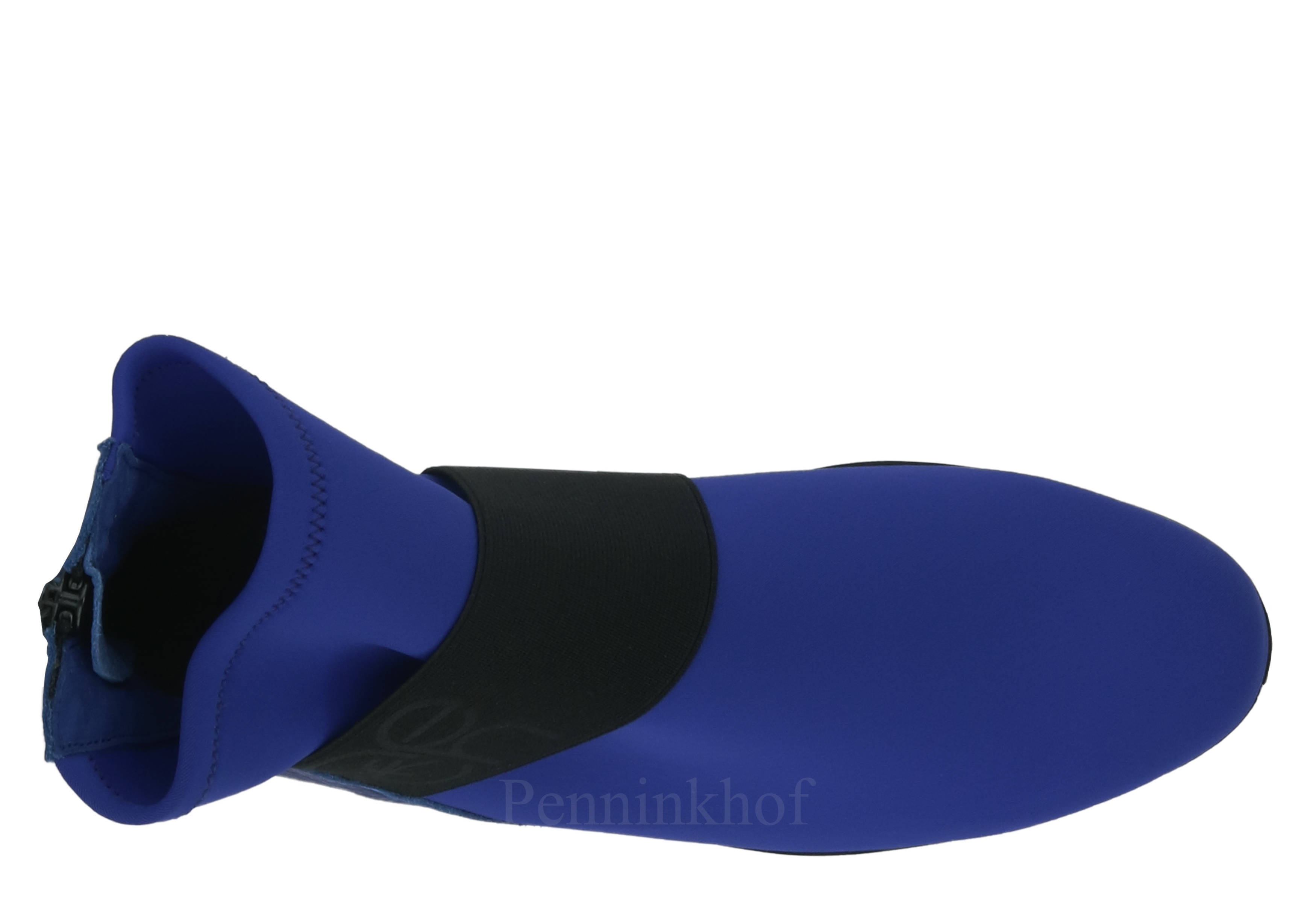 Eine kurze Stiefelette der Schuhmarke Arche in Kobaltblau. Auf dem vorderen Fußteil verläuft ein breites schwarzes Band. Die Ferse ist aus Leder, in der Mitte der Ferse befindet sich ein Reißverschluss.