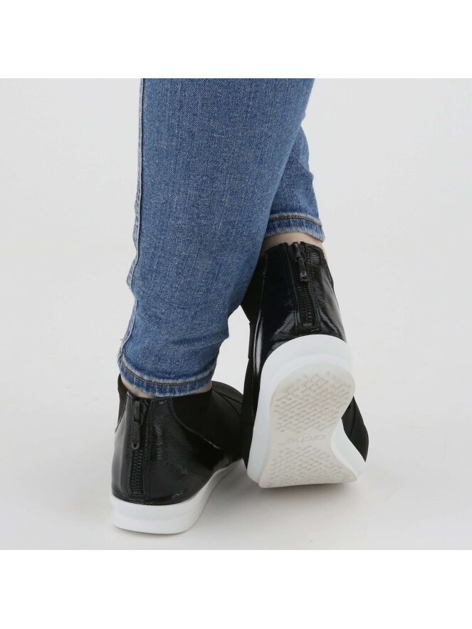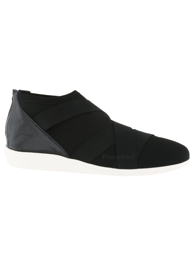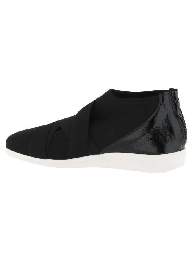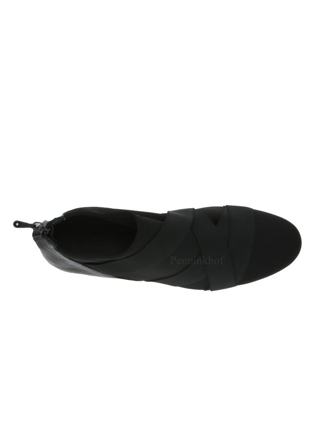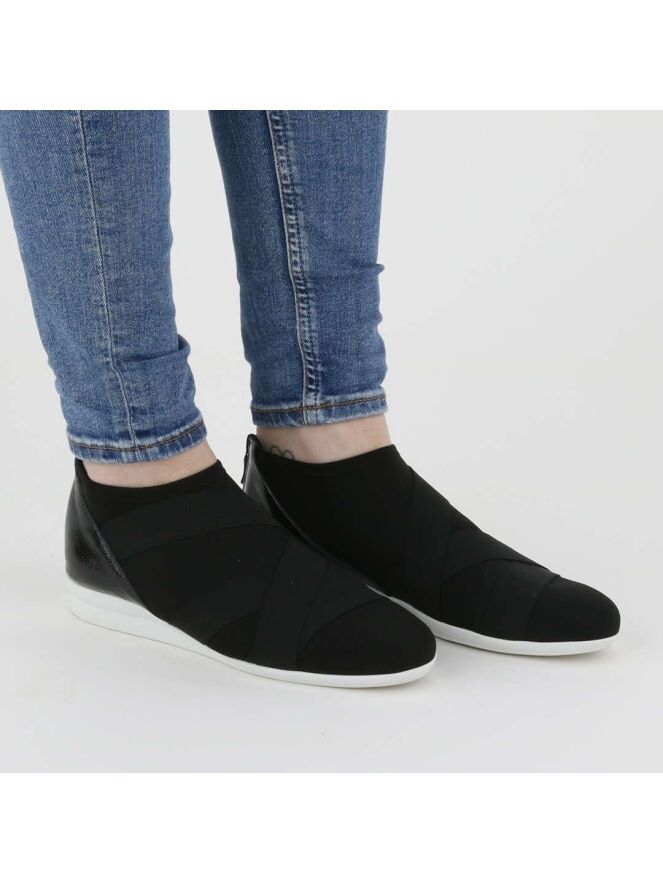 Ein Slipper der Schuhmarke Arche aus einem dehnbaren schwarzen Stoff mit einem schwarzen Gummiband, das diagonal über den Spann verläuft. Die Ferse ist aus schwarzem Lackleder. An der Ferse befindet sich ein kurzer schwarzer Reißverschluss. Die Sohle ist weiß.