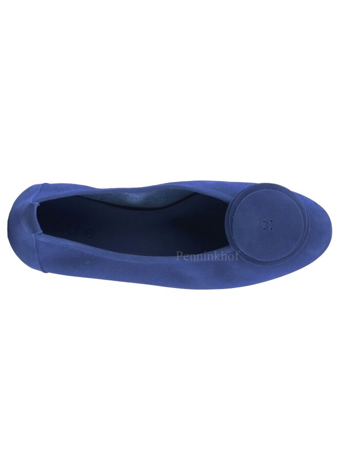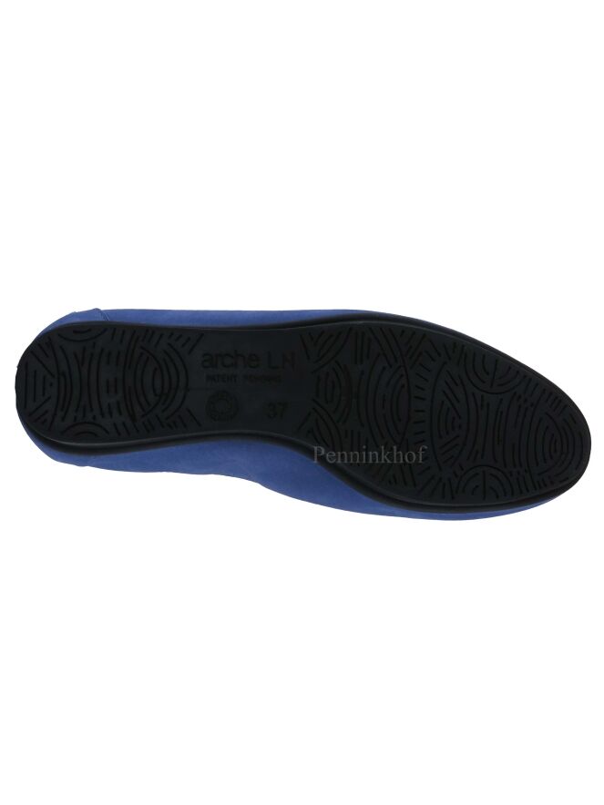 Ein himmelblauer Ballerina der Schuhmarke Arche. Der vordere Fußbereich ist mit abgerundeten Lederstreifen in der gleichen Farbe versehen. Der Ballerina ist nicht gefüttert.