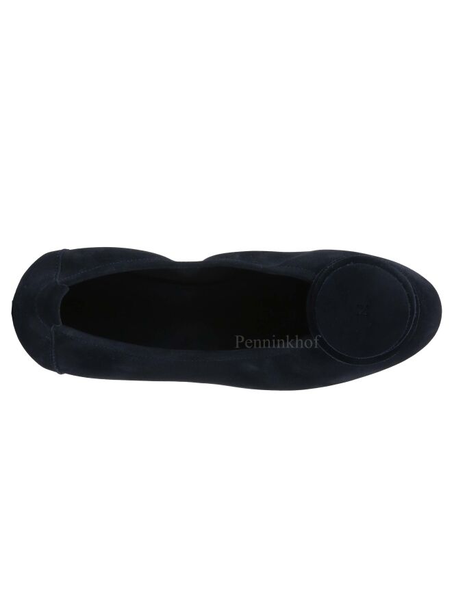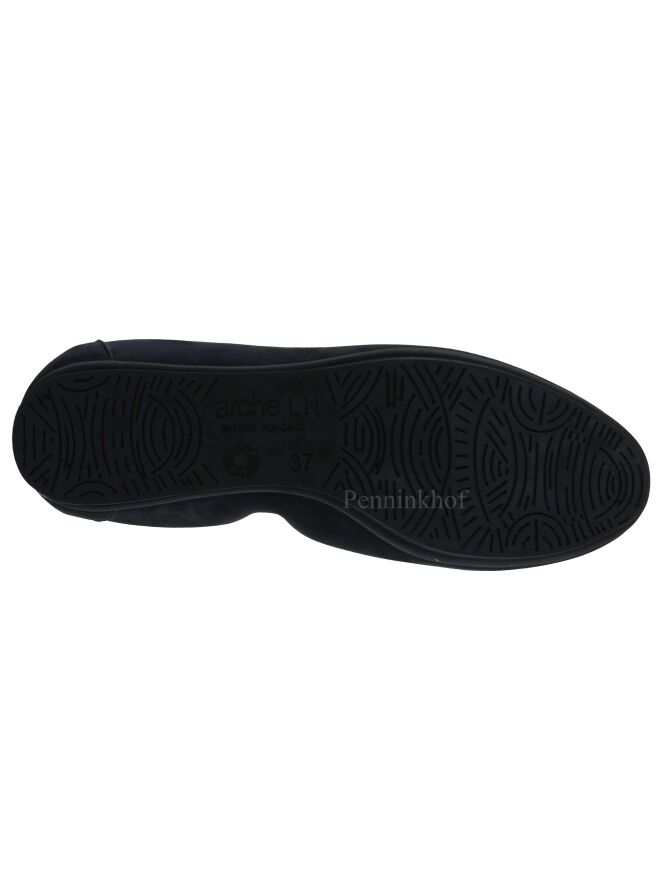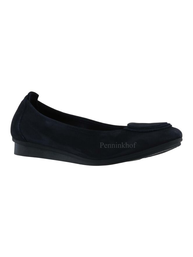 Ein marineblauer Ballerina der Schuhmarke Arche. Der vordere Fußbereich ist mit abgerundeten Lederstreifen in der gleichen Farbe versehen. Der Ballerina ist nicht gefüttert.