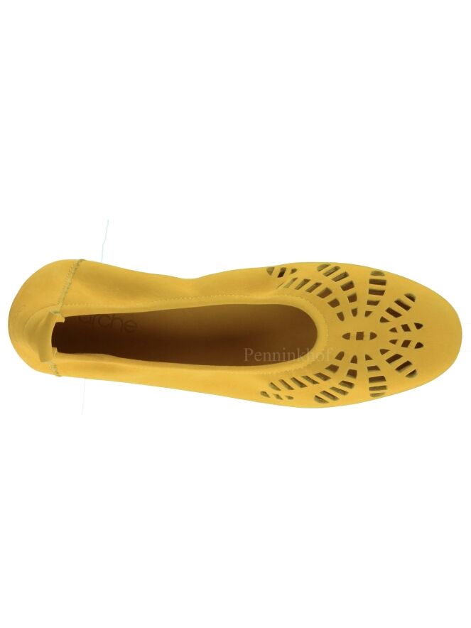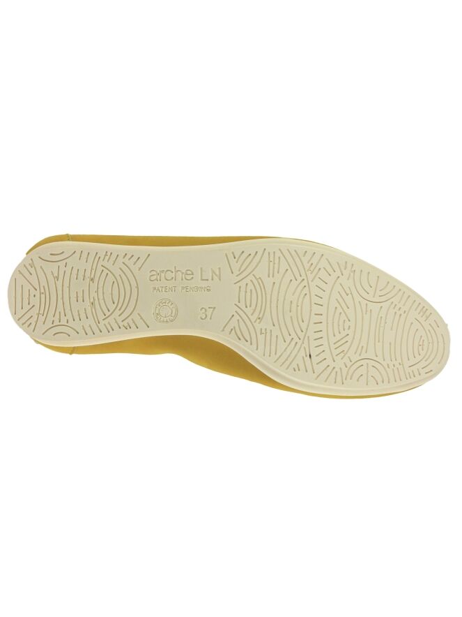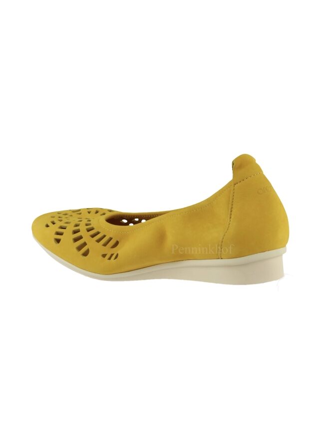 Ein gelber Ballerina der Schuhmarke Arche. Der vordere Fußbereich ist im Form einer Blüte perforiert. Die Sohle ist cremeweiß. Der Ballerina ist nicht gefüttert.