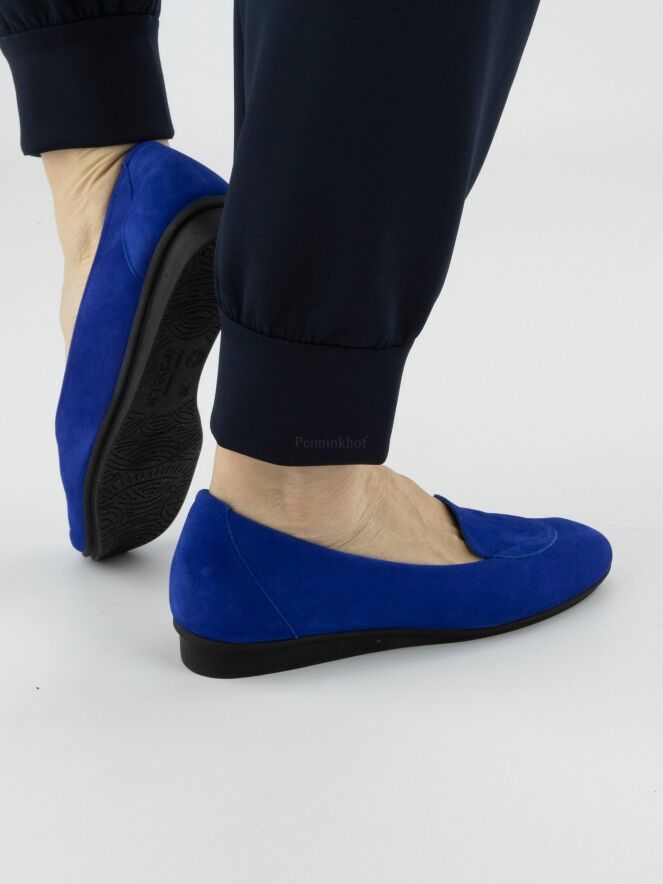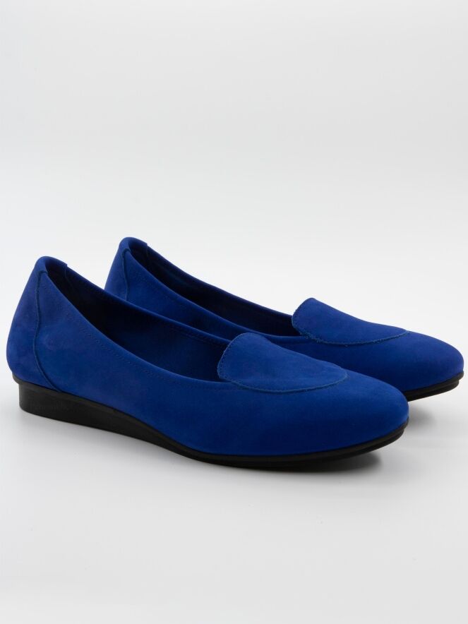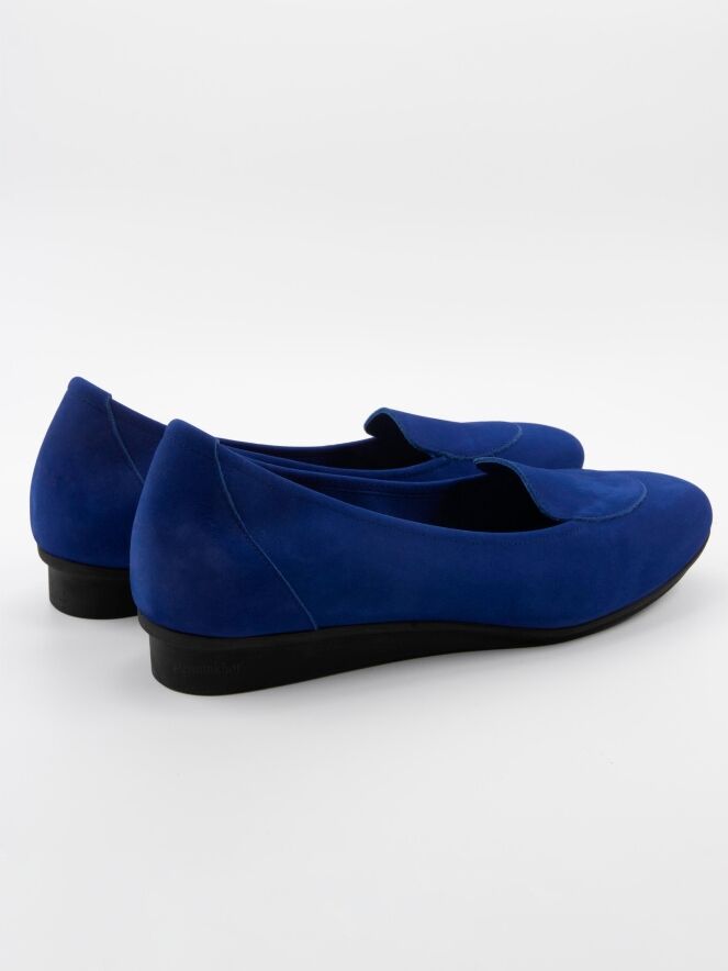 Ein Halbschuh in Kobaltblau mit einer erhöhten Sohle an der Ferse. Die Innenseite ist ungefüttert.