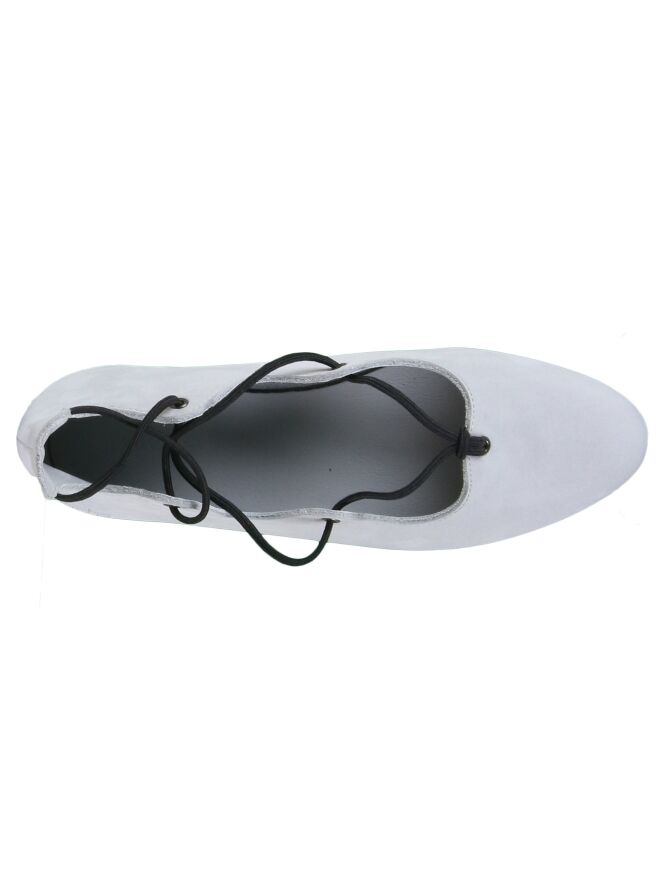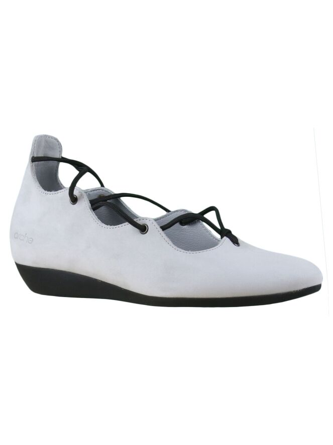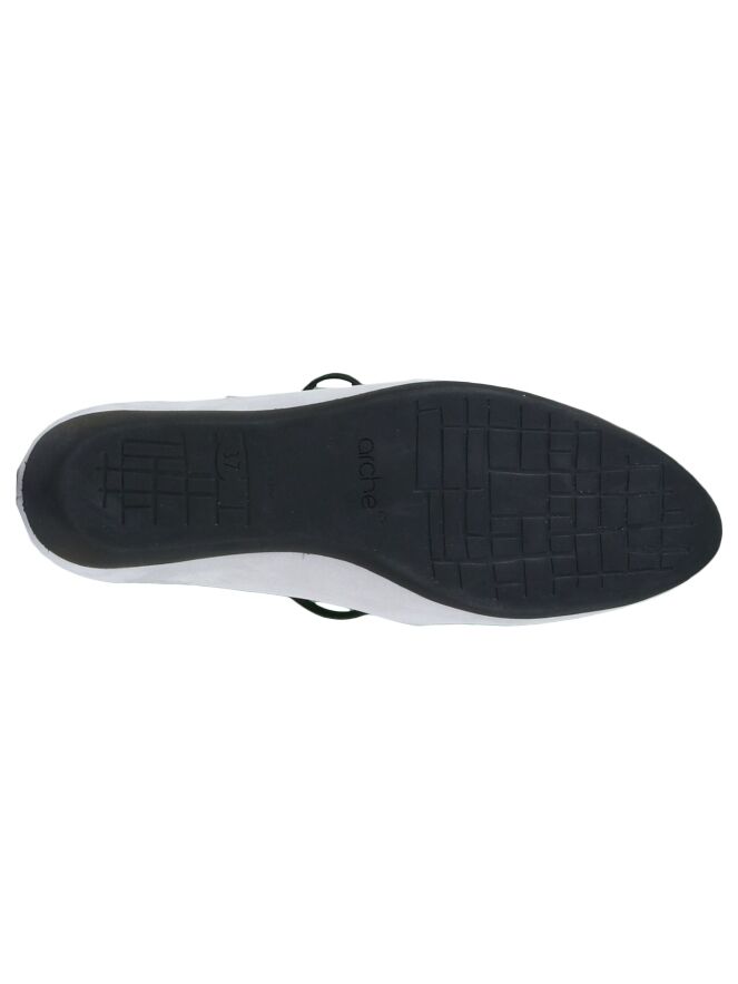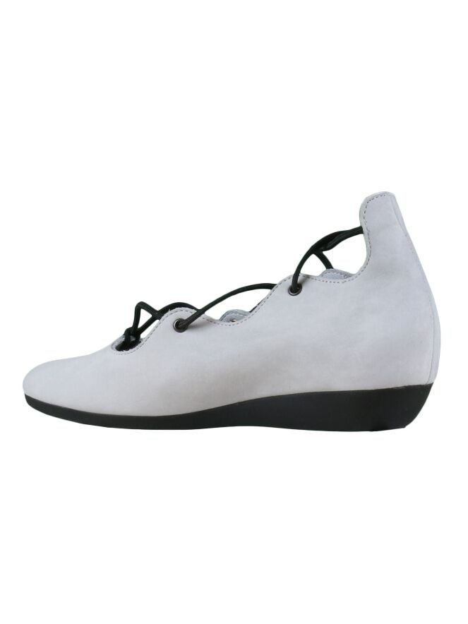 Slipper oder Halbschuh der Schuhmarke Arche in einem weichen Grau. Die Seitenkanten verlaufen in einer Wellenlinie. Aus der Mitte des Vorfußes verläuft eine elastische Schnur entlang der Kanten, was dem Fuß einen schönen Effekt verleiht. Dieser Halbschuh hat kein Innenfutter.