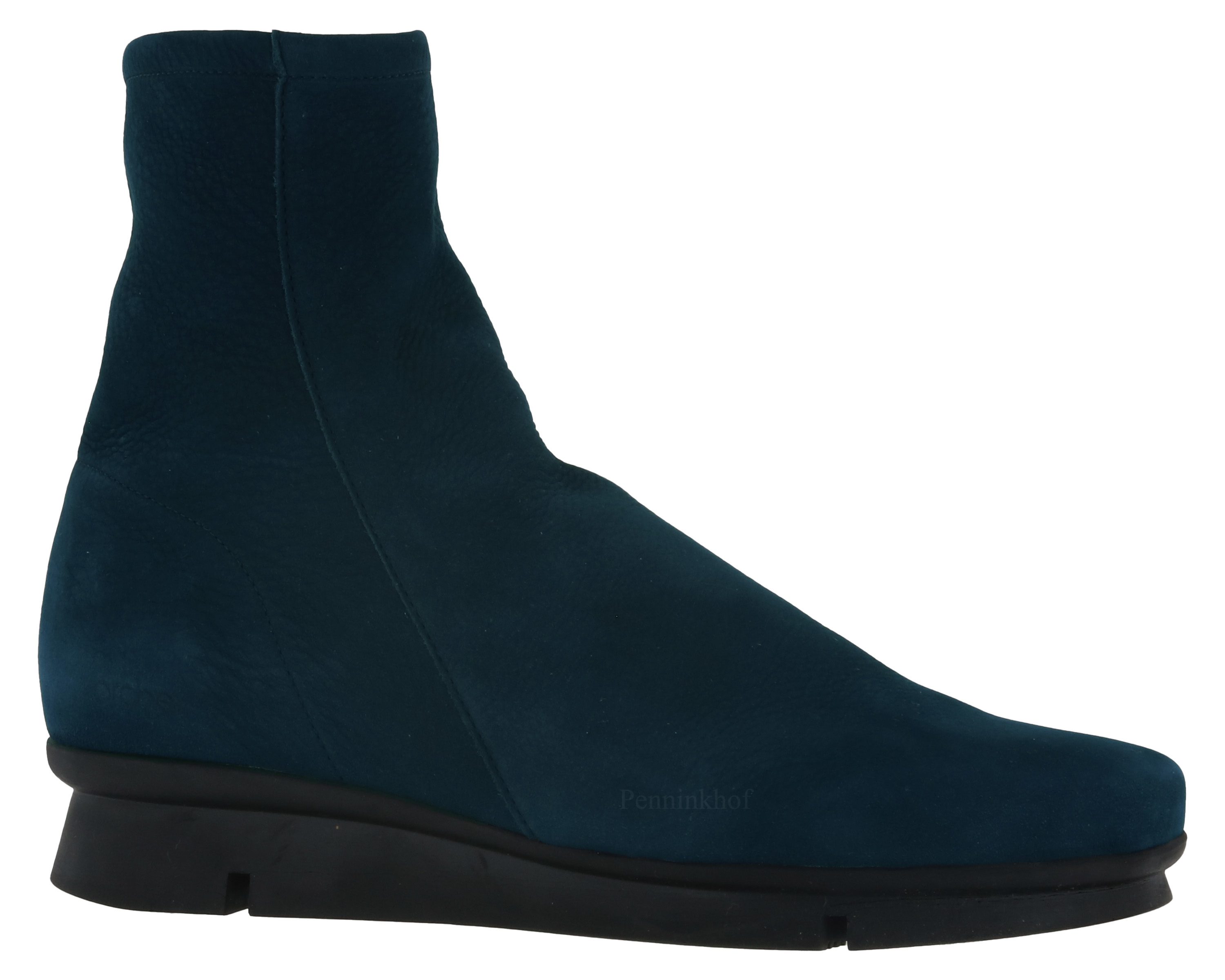 Eine Stiefelette der Schuhmarke Arche in Schwarz. Auf der Außenseite befindet sich ein abgewinkelter Reißverschluss in der Farbe Schwarz. Die gezackte Sohle ist ebenfalls schwarz. Die Stiefelette ist vorne abgerundet und nicht gefüttert.