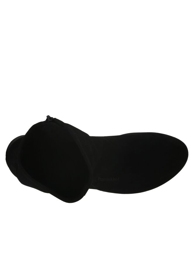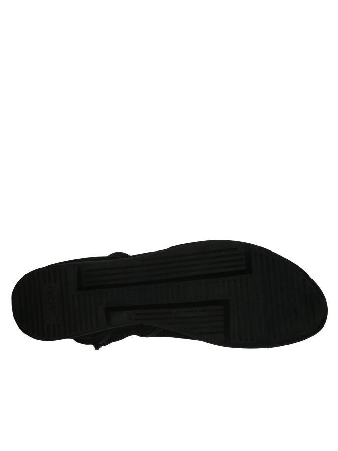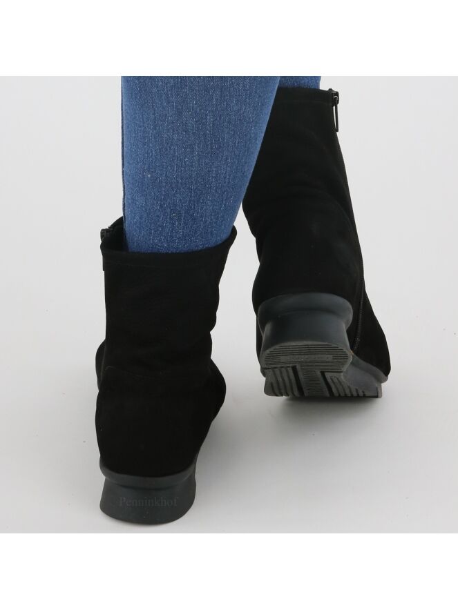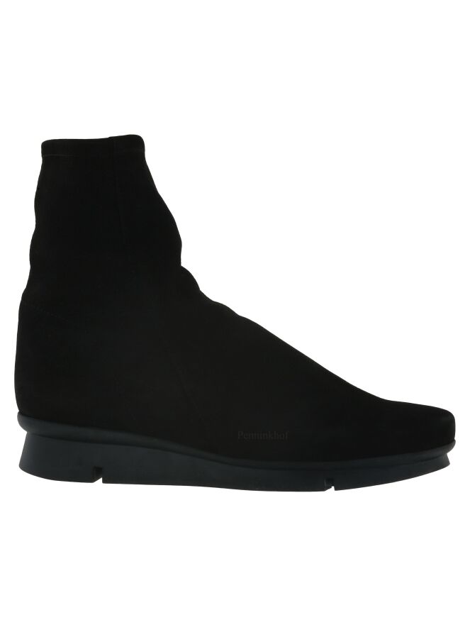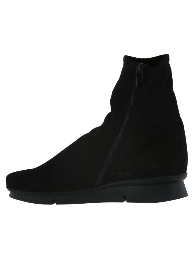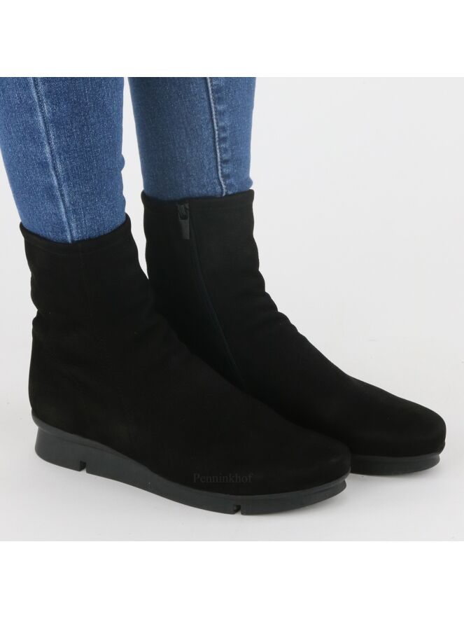 Eine Stiefelette der Schuhmarke Arche in Schwarz. Die Stiefelette hat eine leicht erhöhte sportliche Latexsohle in Schwarz. Auf der Innenseite befindet sich ein schwarzer Reißverschluss. Die Stiefelette ist vorne abgerundet und nicht gefüttert.