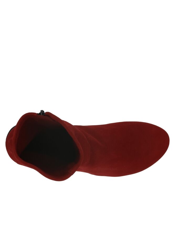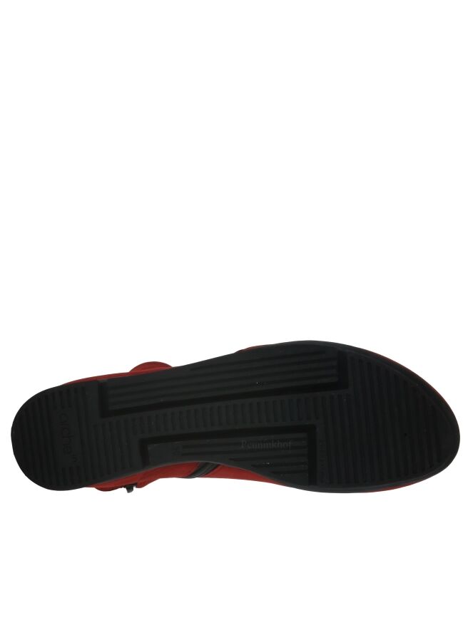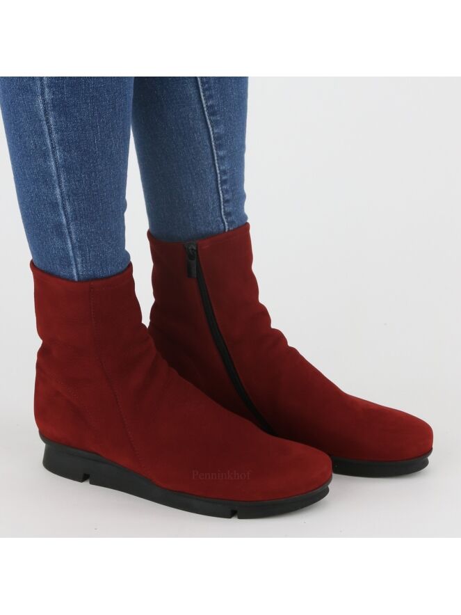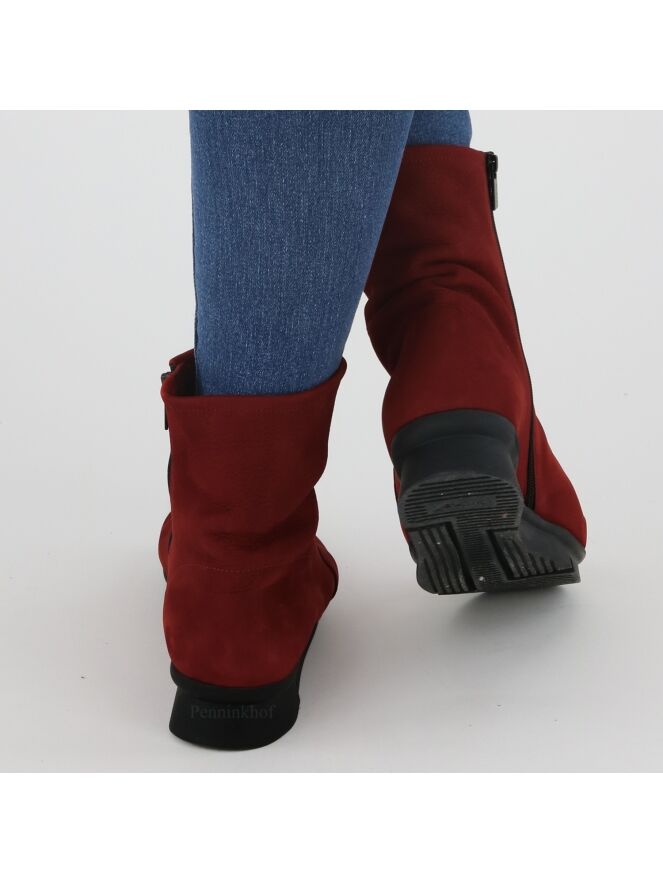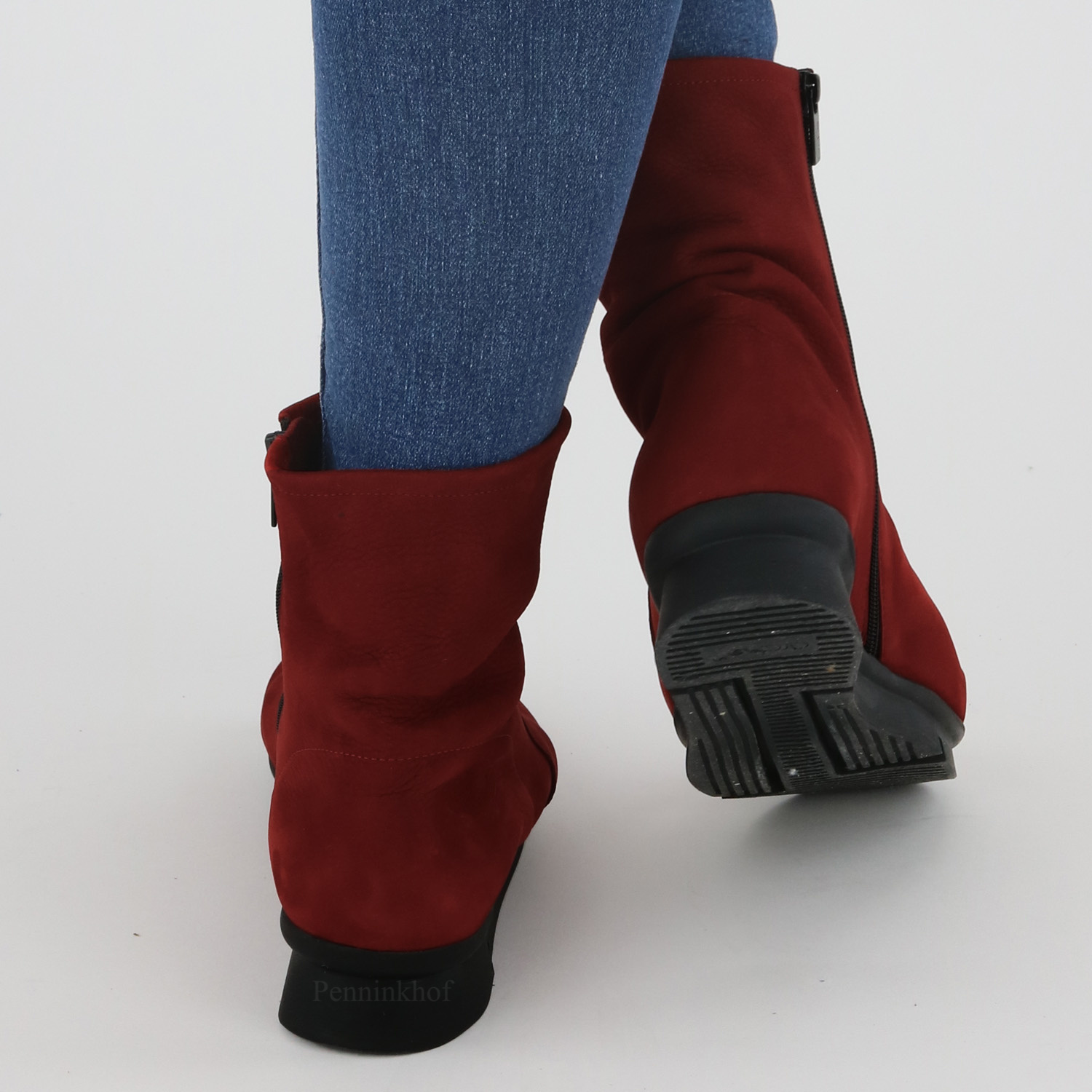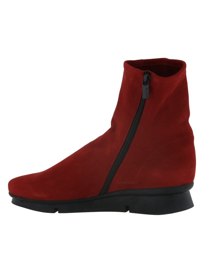 Eine Stiefelette der Schuhmarke Arche in Rot. Die Stiefelette hat eine leicht erhöhte sportliche Latexsohle in Schwarz. Auf der Innenseite befindet sich ein schwarzer Reißverschluss. Die Stiefelette ist vorne abgerundet und nicht gefüttert.