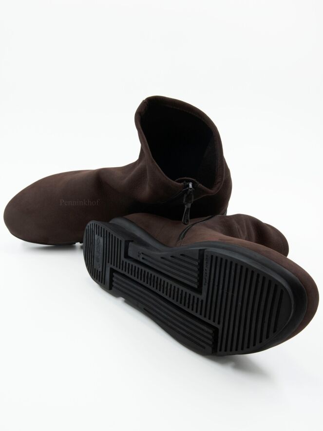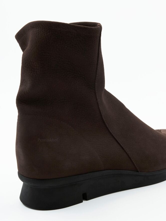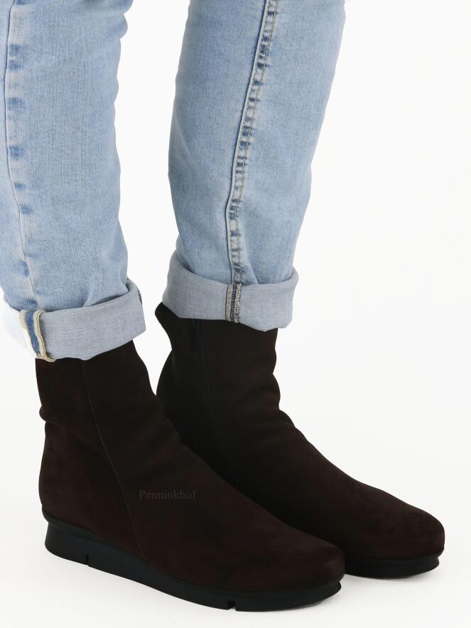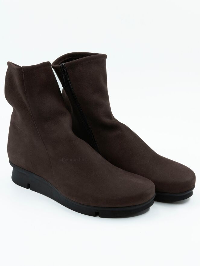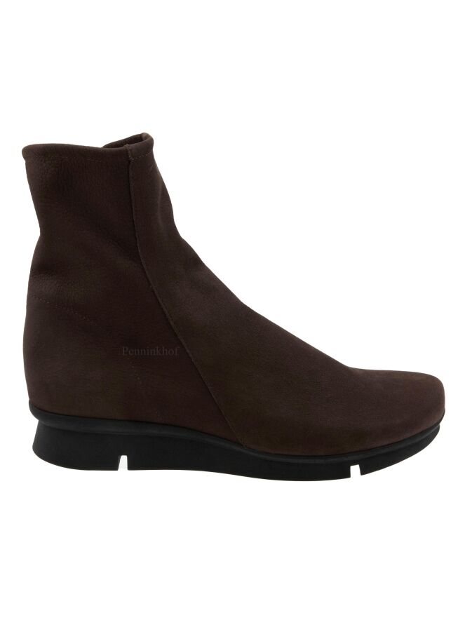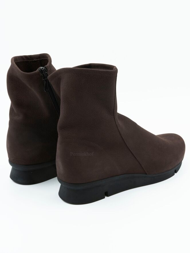 Eine Stiefelette der Schuhmarke Arche in Mokkabraun. Die Stiefelette hat eine leicht erhöhte sportliche Latexsohle in Schwarz. Auf der Innenseite befindet sich ein schwarzer Reißverschluss. Die Stiefelette ist vorne abgerundet und nicht gefüttert.