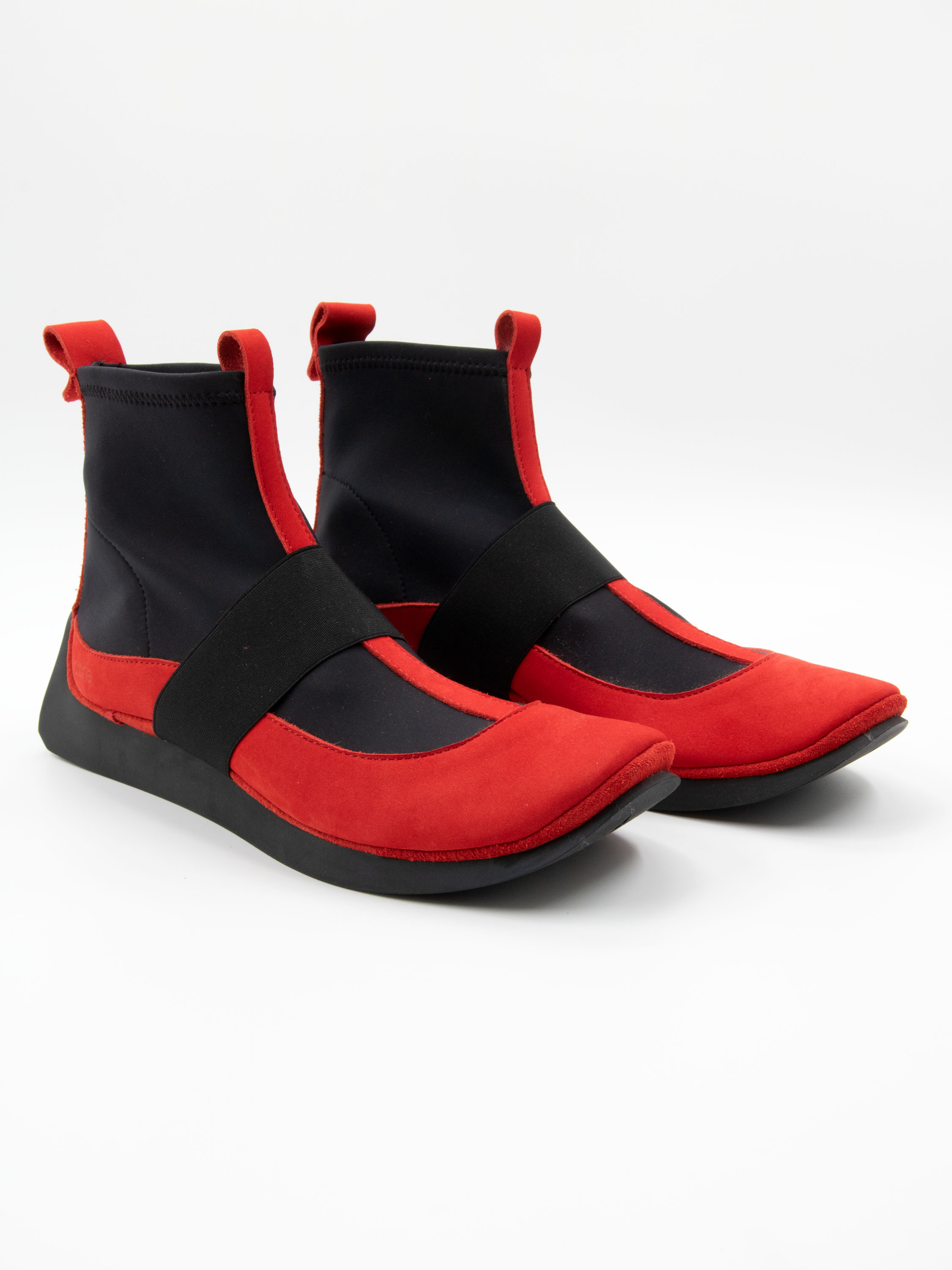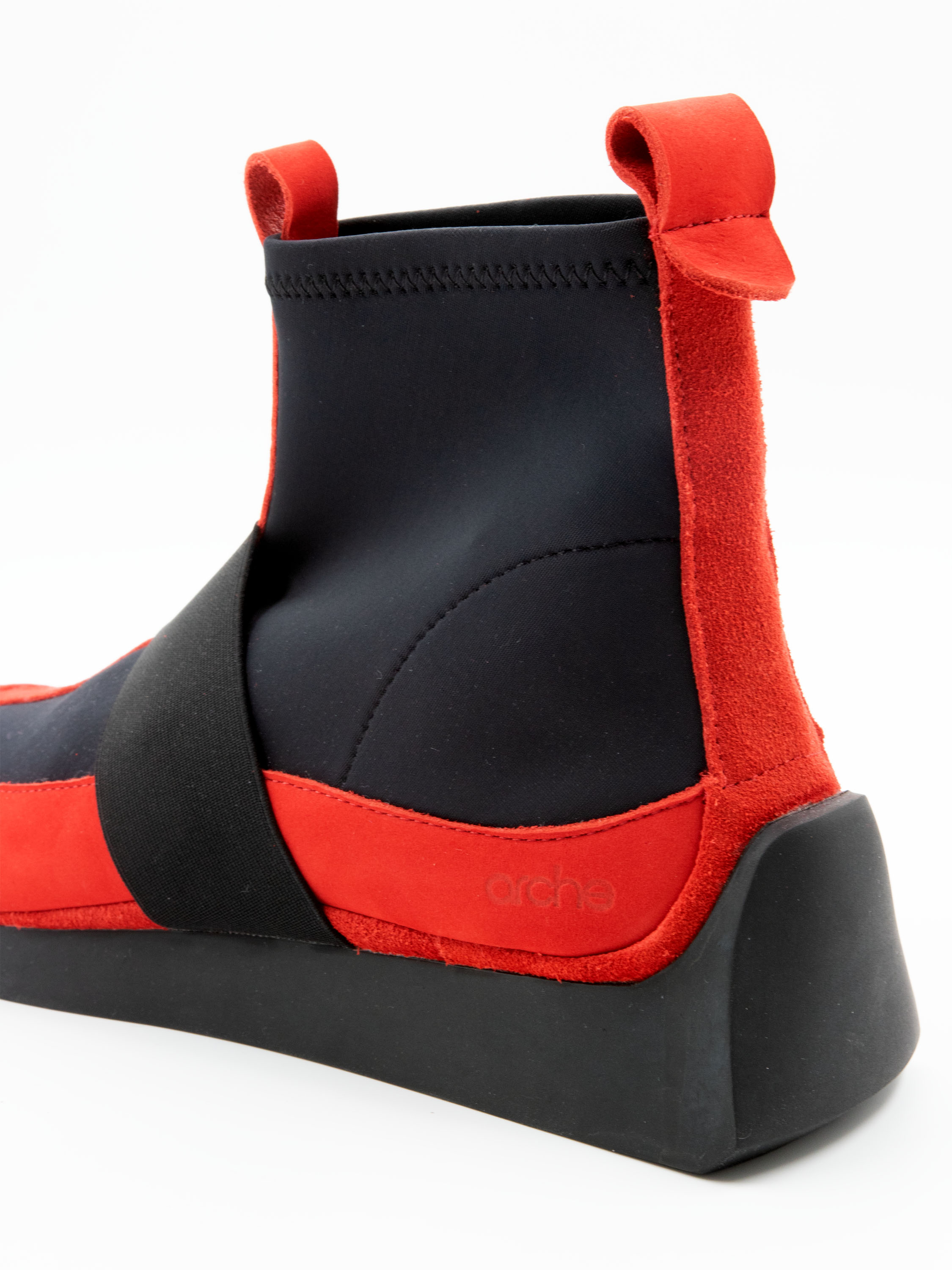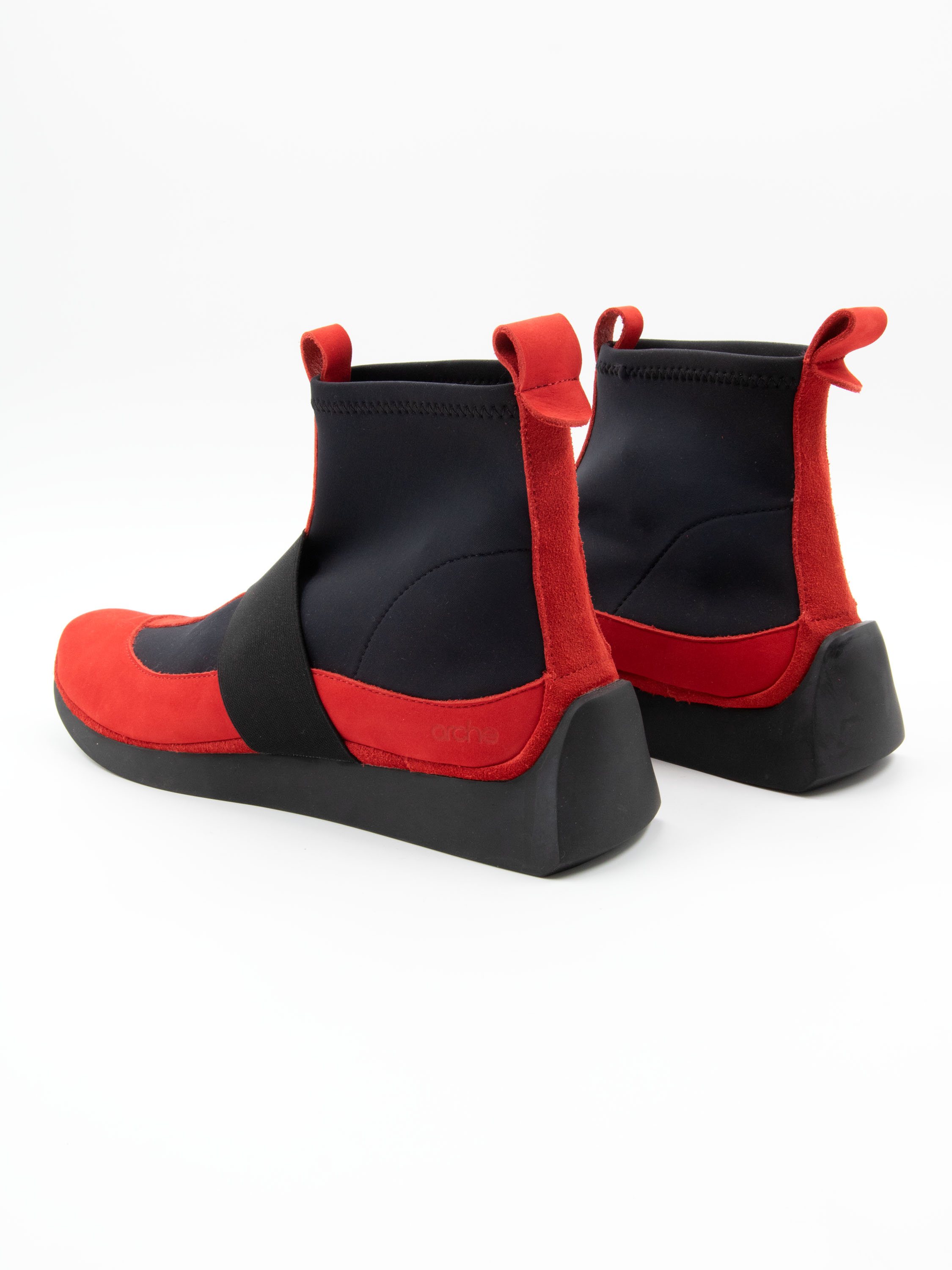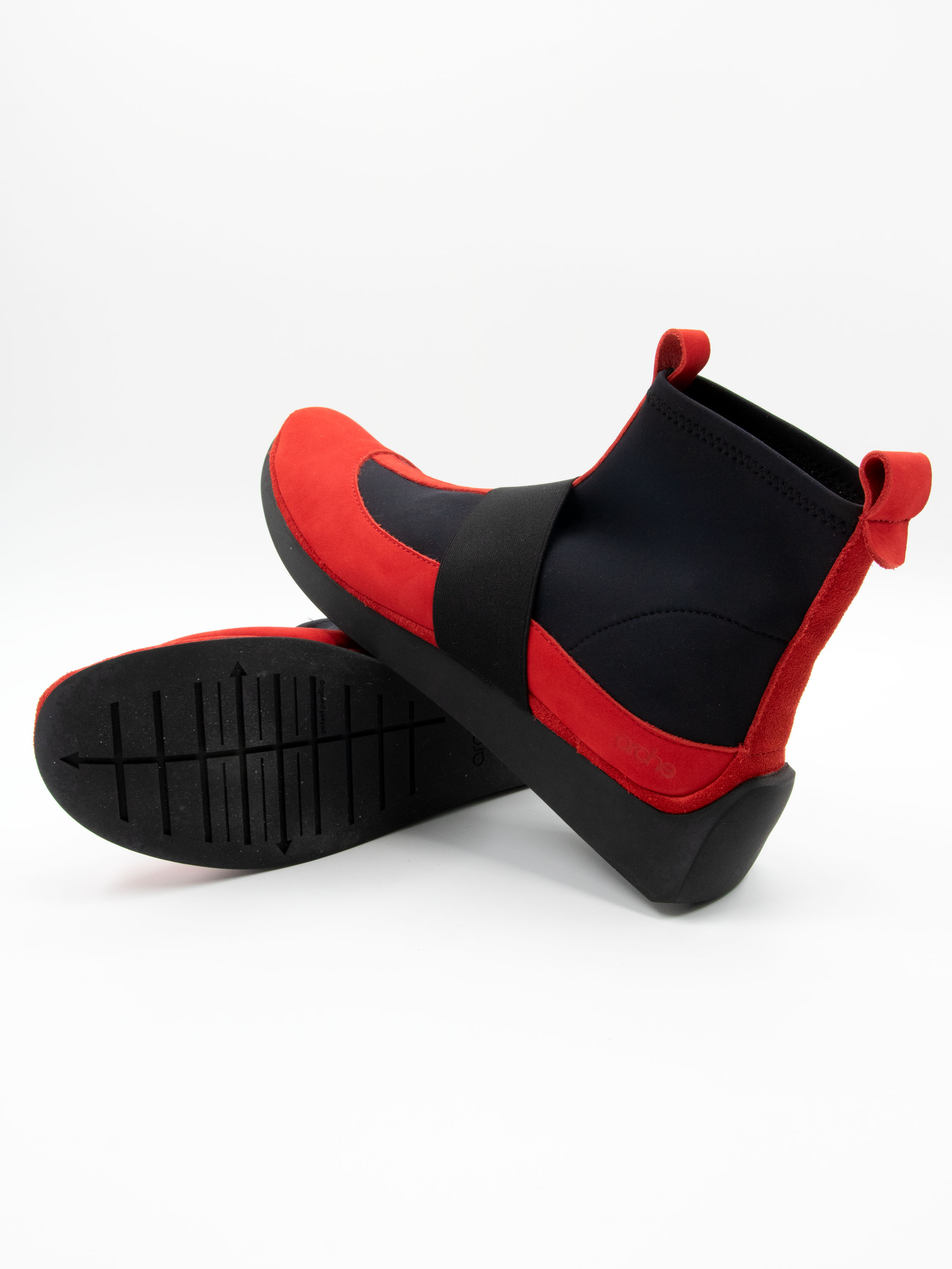 Kurzes Stiefelettenmodell von Arche in kräftigem Rot. Schwarze elastische Einsätze verlaufen von den Seiten des Vorderfußes bis zum Schaft. An der Ferse befindet sich eine Biese aus Nubukleder. Über dem Vorderfuß verläuft ein breites elastisches Band. Das Innere des Schuhs ist ungefüttert.