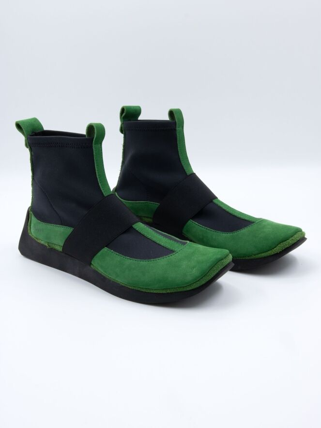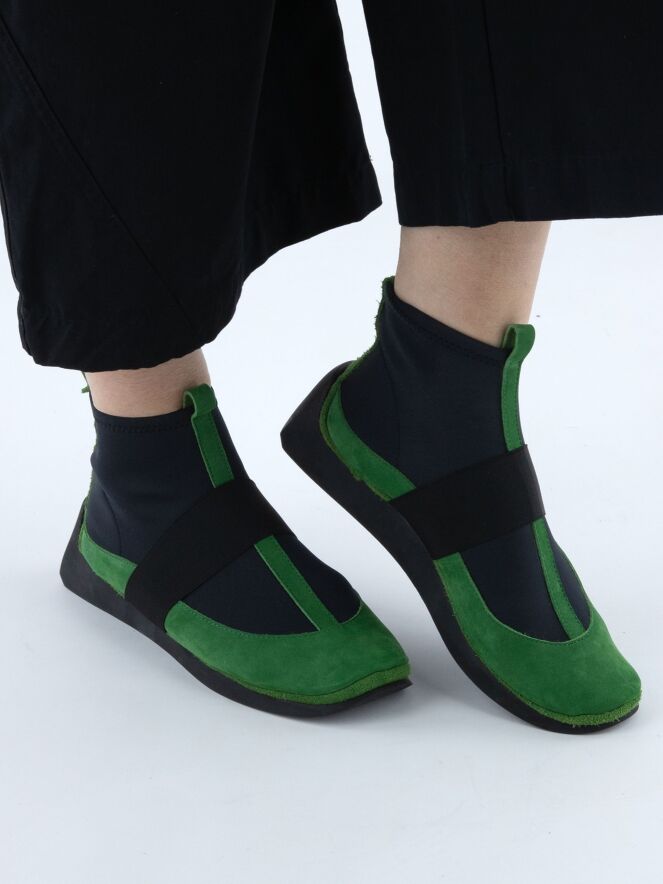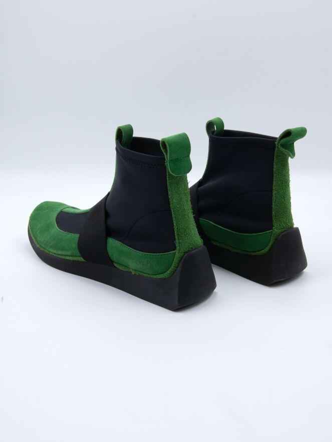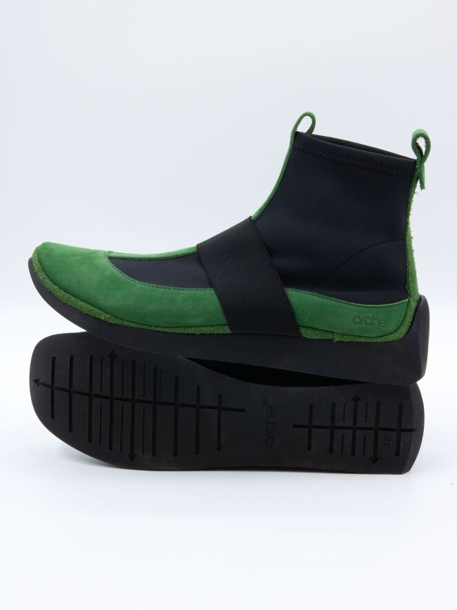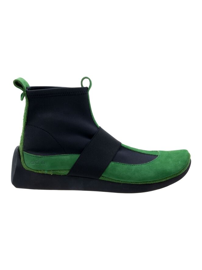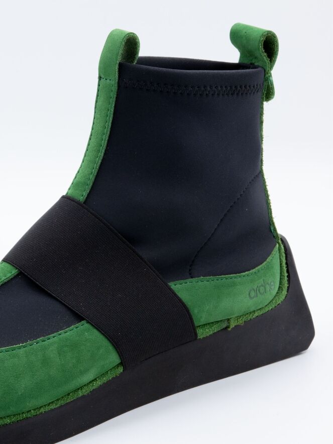 Kurzes Stiefelettenmodell von Arche in einem satten Grünton. Vom Vorderfuß bis zum Schaft verläuft elastisches Material, an der Ferse befindet sich eine Nubukpaspel. Über dem Vorderfuß liegt ein breites elastisches Band. Das Innenfutter ist ungefüttert.