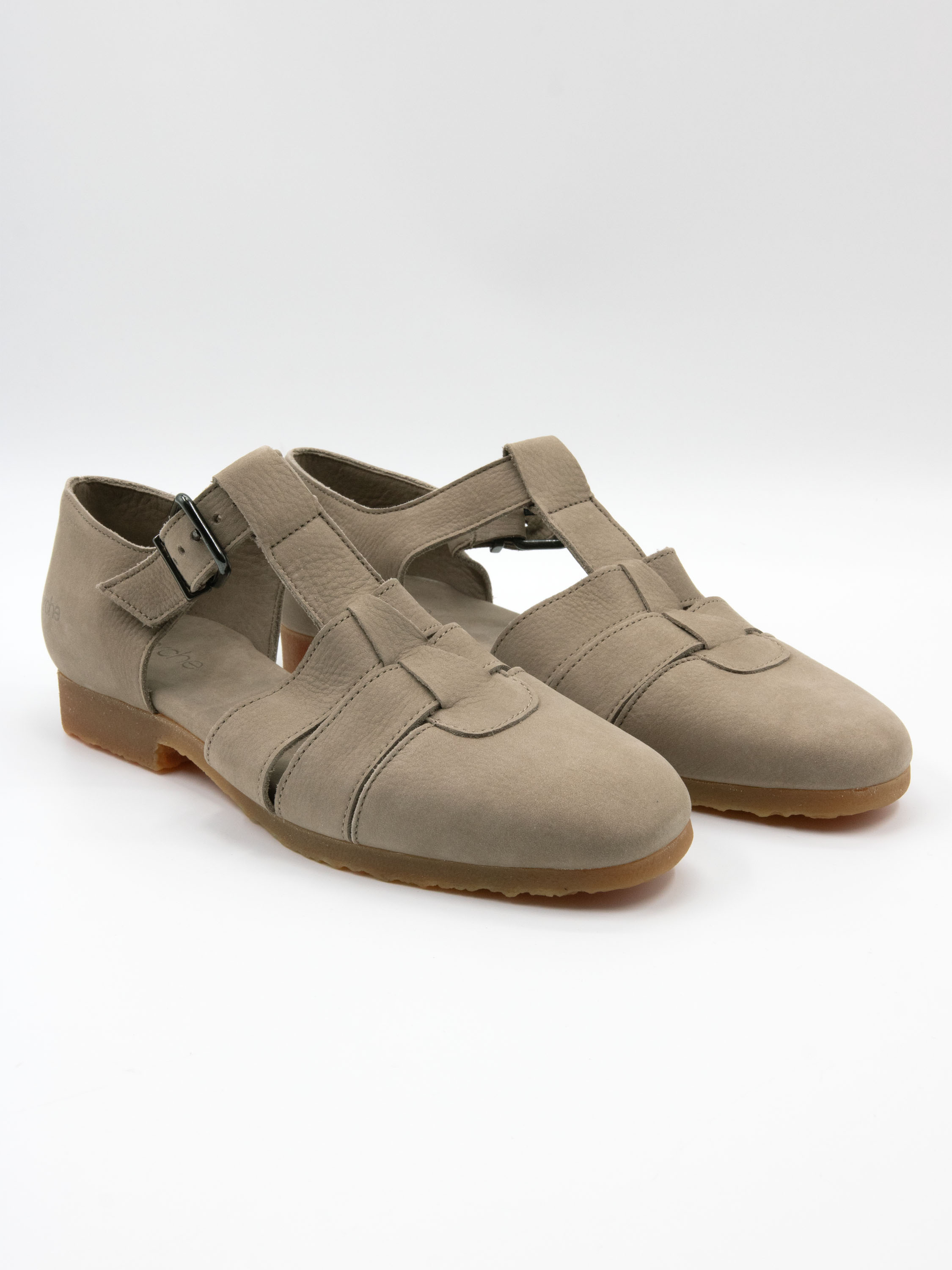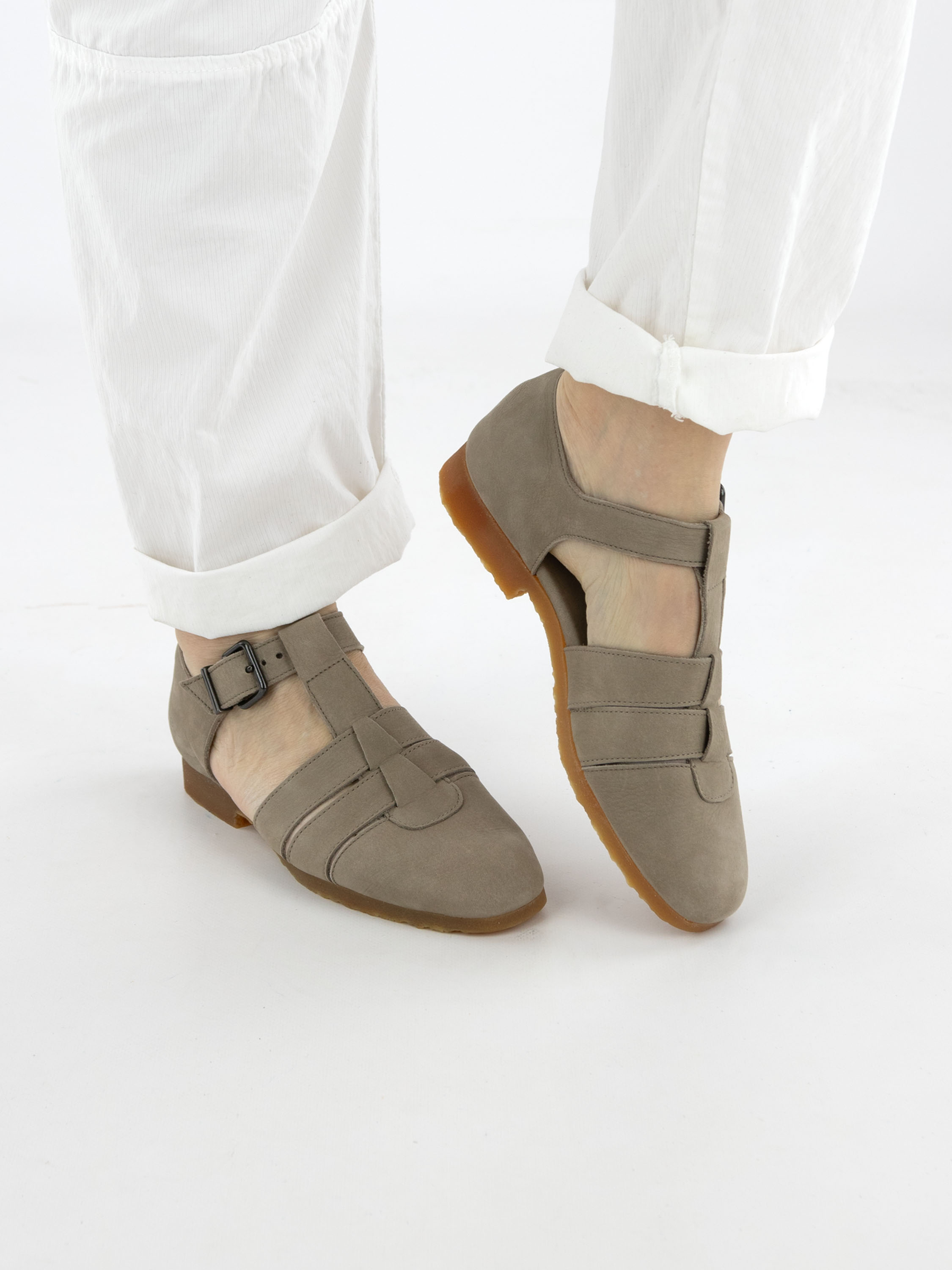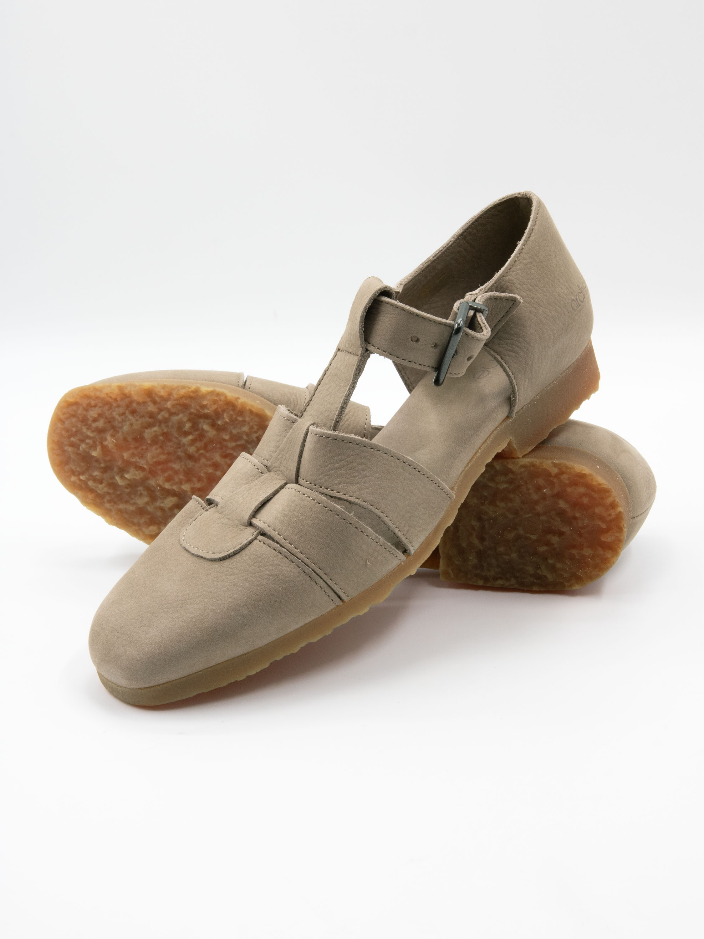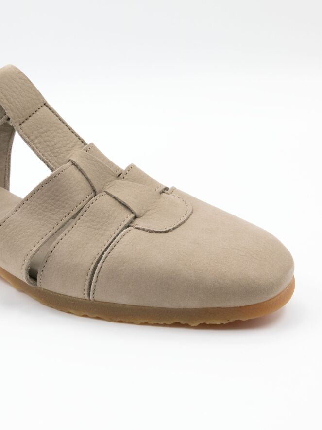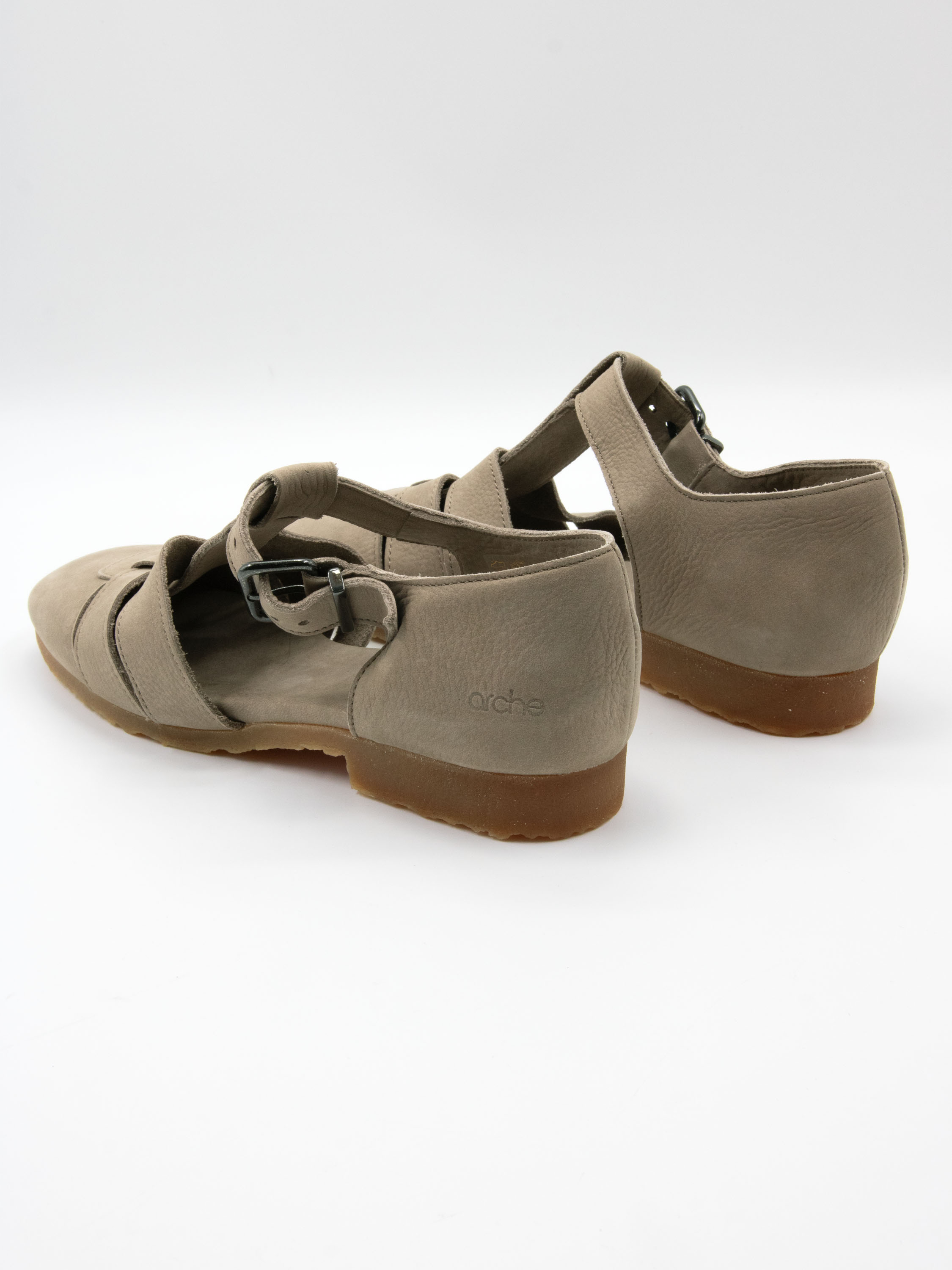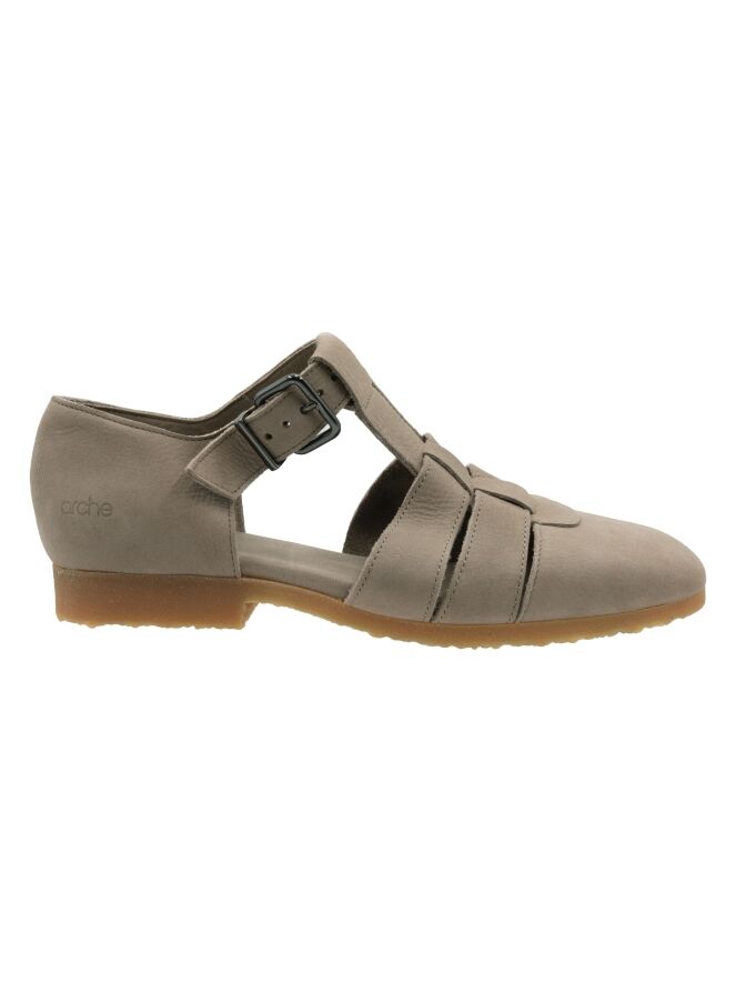 Sandale von Arche in einem eleganten Hellgrau. Mit geschlossener Spitze und Ferse gestaltet, bietet sie eine raffinierte und bequeme Passform. Der verstellbare Riemen über dem Vorderfuß mit Schnalle ermöglicht eine individuelle Anpassung. Die honigfarbene Sohle setzt einen warmen, natürlichen Akzent.