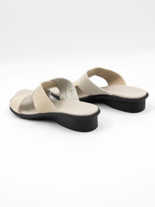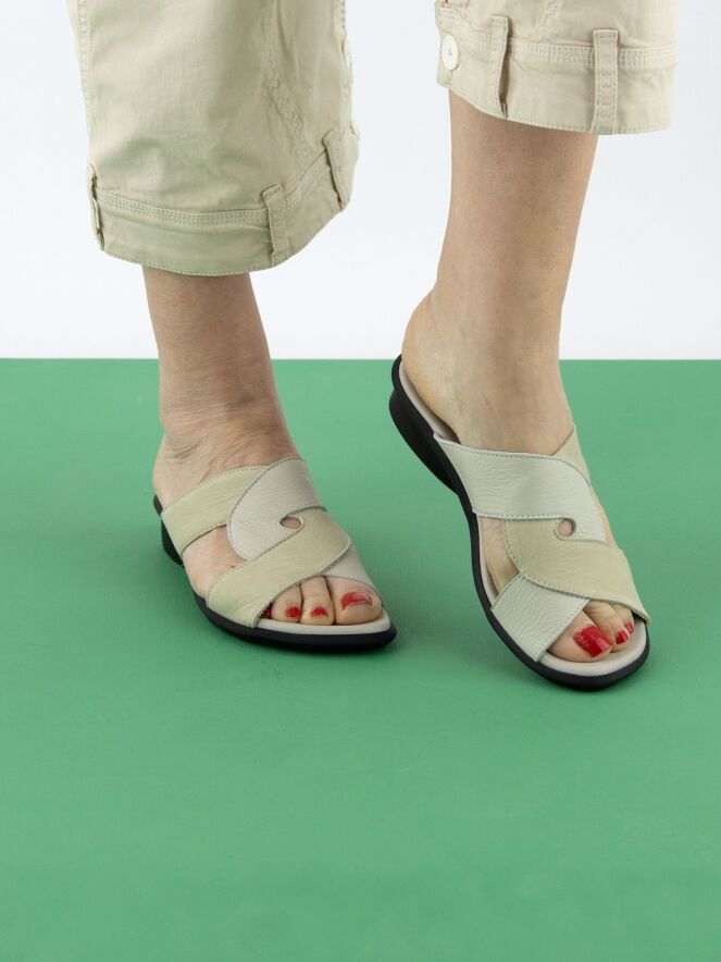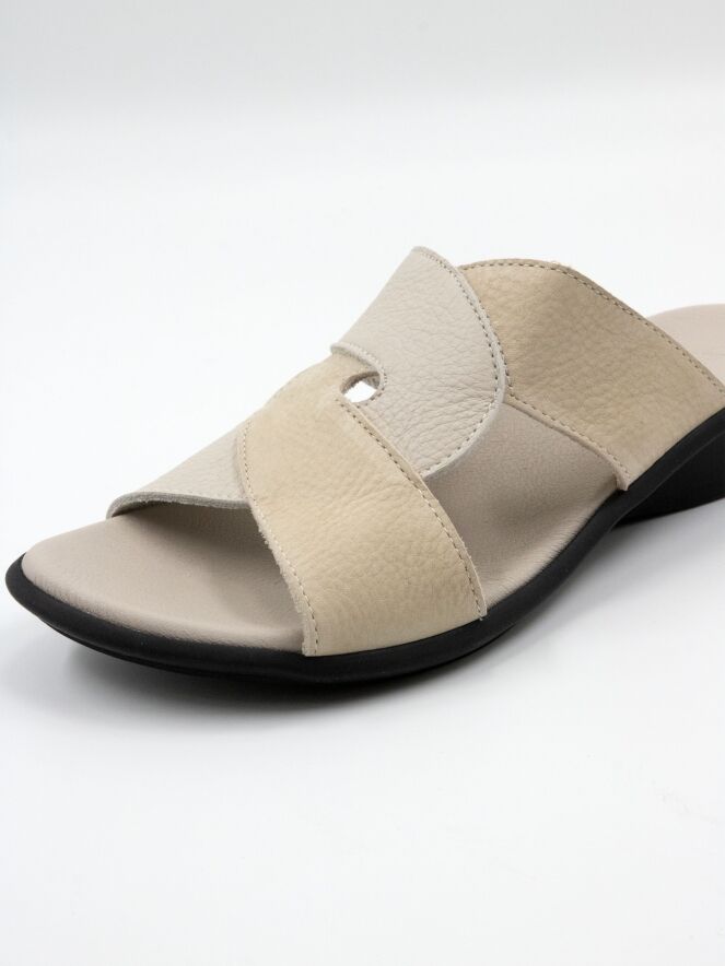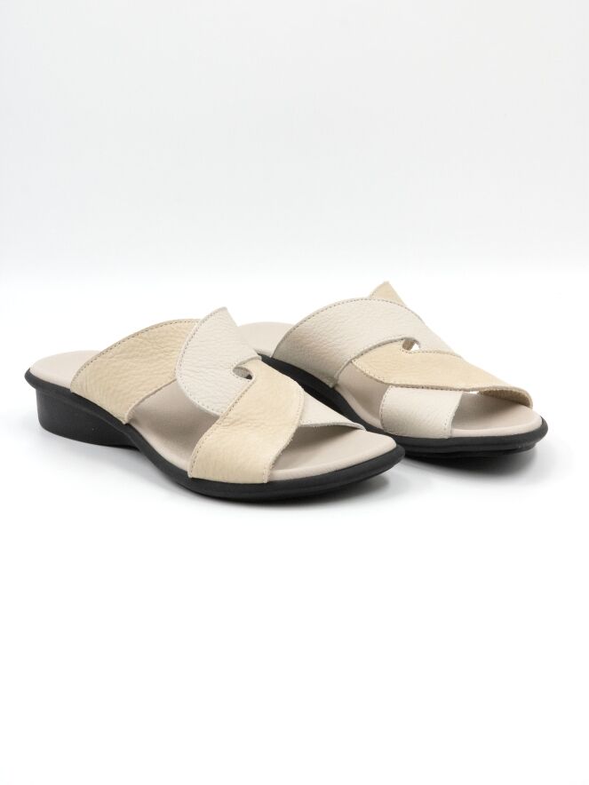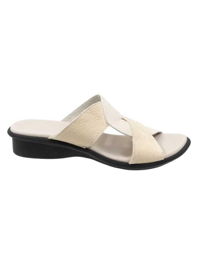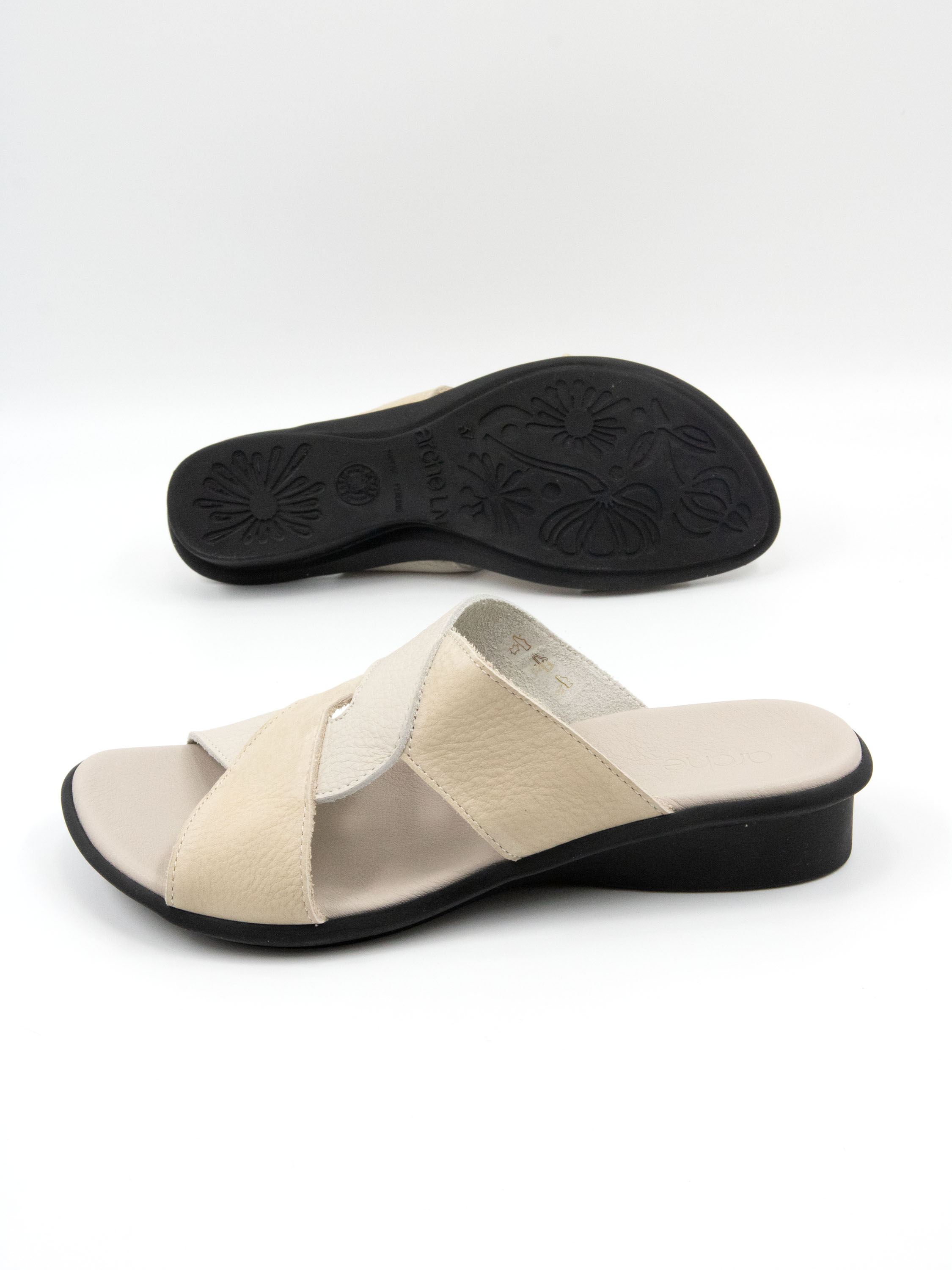 Eine offene Sandale von Arche aus weichem Leder in den Farben Cremeweiß und Mozzarella-Weiß. Die schwarze Latexsohle hat einen leichten Keilabsatz. Das Lederfußbett ist in einem weichen Cremeton gehalten.