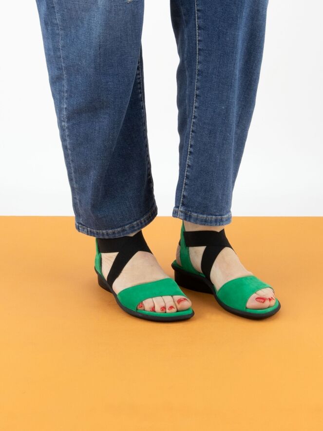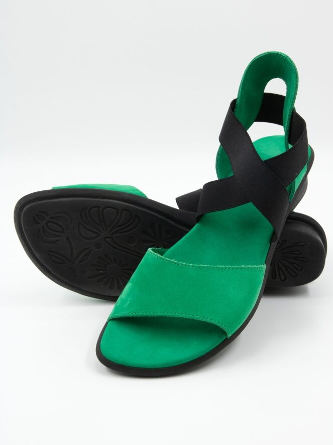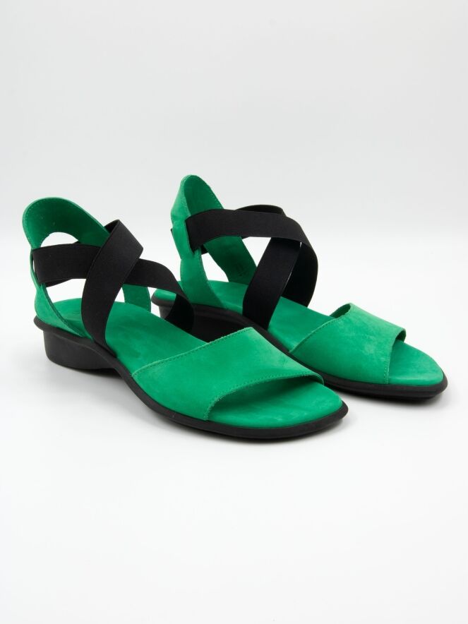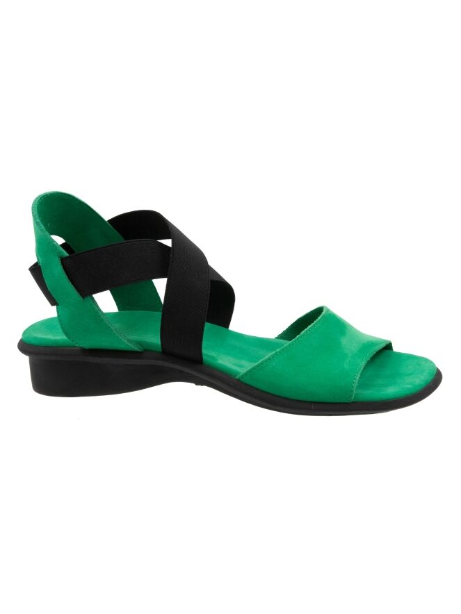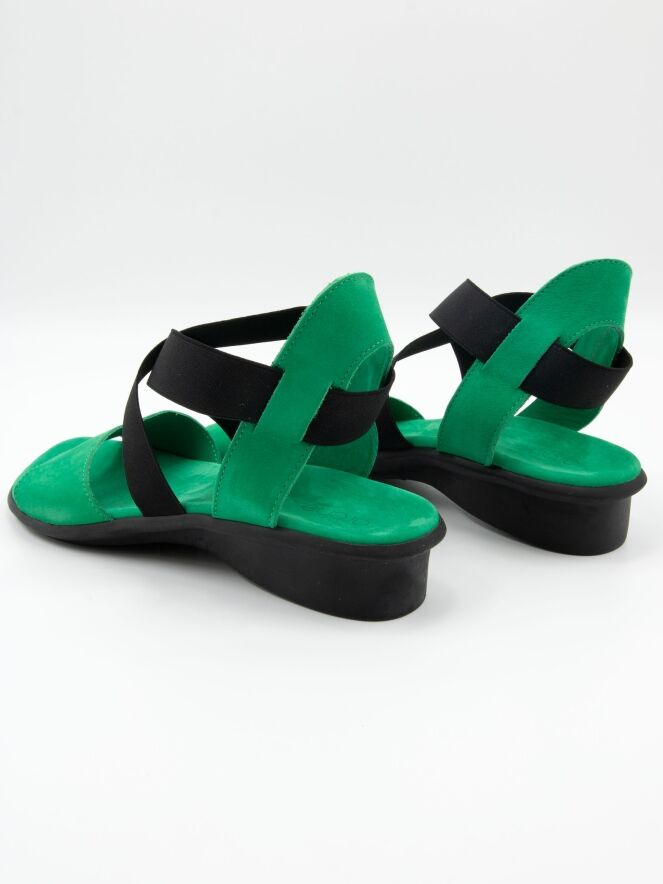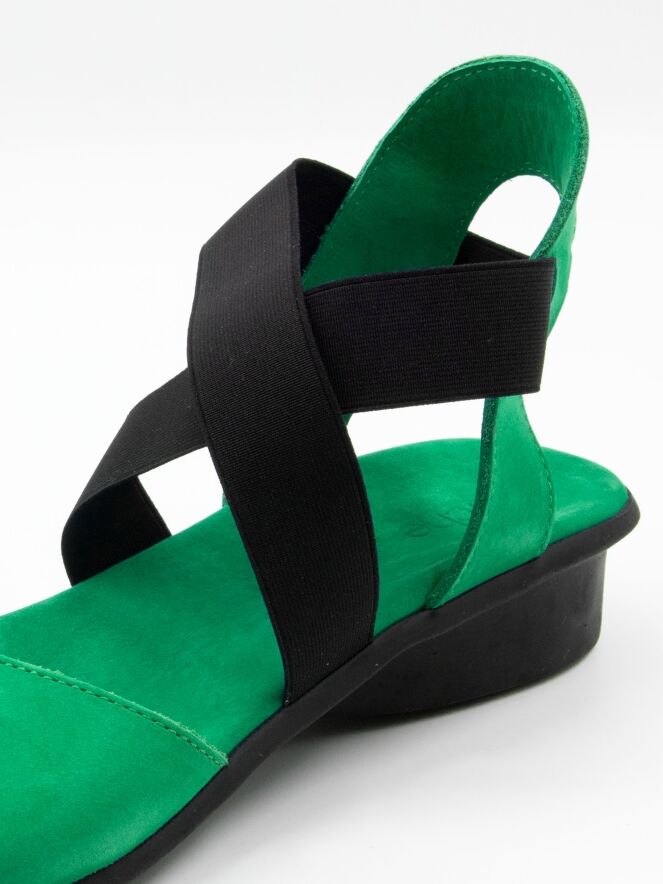 Eine offene Sandale von Arche in Grün. Ein Riemen verläuft über den Vorfuß. Von der Ferse aus zieht sich ein gekreuztes schwarzes Elastikband zu den Seiten der Sandale.