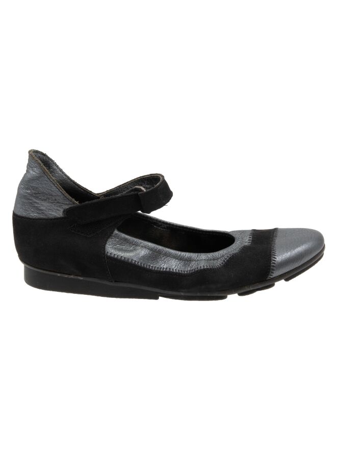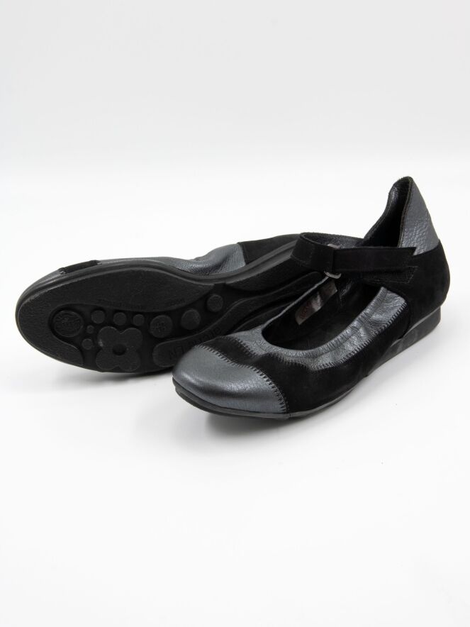 Ballerina von Arche in Metallic-Anthrazit. Über den Vorderfuß und entlang der Seiten verläuft eine schwarze Paspel aus Nubukleder. Ein verstellbarer Riemen mit Klettverschluss liegt über dem Vorderfuß.
