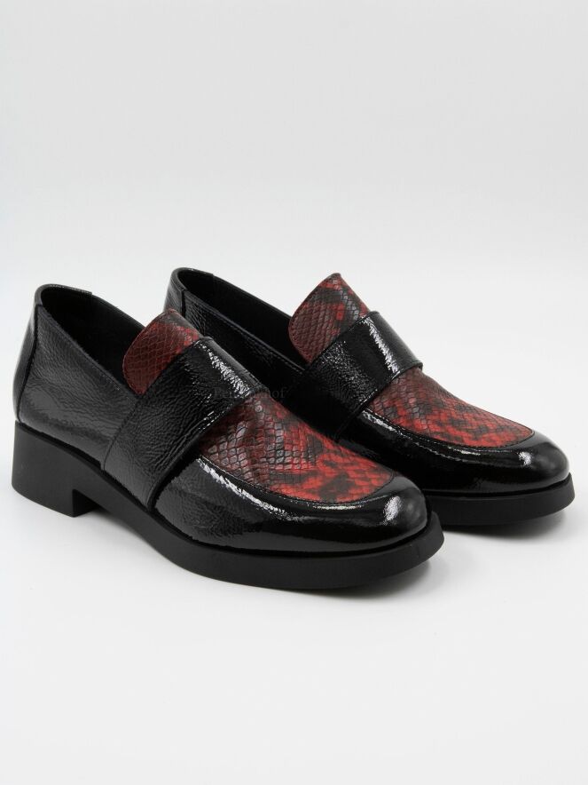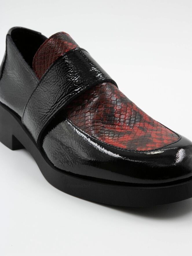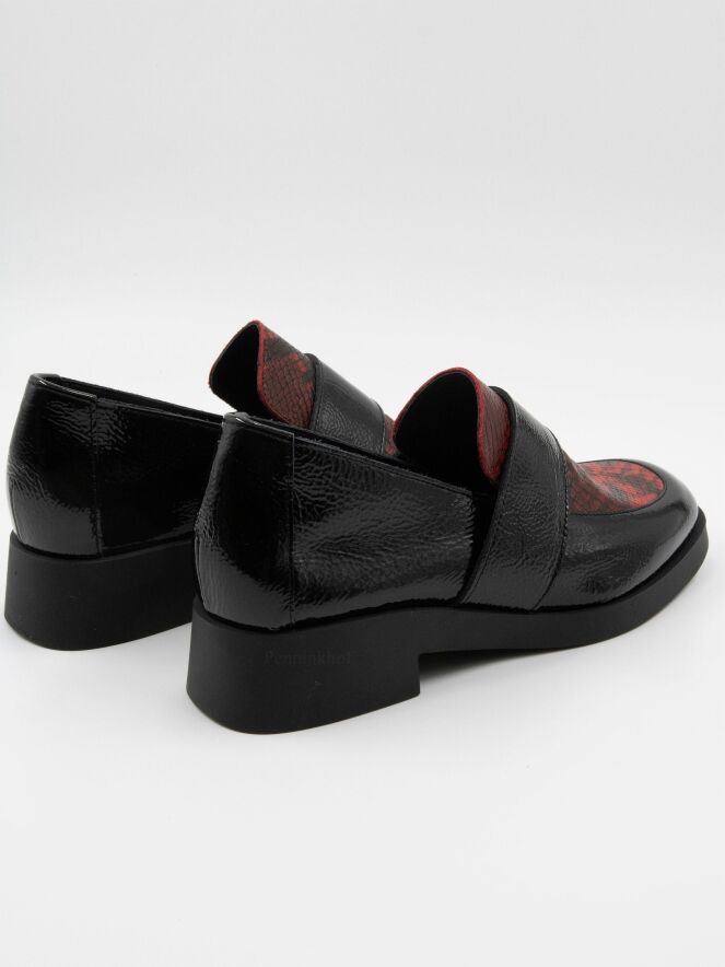 Ein Halbschuh mit kurzem Absatz von Arche aus schwarzem Lackleder. Der Vorfuß und die Zunge des Schuhs sind mit einem roten Reptilprint versehen. Über den Vorderfuß verläuft ein schwarzer Lacklederriemen.