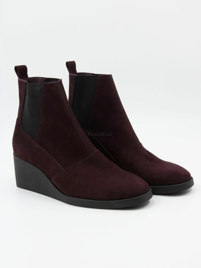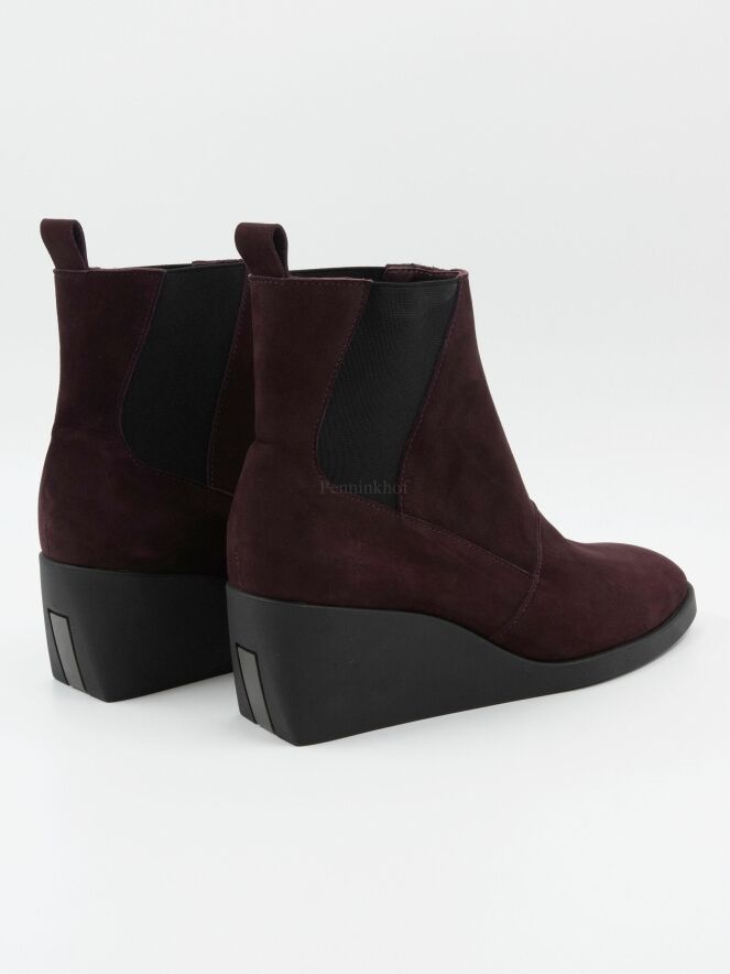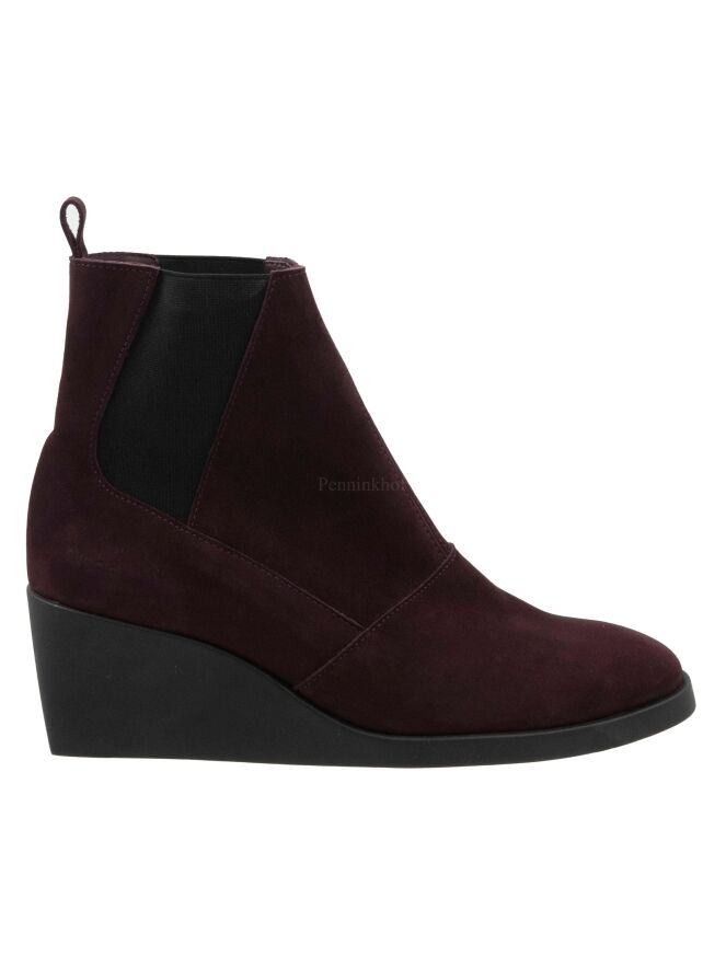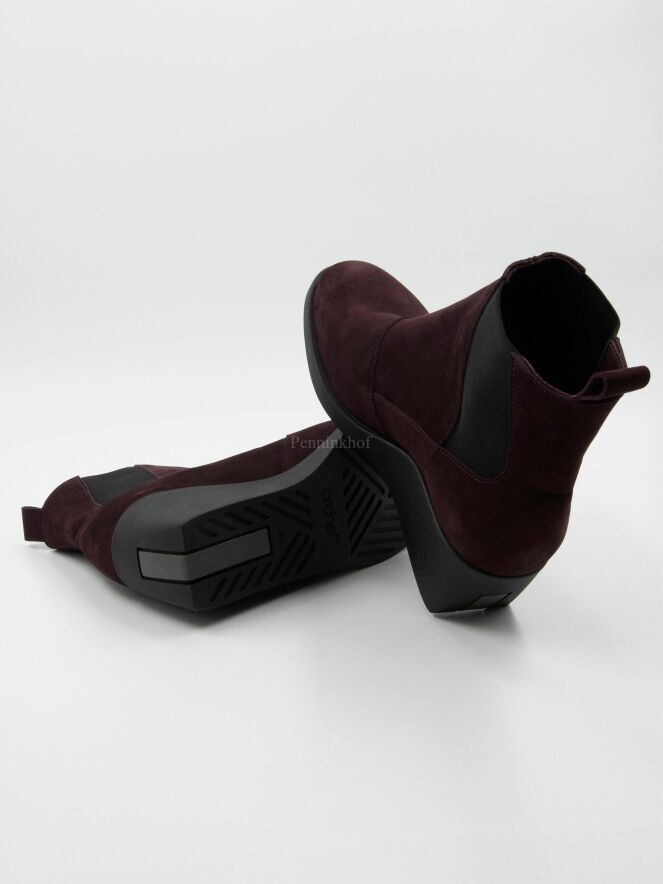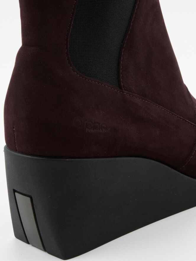 Ein kurzes Stiefeletten von Arche auf einem Keilabsatz in Bordeauxrot. Das Stiefeletten hat dekorative Nähte und an den Seiten des Schafts sind elastische Einsätze eingearbeitet. Das Innere ist ungefüttert.