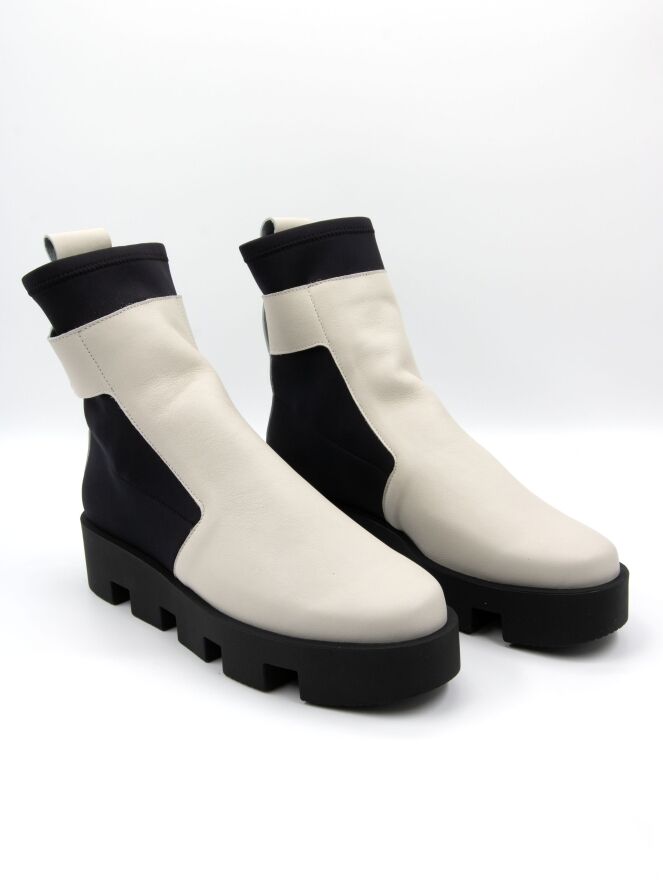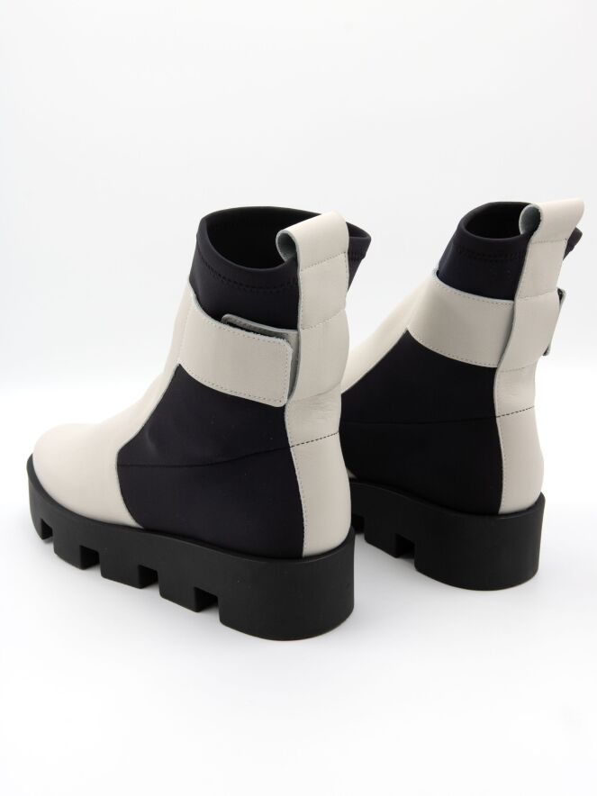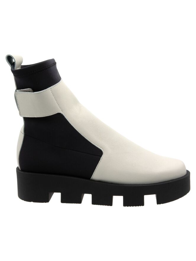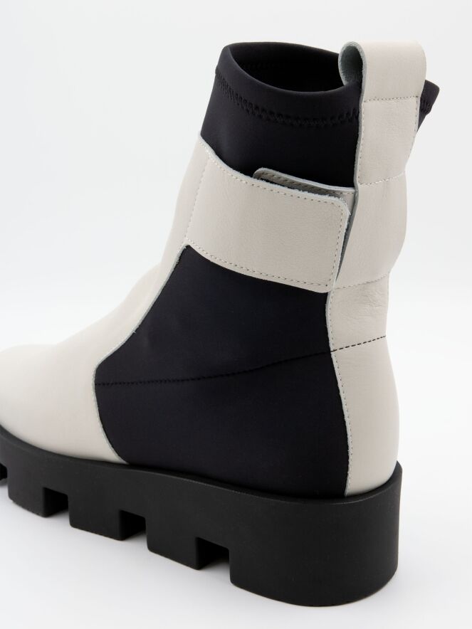 Ein knöchelhoher Stiefel von Arche in Kreideweiß. Im Schaft befindet sich ein schwarzer elastischer Sockeneinsatz, vorne und hinten mit Leder bezogen, mit einem breiten, per Klettverschluss verstellbaren Riemen um den Knöchel. Die Sohle ist grob profiliert.