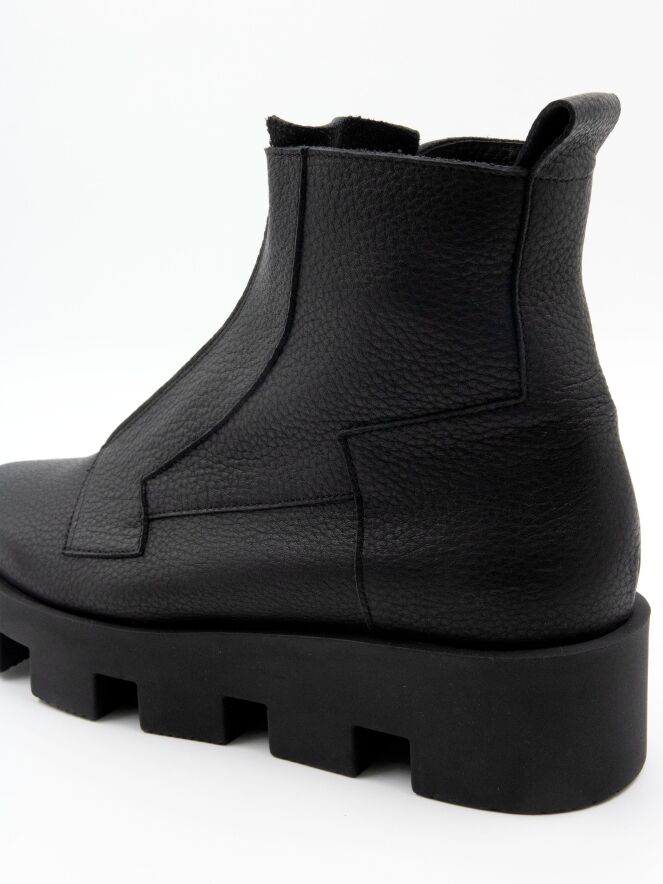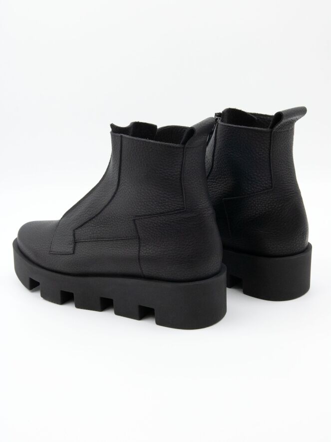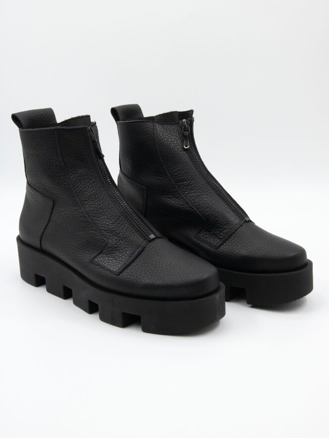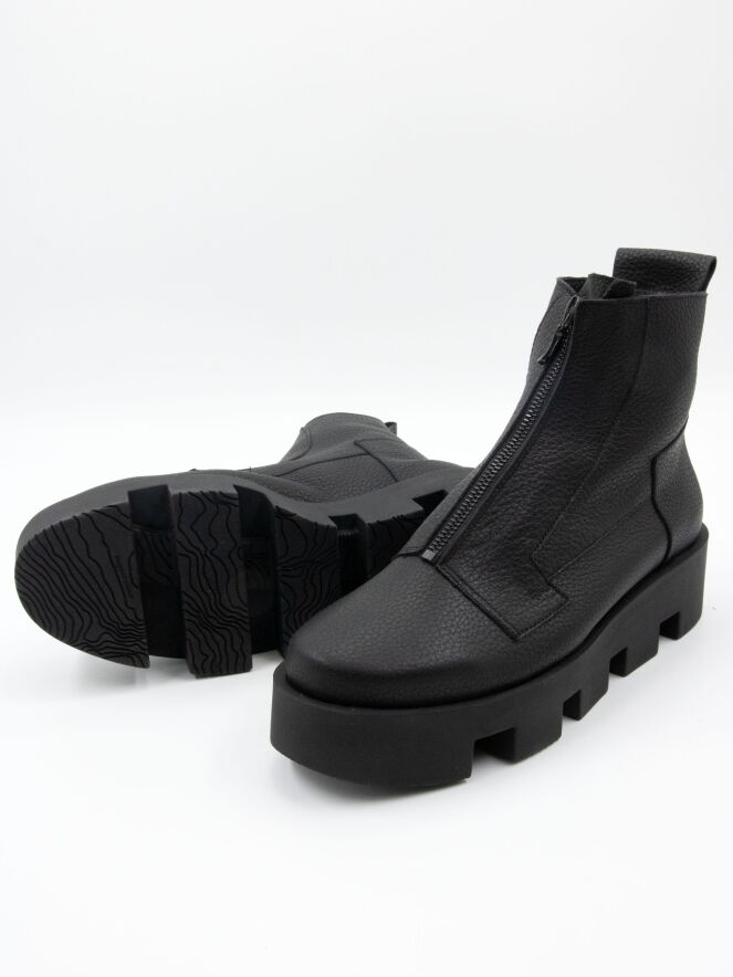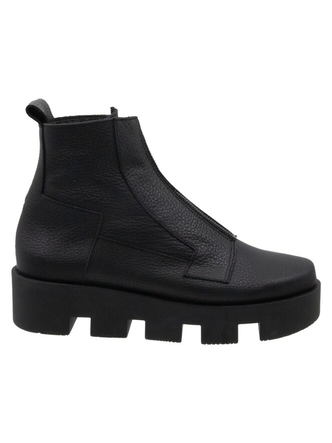Ein Stiefelette von Arche in schwarzer Farbe. Über dem Vorfuß befindet sich ein schwarzer Reißverschluss. An mehreren Stellen sind dekorative Nähte angebracht. Die Latexsohle hat ein blockiges Profil. Das Innere ist ungefüttert.