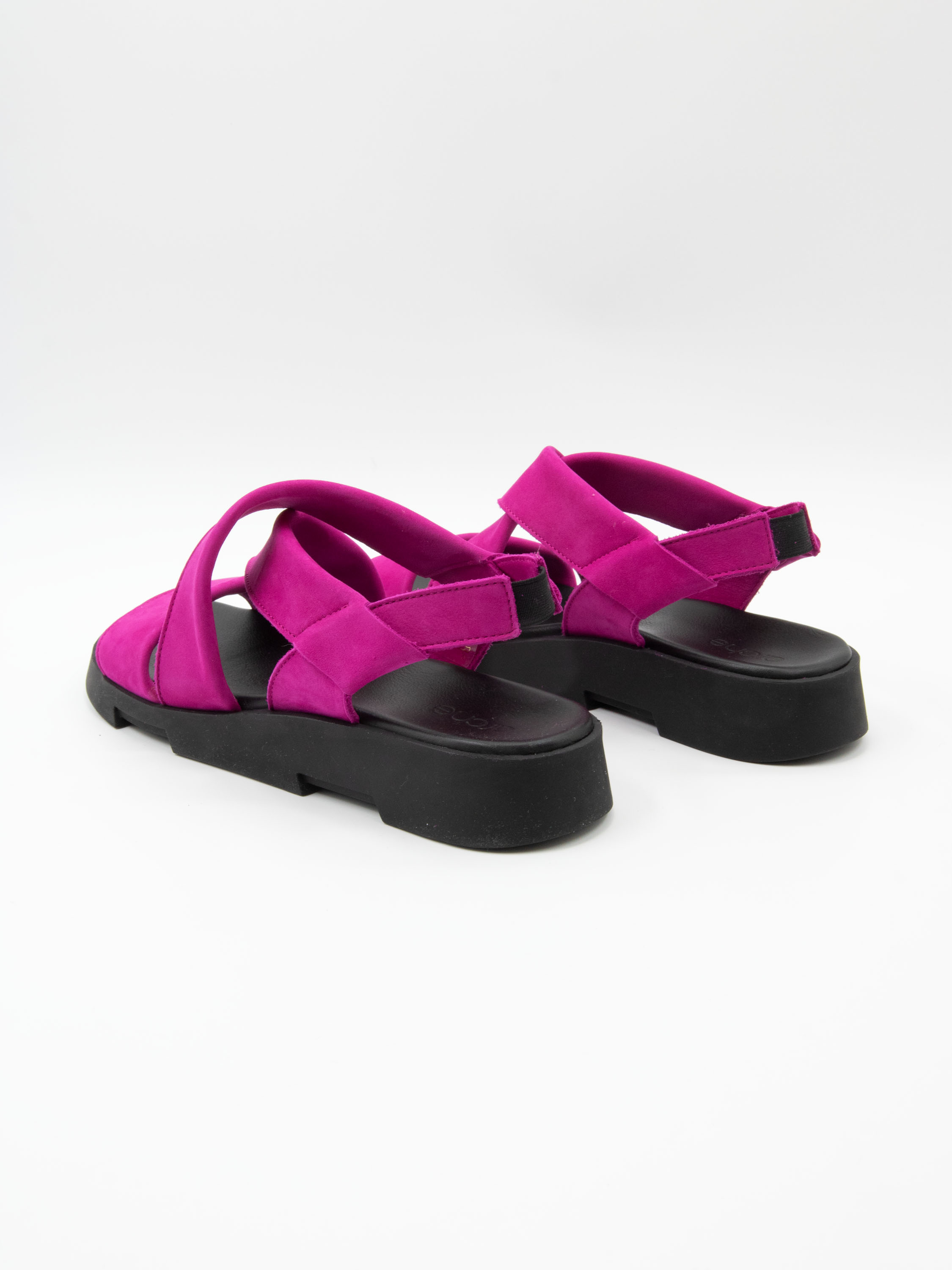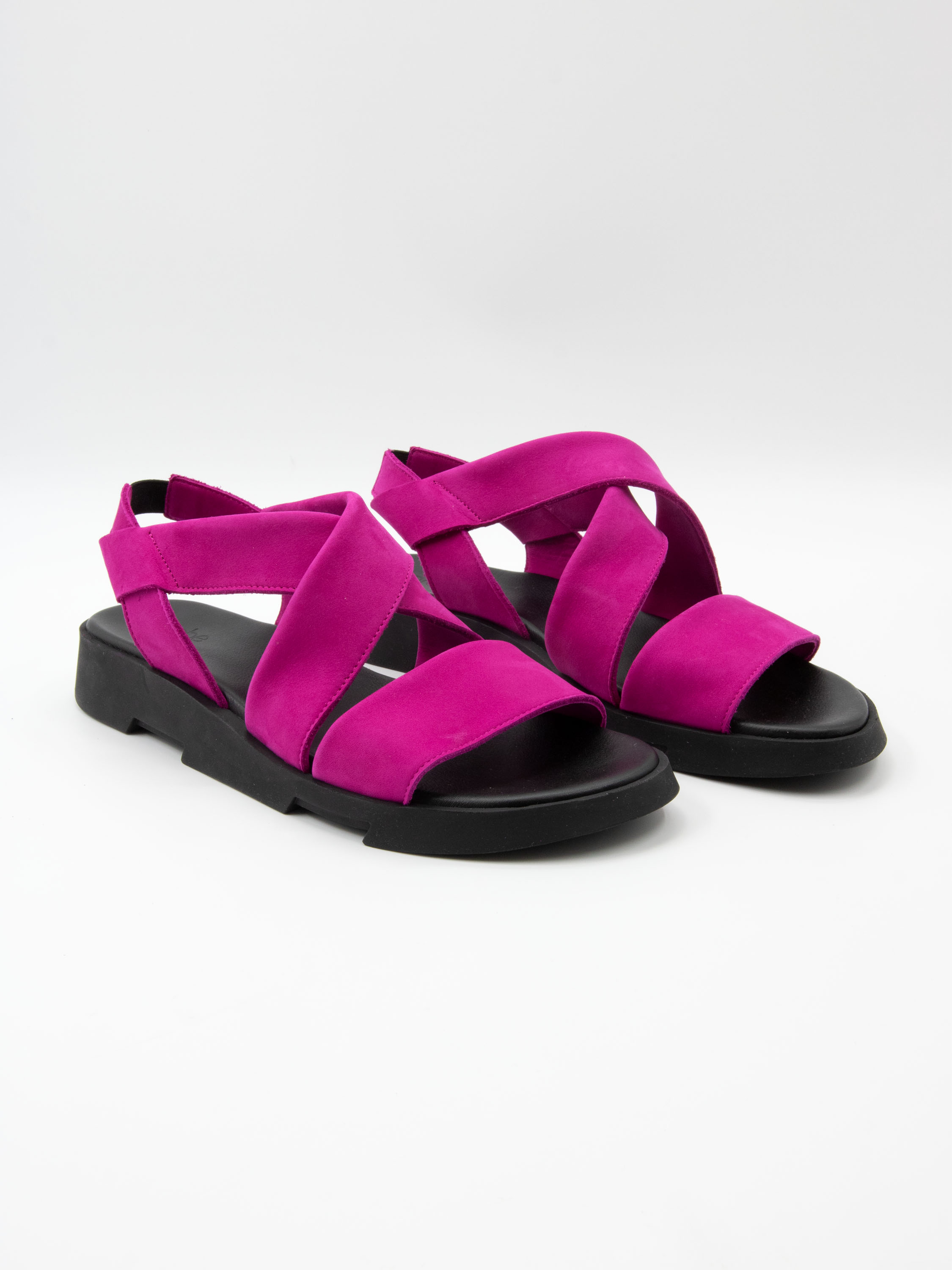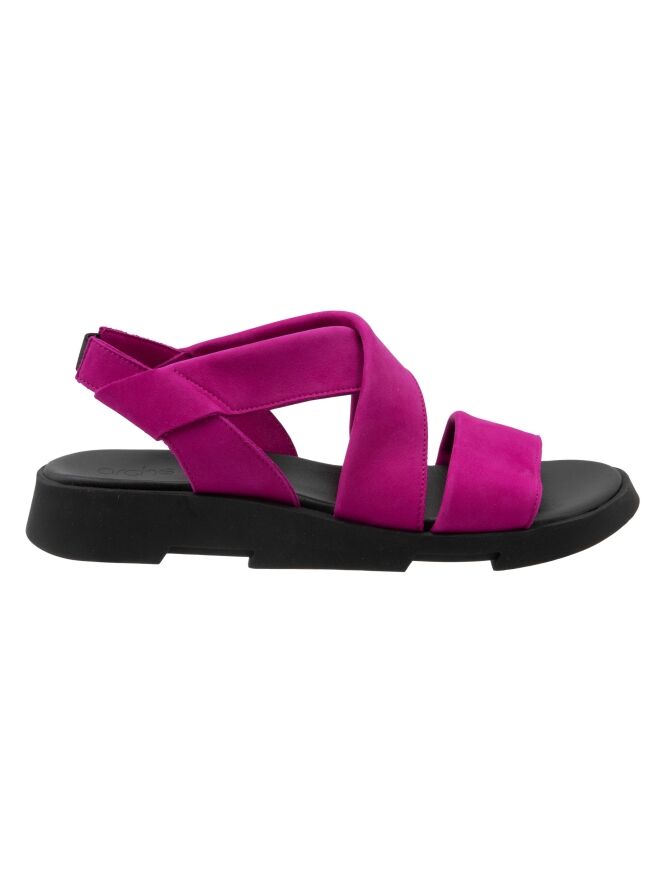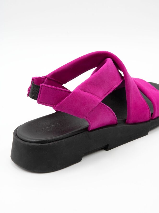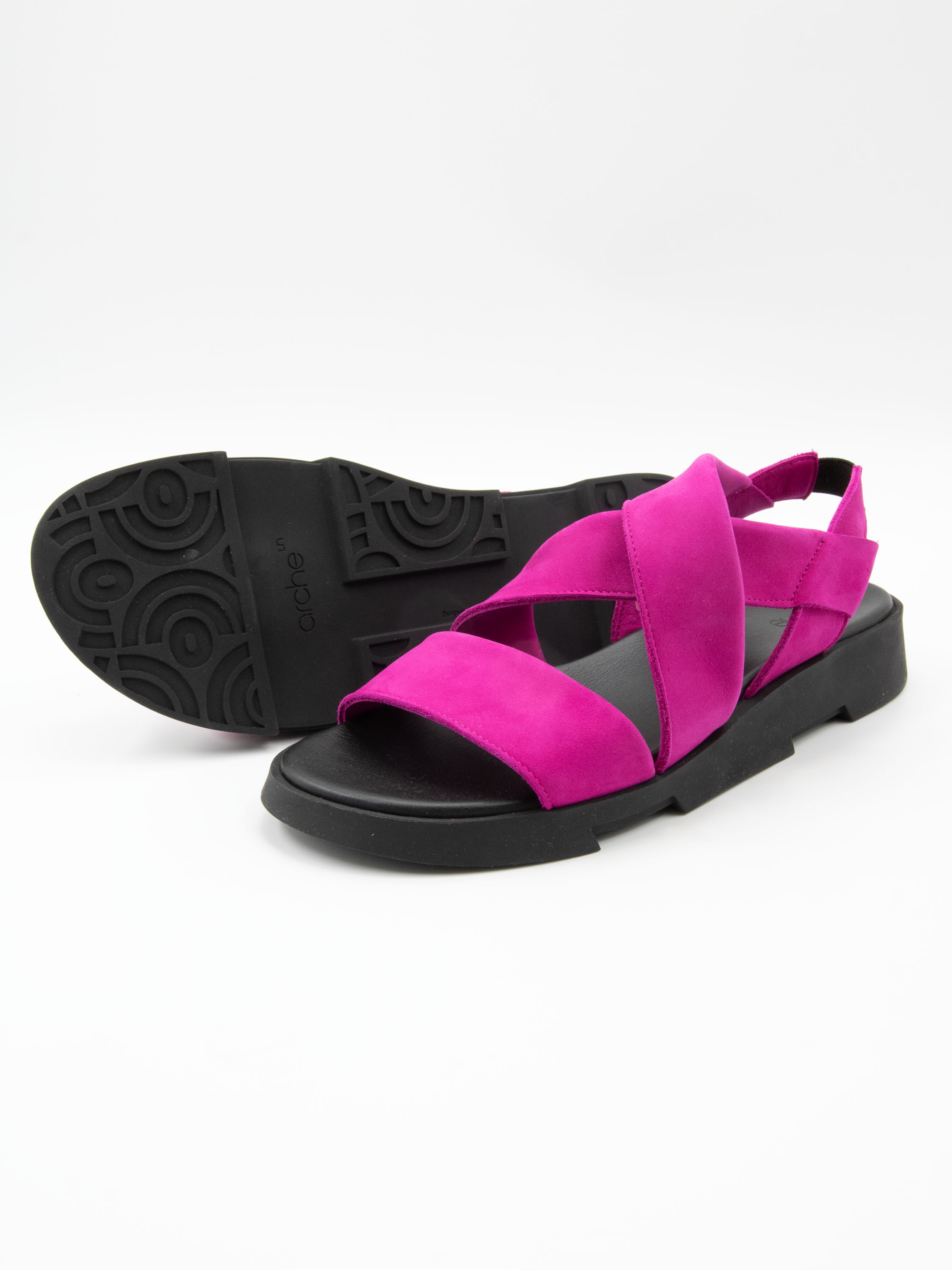 Eine Sandale von Arche in einem leuchtenden Fuchsiaton. Über dem Vorfuß verläuft ein breiter Riemen, ergänzt durch einen gekreuzten Riemen über dem Spann, der für einen sicheren und eleganten Sitz sorgt. Ein elastisches Fersenband erleichtert das Anziehen und bietet zusätzlichen Komfort.
