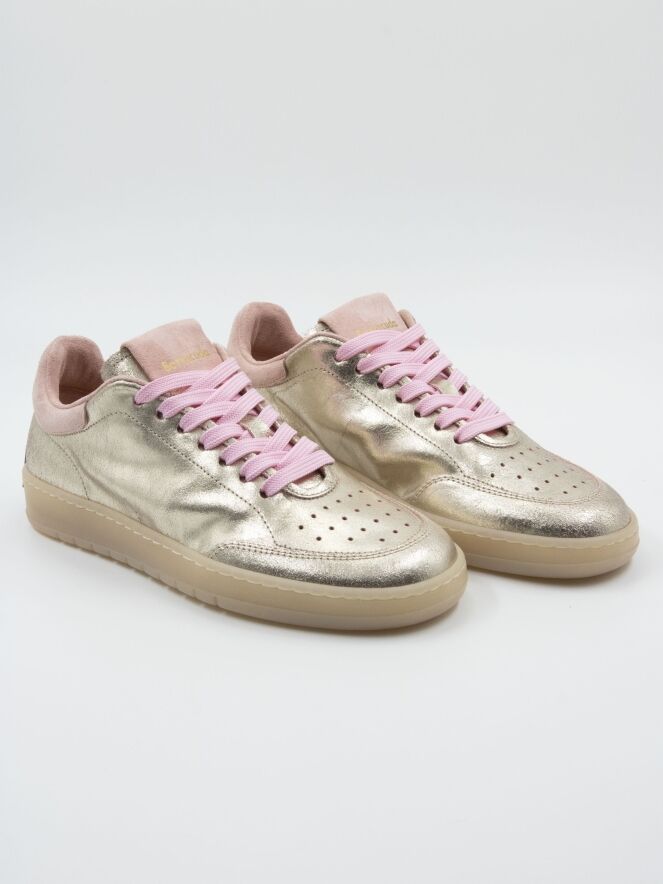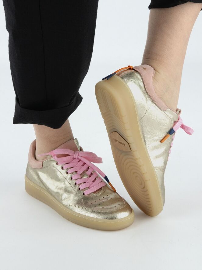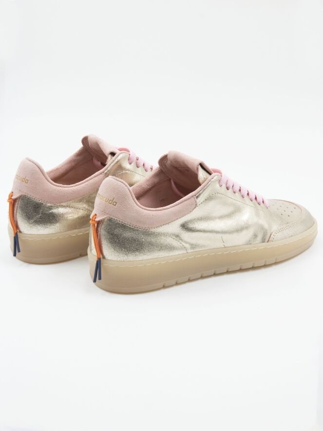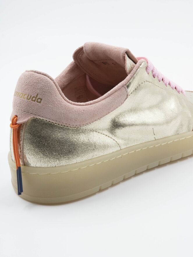 Ein Sneaker von Barracuda in der Farbe Platin. Die Sohle des Sneakers hat eine neutrale Farbe. Am Vorfuß ist das Leder perforiert. Der Schaftrand und die Zunge mit den Schnürsenkeln sind in einem pastellfarbenen Rosa gehalten. Der Sneaker ist auf der Innenseite mit Leder gefüttert.
