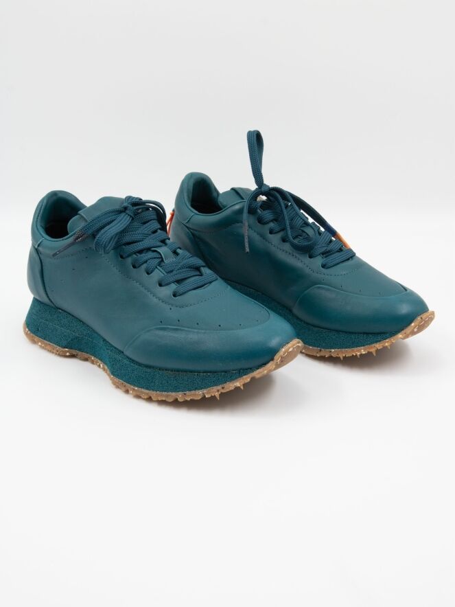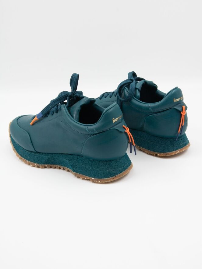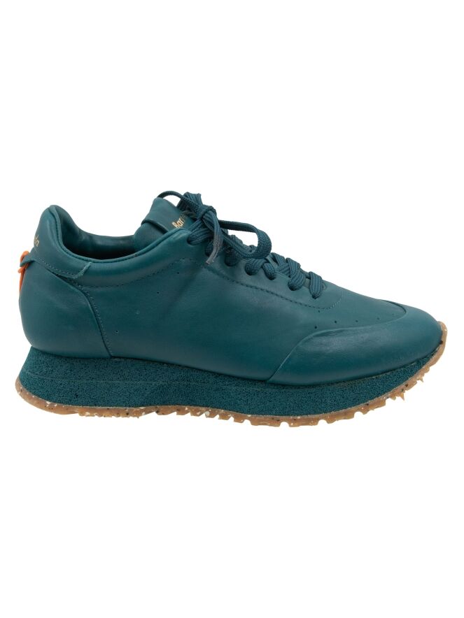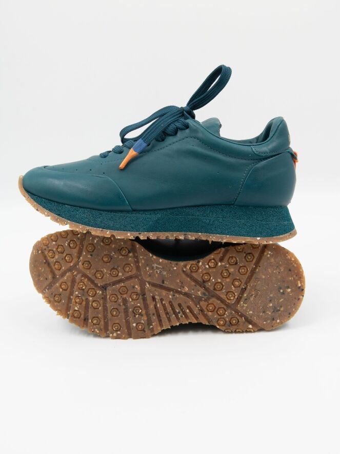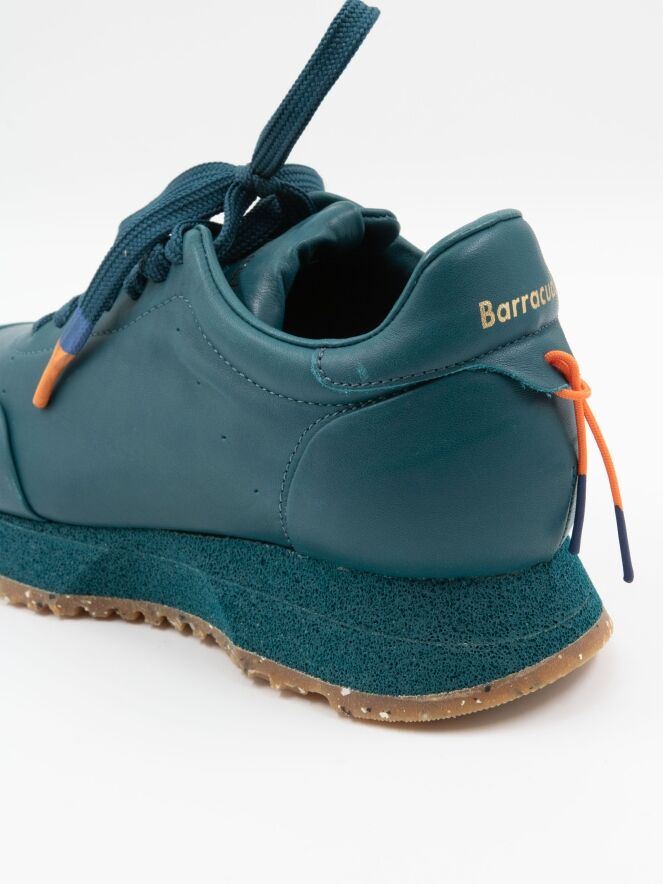 Ein Sneaker von Barracuda in Petrolblau. Der Sneaker hat eine sportliche, überstehende recycelte Sohle mit einem Sprenkelmuster in der unteren Schicht. Die Innensohle ist herausnehmbar, das Innere ist mit Leder gefüttert.