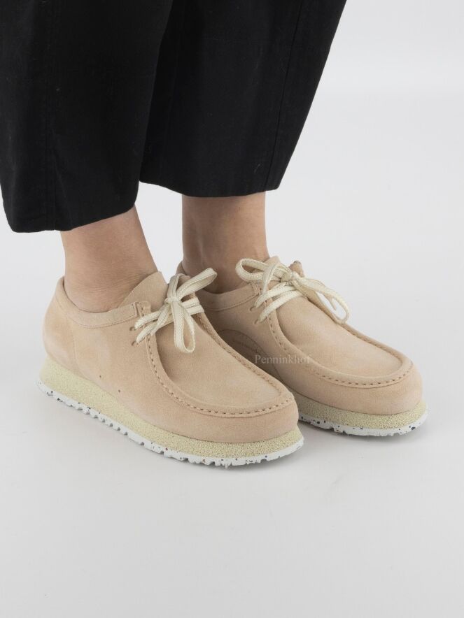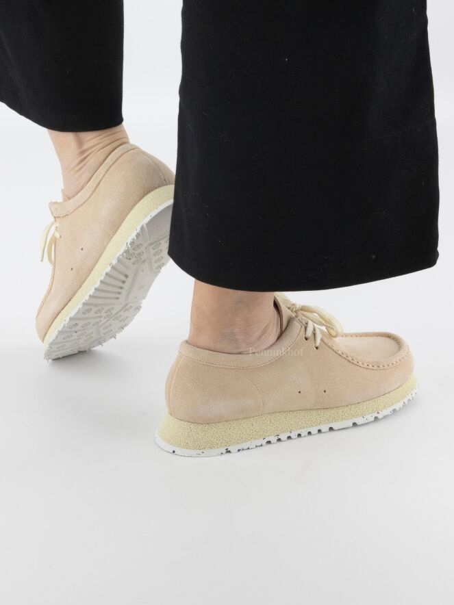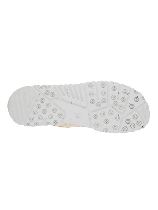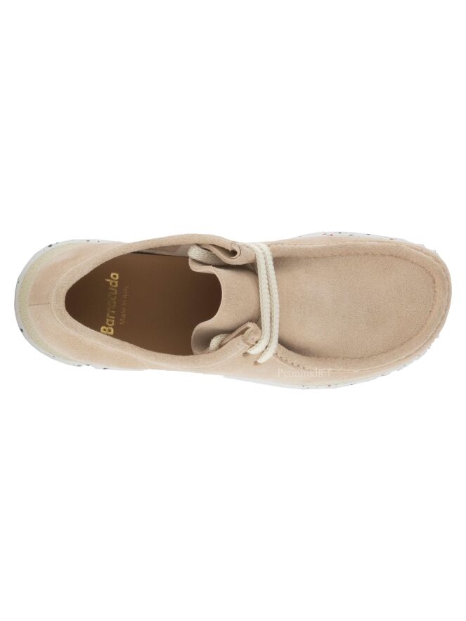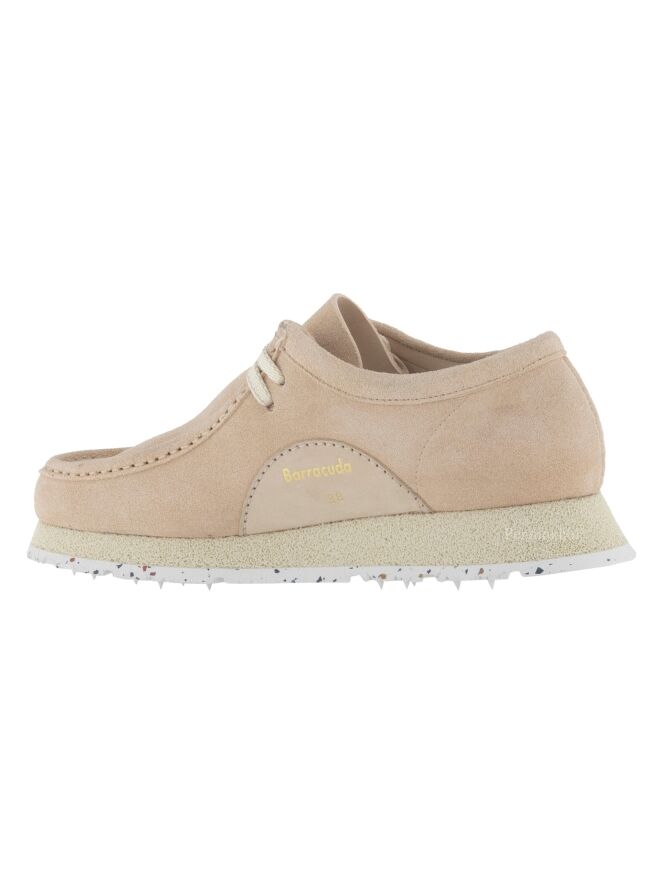 Ein Slipper der Schuhmarke Barracuda mit Schnürsenkeln in zartem Rosa. Die Sohle ist zweilagig aufgebaut mit einer beigen und einer cremeweißen Schicht. Die Innenseite ist mit Leder gefüttert.