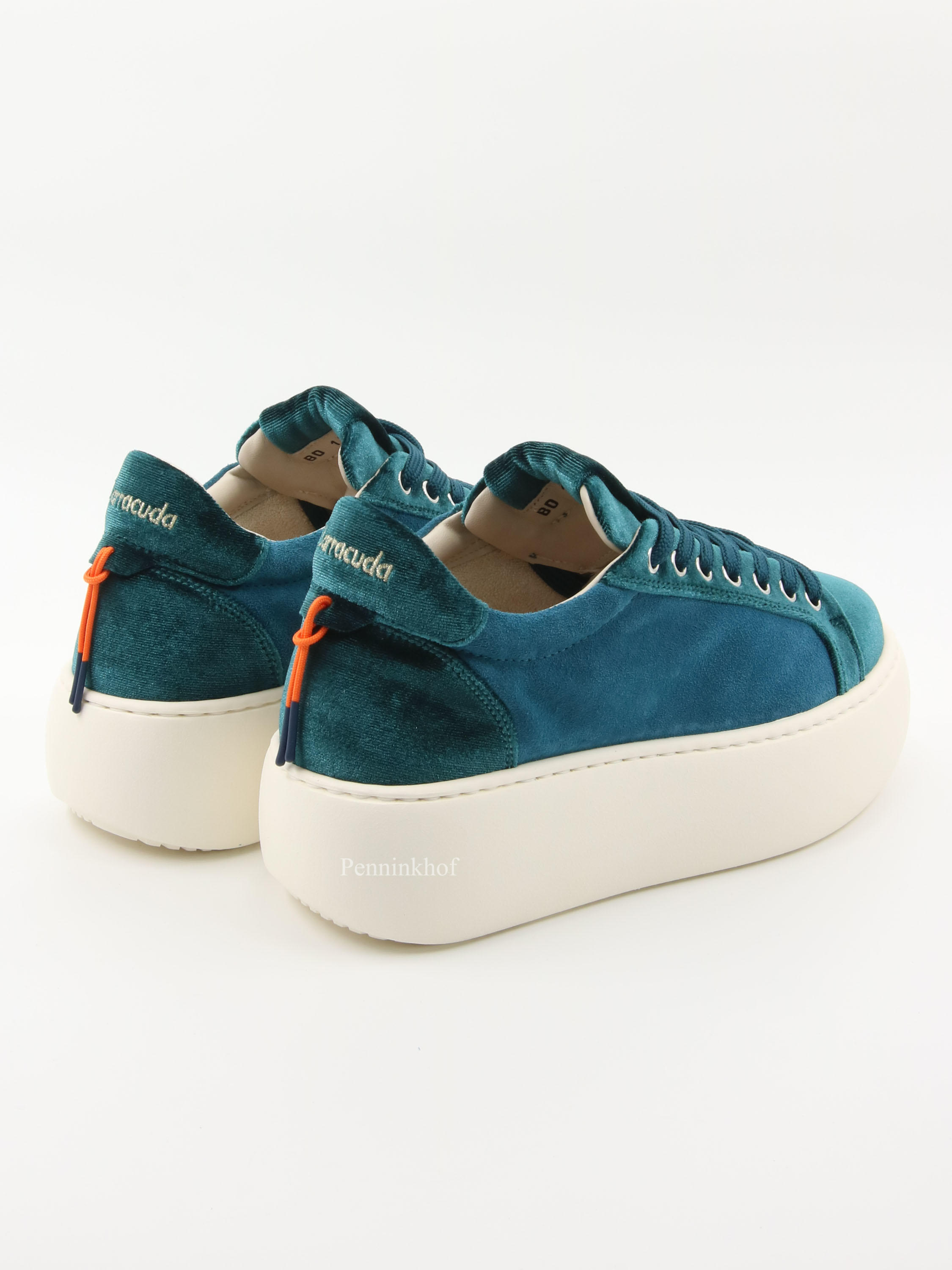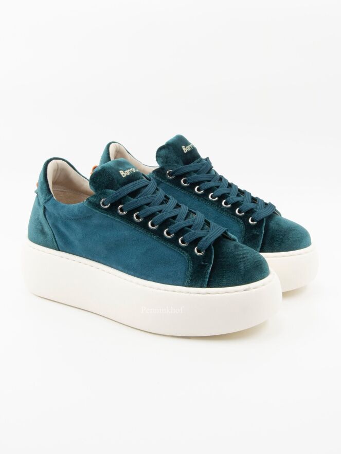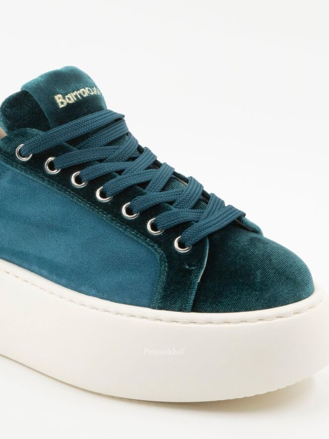 Ein luxuriöser Sneaker von Barracuda in der Farbe Petrolblau. Die Zehenkappe, die Ferse und entlang der Schnürung ist ein Samtstoff. Die Plateausohle ist in einem cremigen Weiß gehalten. Der Sneaker ist auf der Innenseite gefüttert.