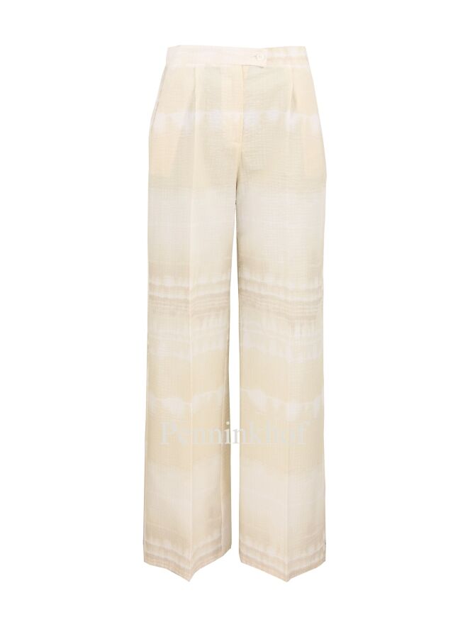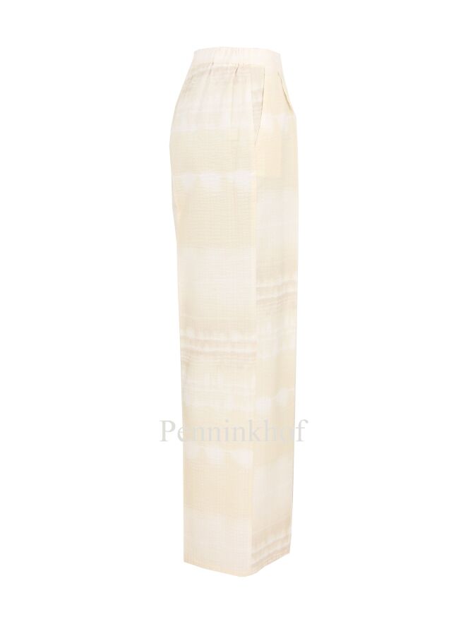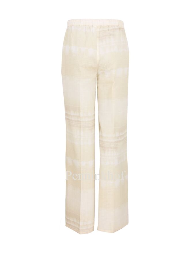 Eine Hose der Designermarke Beatrice B. mit Batik-Print in den Farben Weiß und Vanille. Der Stoff hat eine feine Waffelpiqué-Optik. Der Taillenbund ist auf der Rückseite elastisch. Die Hose hat Eingrifftaschen und kann von Hand gewaschen werden.