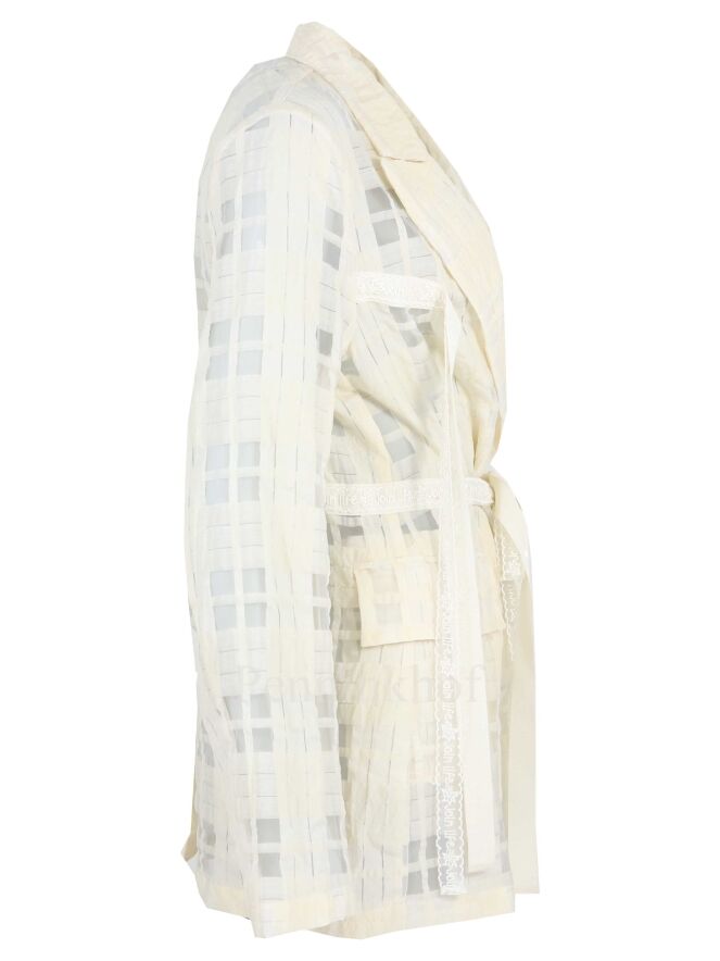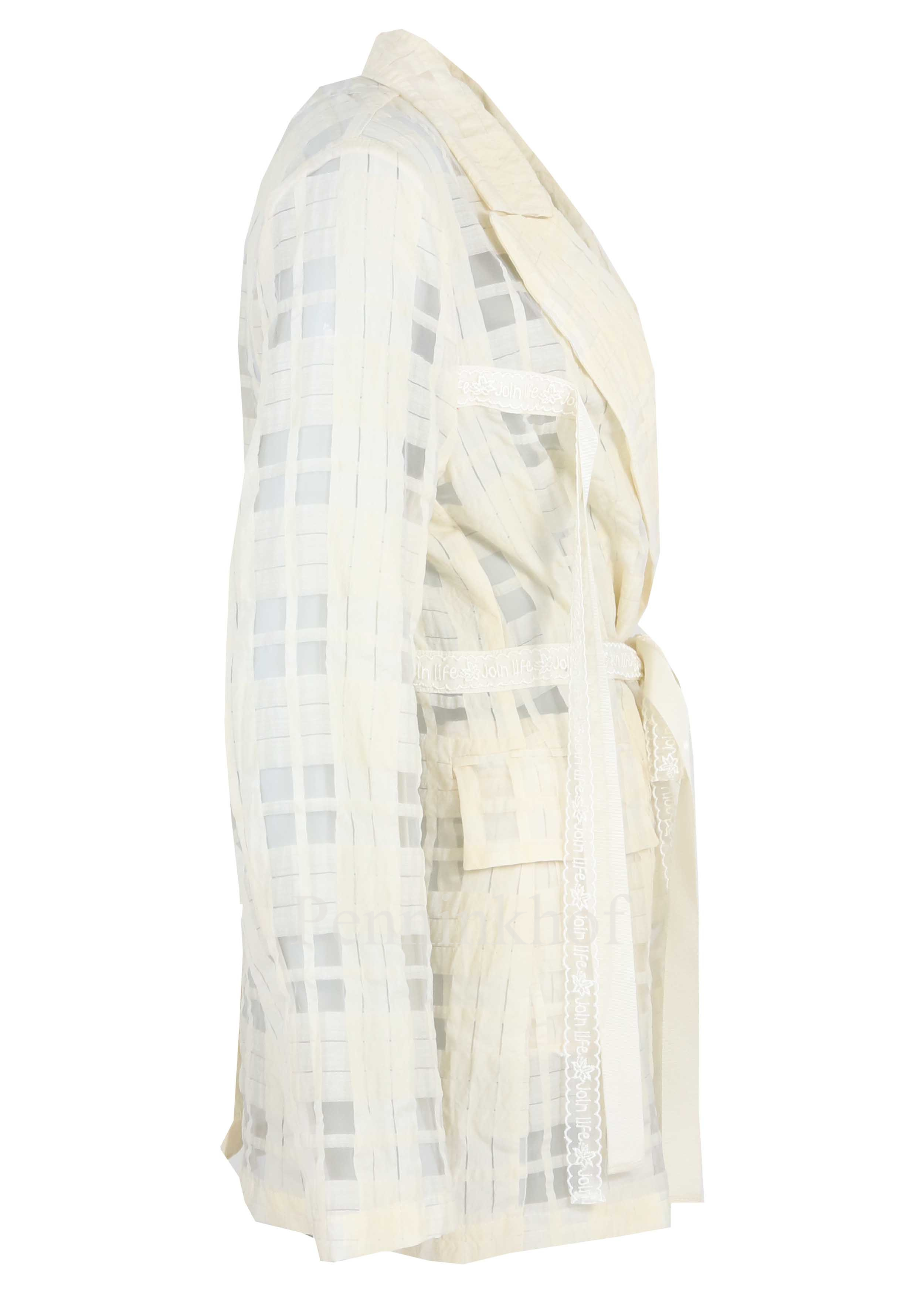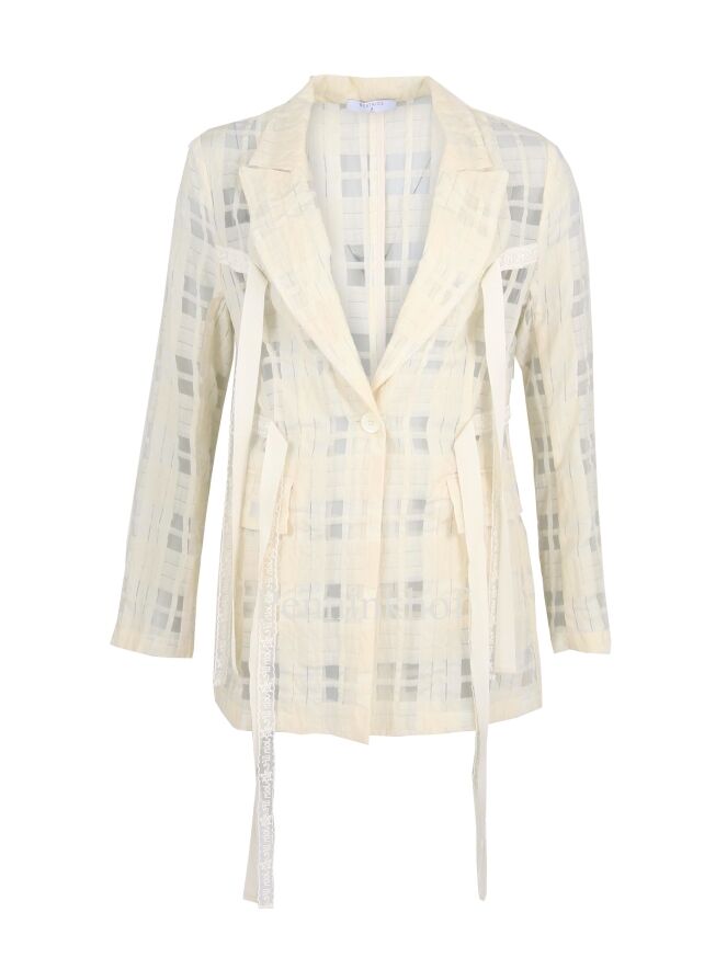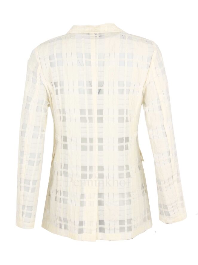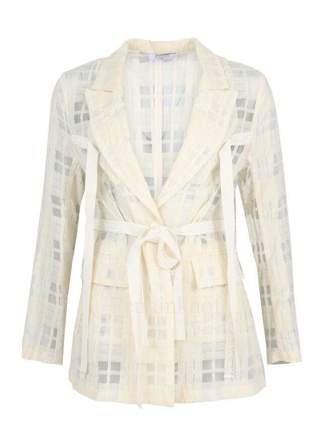 Ein transparenter Blazer der Designermarke Beatrice B. in Cremeweiß. Das Gewebe ist mit einem geflochtenen Blockmuster versehen. An der Taille und vom Ärmelansatz ausgehend befindet sich ein Doppelband. Eines dieser Bänder ist transparent und mit einem in den Stoff eingewobenen Text versehen. Der Blazer ist nicht gefüttert und kann von Hand gewaschen werden.