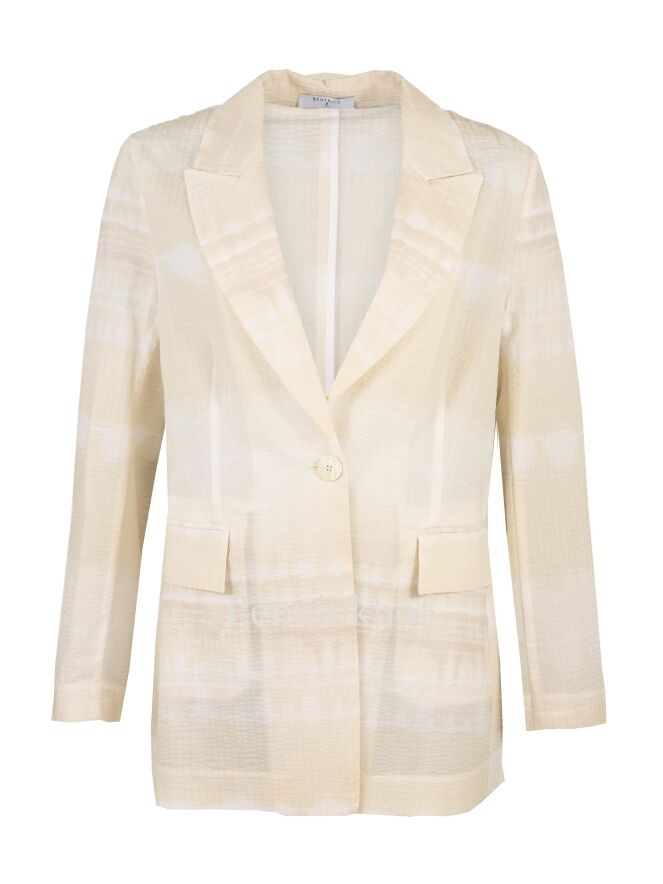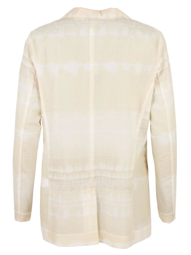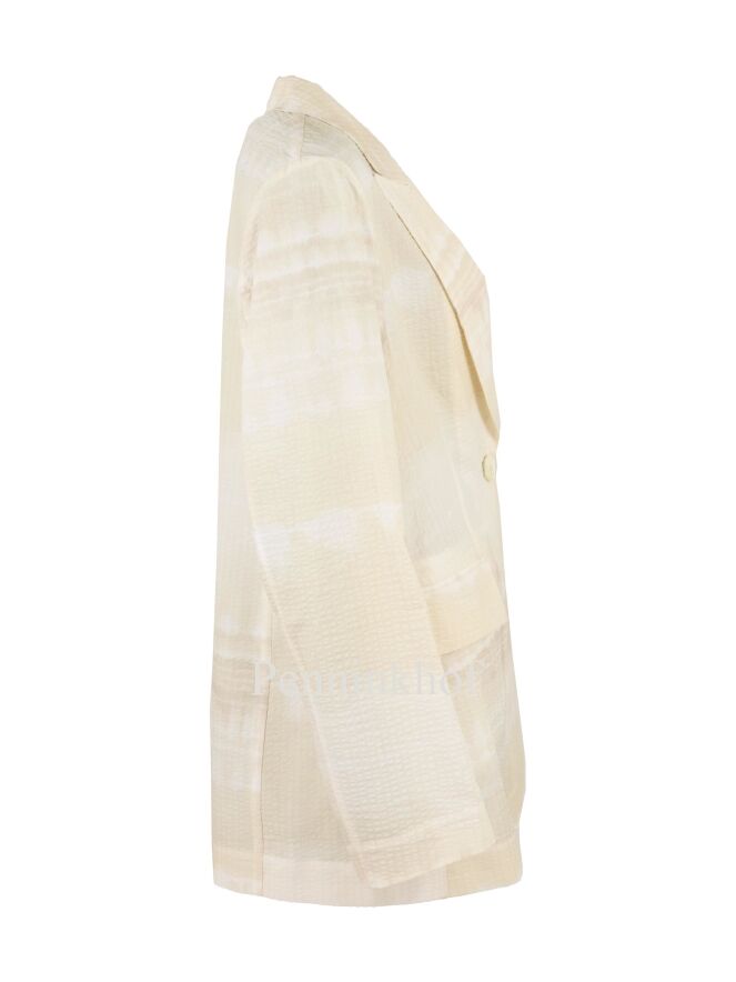 Ein ungefütterter Blazer von Beatrice B. mit Batik-Print in den Farben Weiß und Vanille. Der Stoff hat eine feine Waffelpiqué-Optik. Der Blazer wird mit einem einzelnen Knopf geschlossen und kann von Hand gewaschen werden.