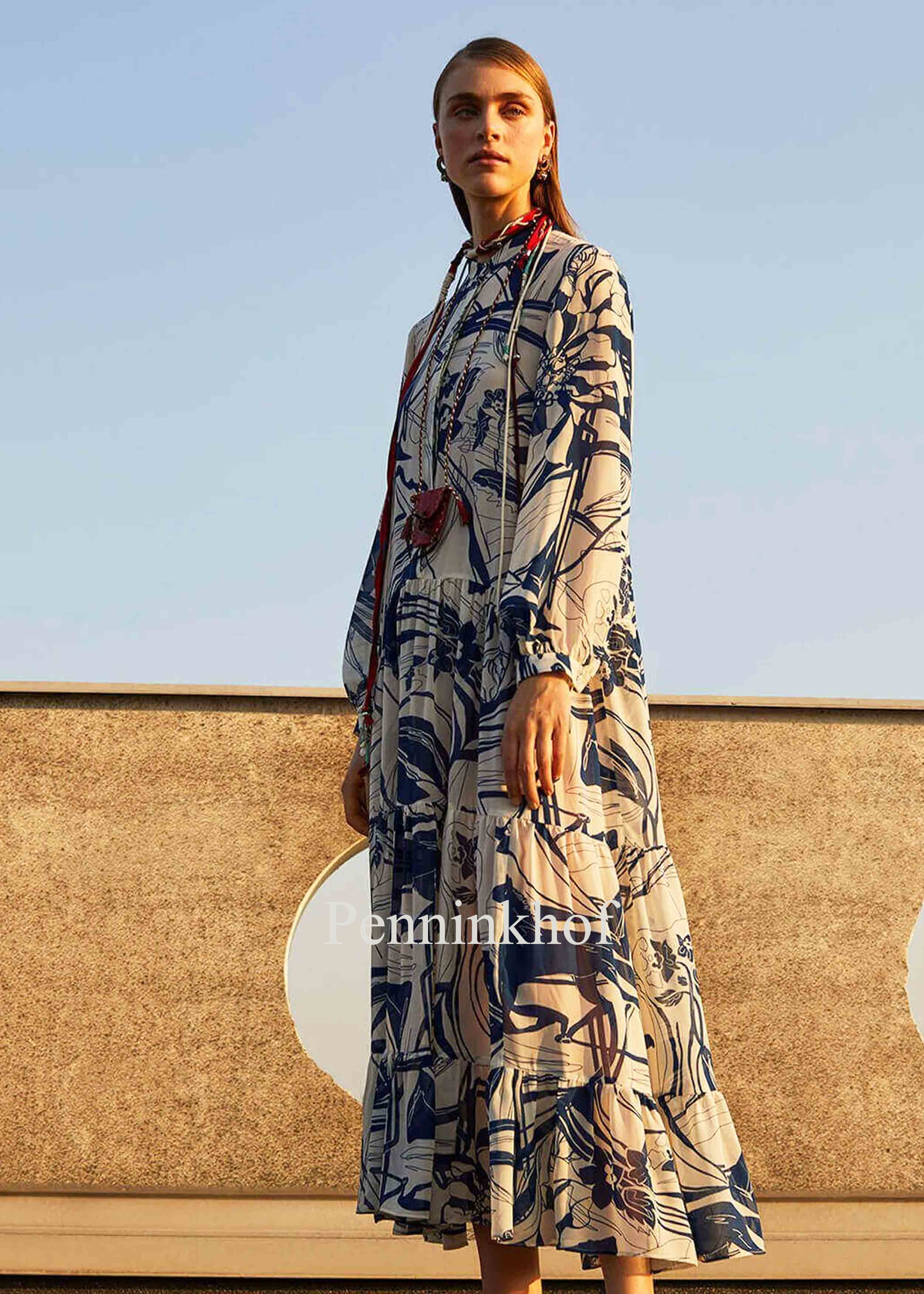 Ein Kleid der Designermode von Beatrice B. mit Grafikdruck in Blau-cremeweiß. Unterhalb der Taille und auf Kniehöhe befindet sich eine elastische Naht, wodurch das Gewebe zart gerafft ist. Der Oberstoff ist transparent, das Unterkleid ist nachtblau. Dieses Kleid kann von Hand gewaschen werden.