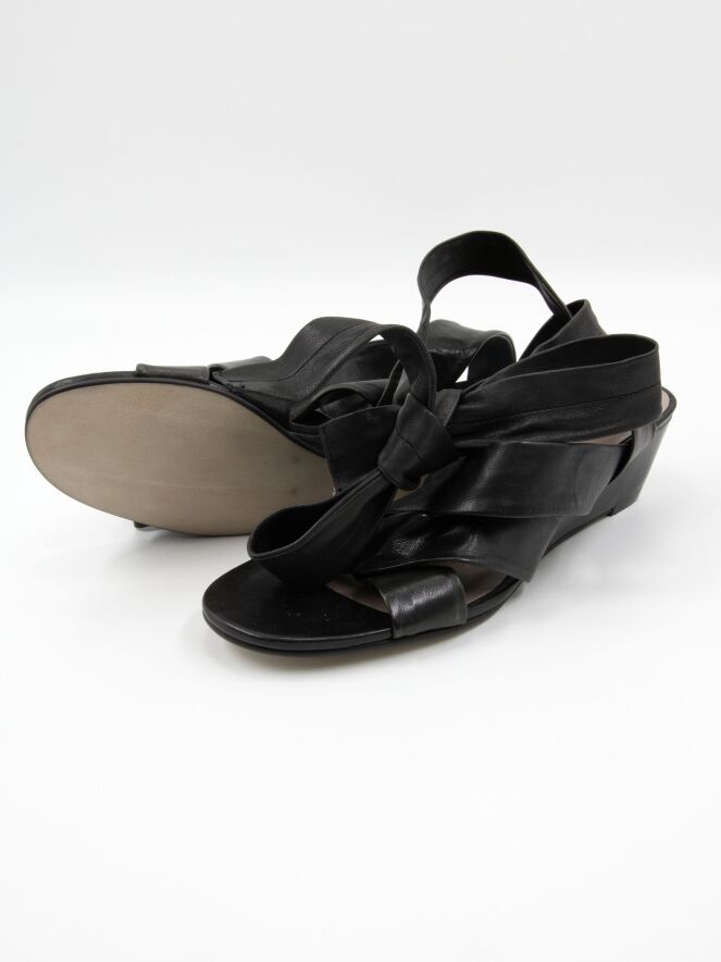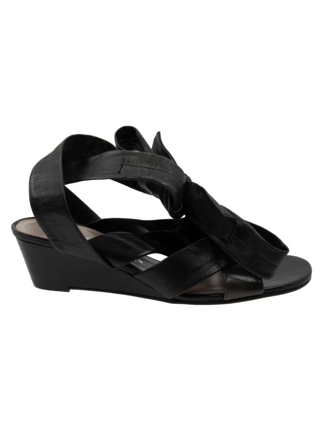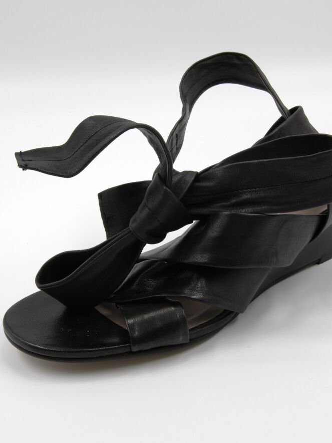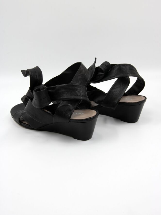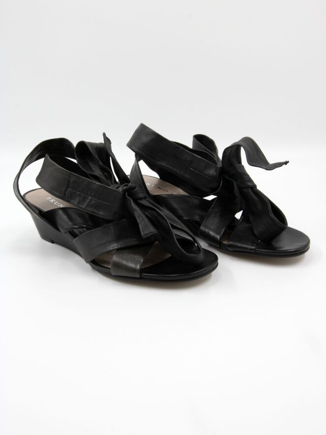 Eine Keilsandale von Bruno Premi in Schwarz. Das Leder ist über dem Vorderfuß gekreuzt. Zwei lange Lederbänder verlaufen von den Seiten des Keilabsatzes und können um den Knöchel gewickelt werden.