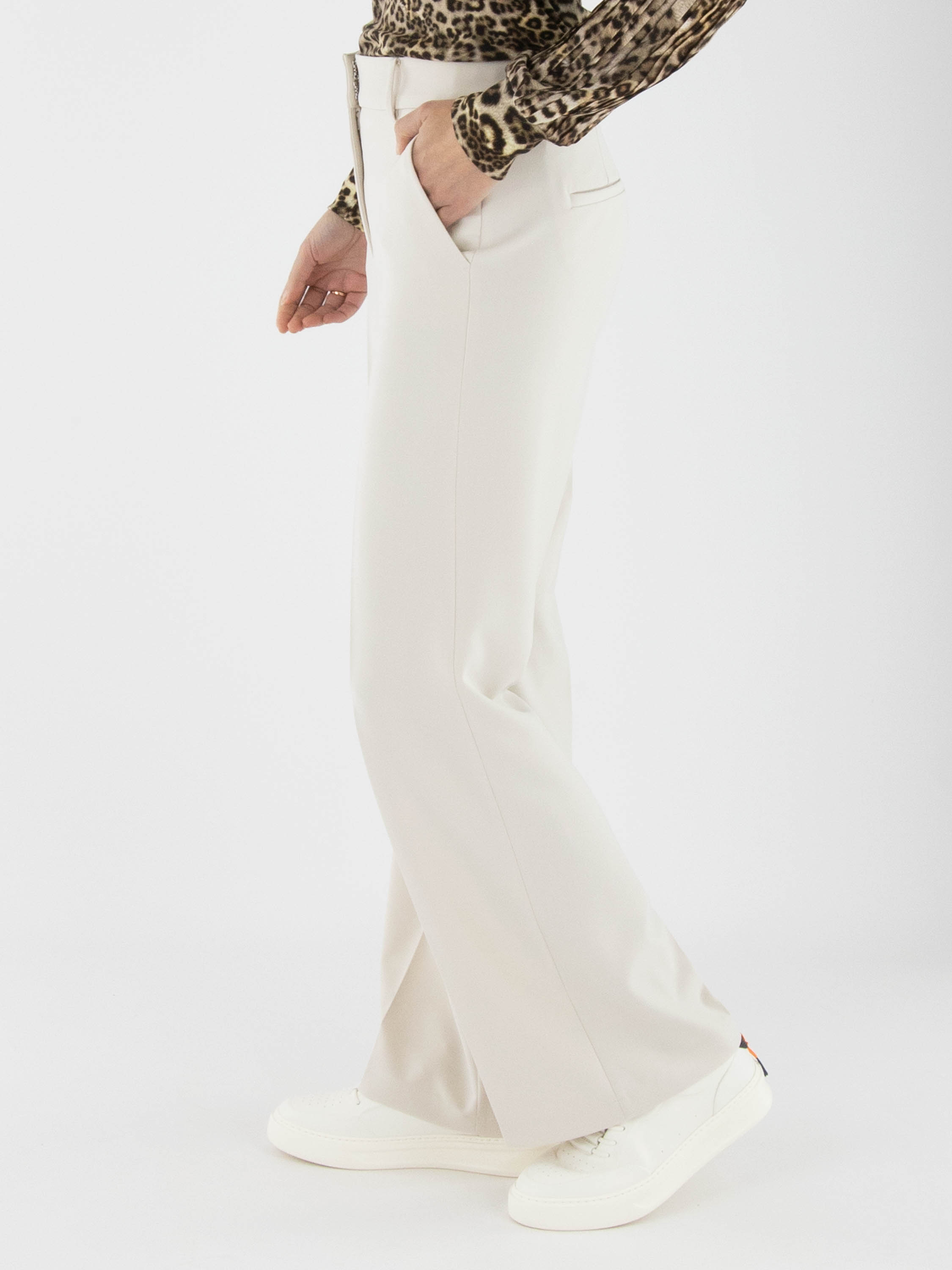 Eine luxuriöse, gerade geschnittene Hose von Cambio in Cremeweiß. In der Mitte der Beine verläuft eine eingepresste Falte. Die Hose hat Seitentaschen und sollte von Hand gewaschen werden.