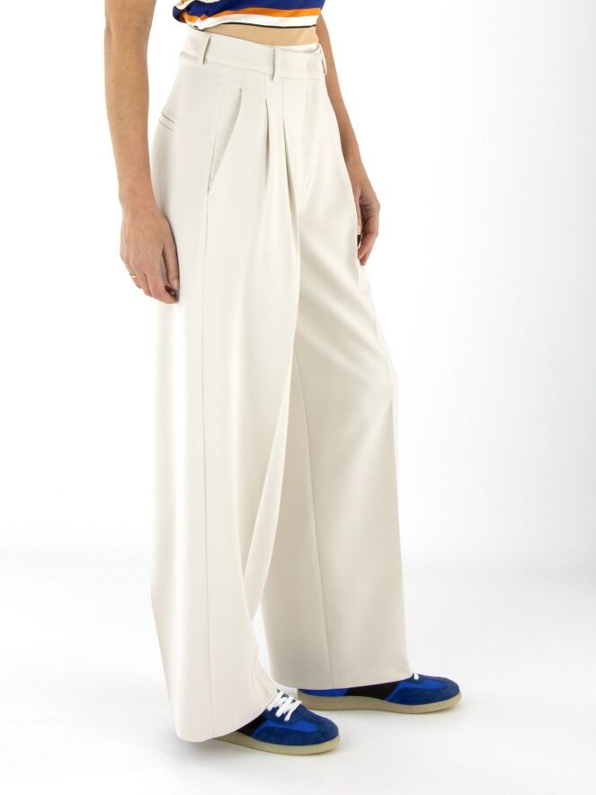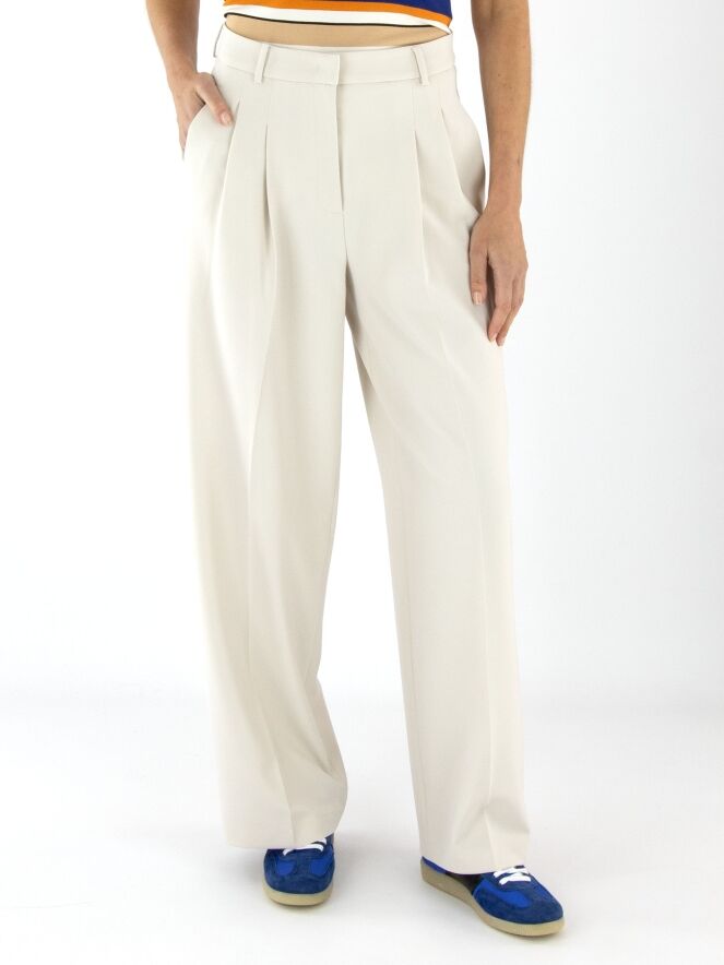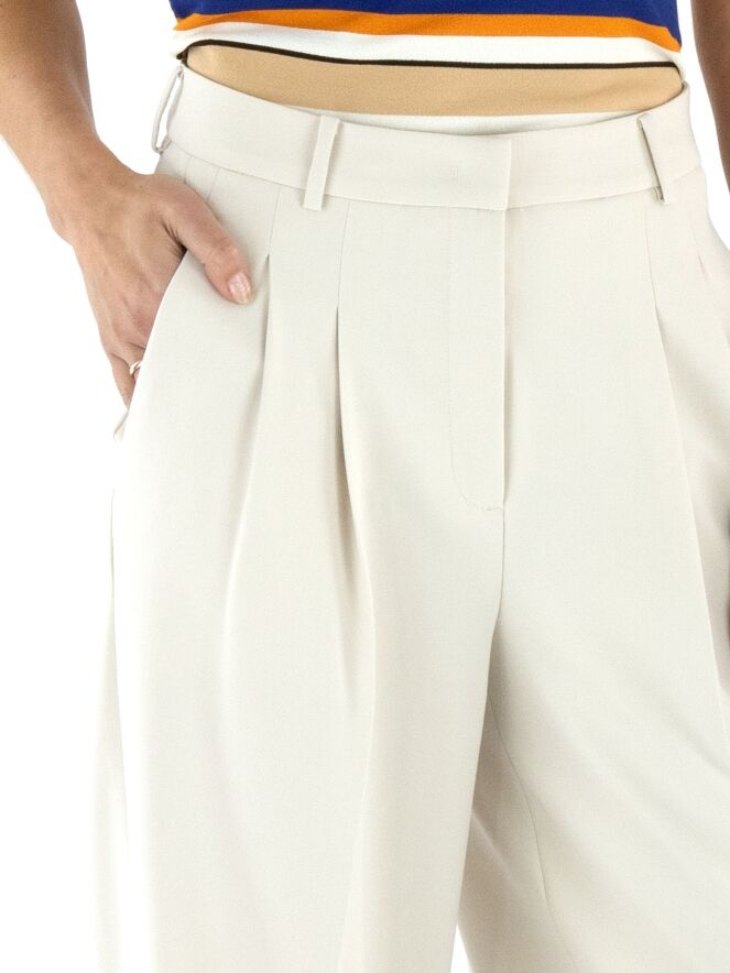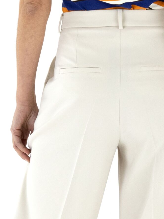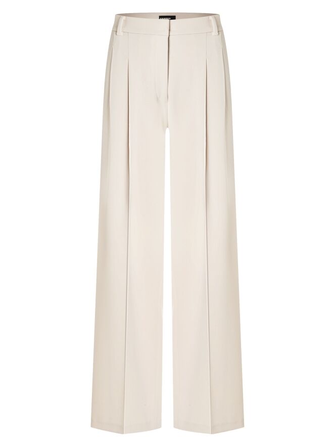 Eine weite Hose von Cambio in Beige. Der Bund ist mit mehreren Bundfalten versehen. In der Mitte der Hosenbeine verläuft eine eingepresste Falte. Die Hose hat Seitentaschen und sollte von Hand gewaschen werden.