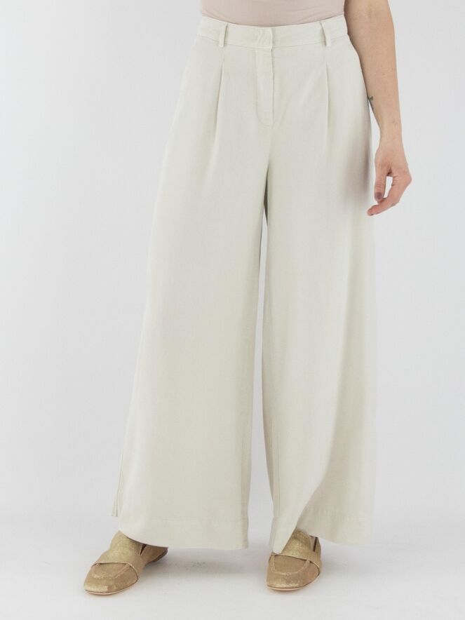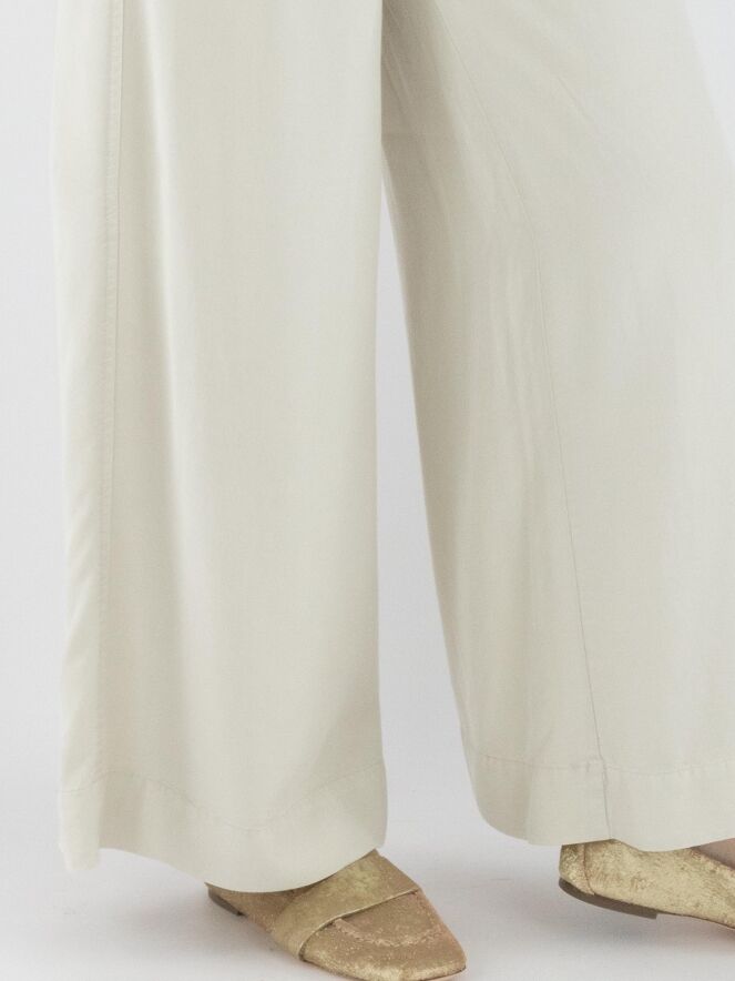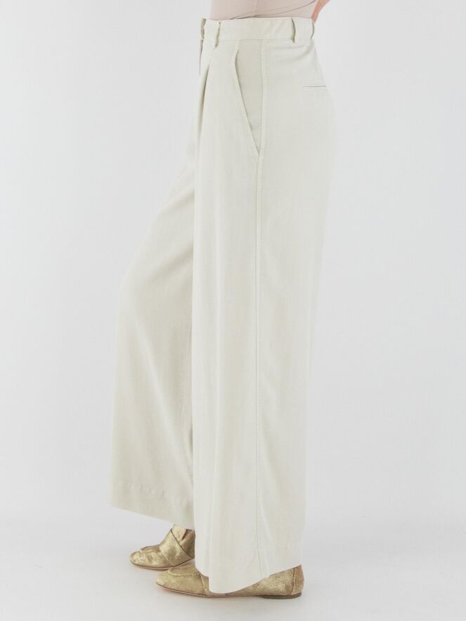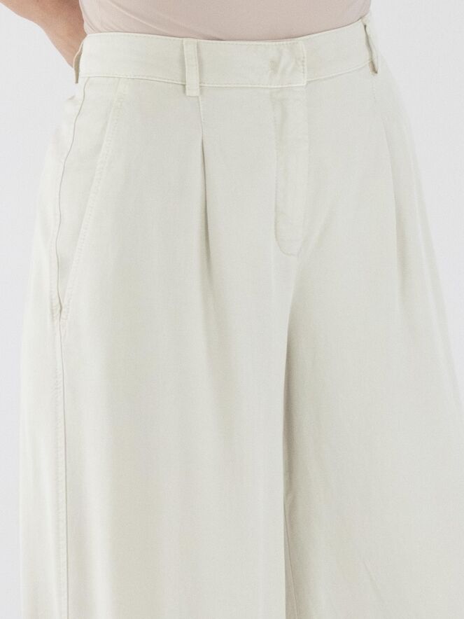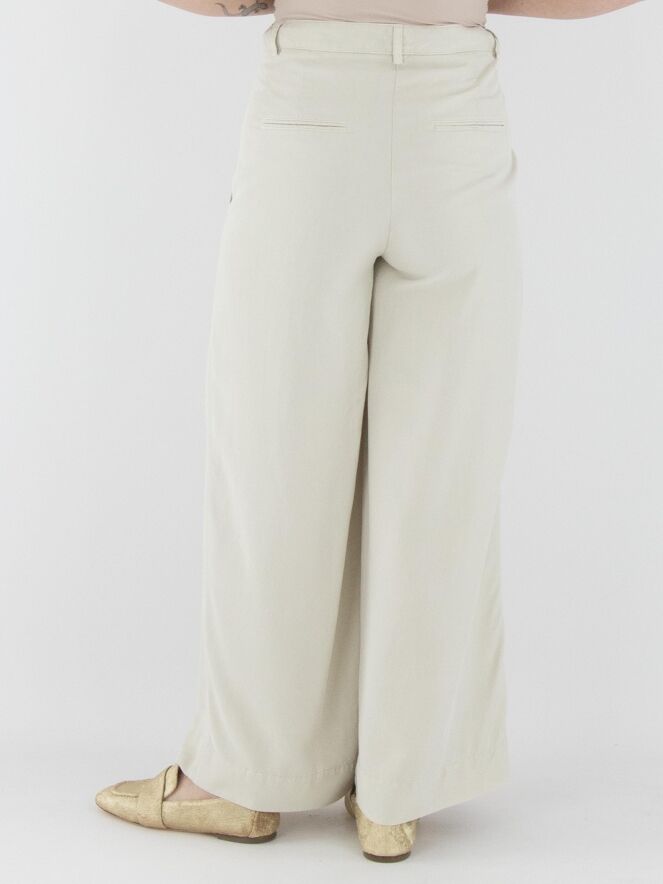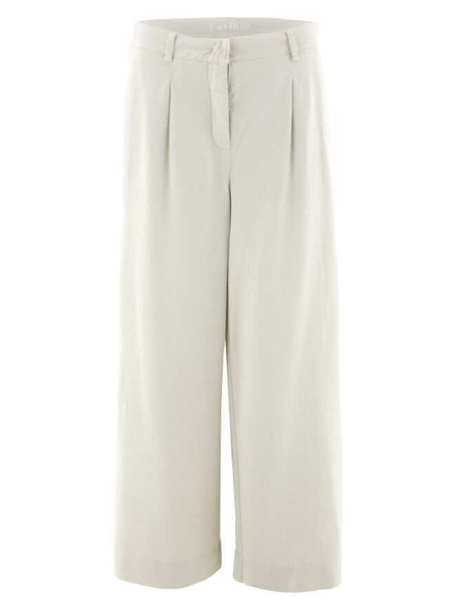 Eine Hose von Cambio in Beige. Die Hose hat weite Beine und Seitentaschen. Einige Bundfalten verlaufen von der Taille aus. Diese Hose kann bei 30 Grad gewaschen werden.