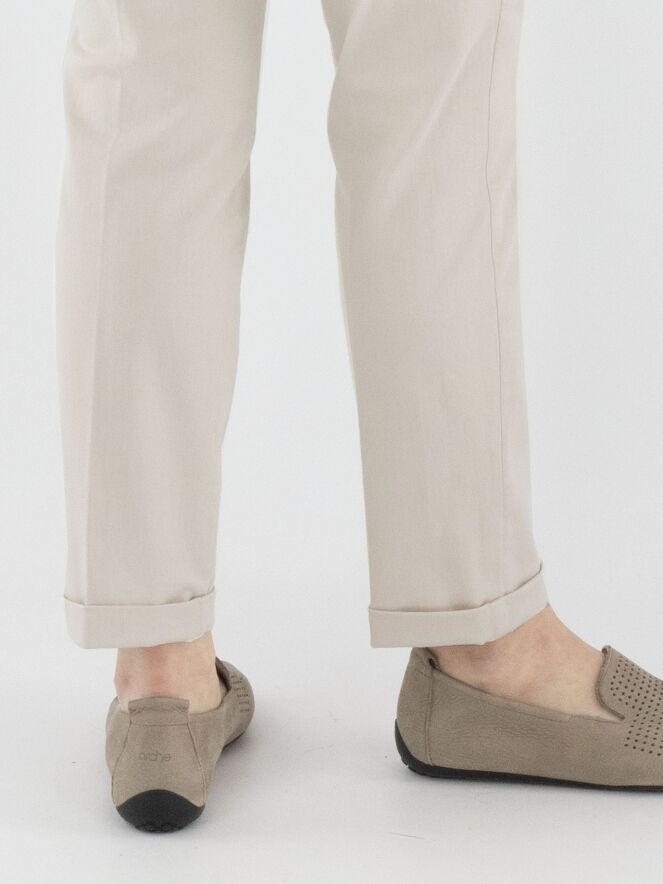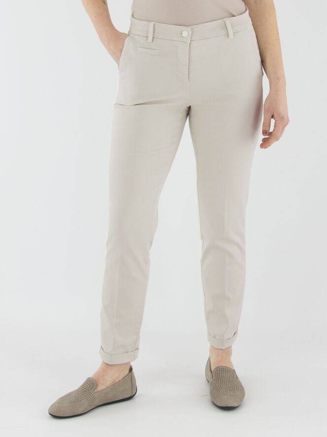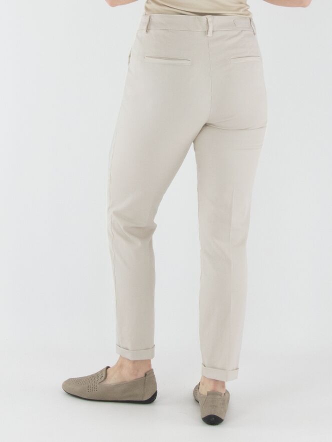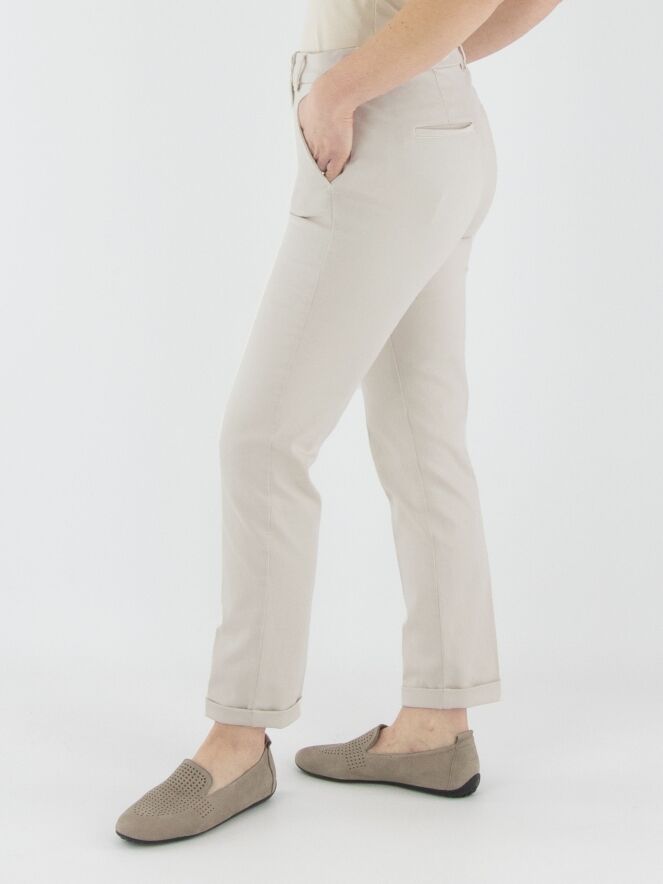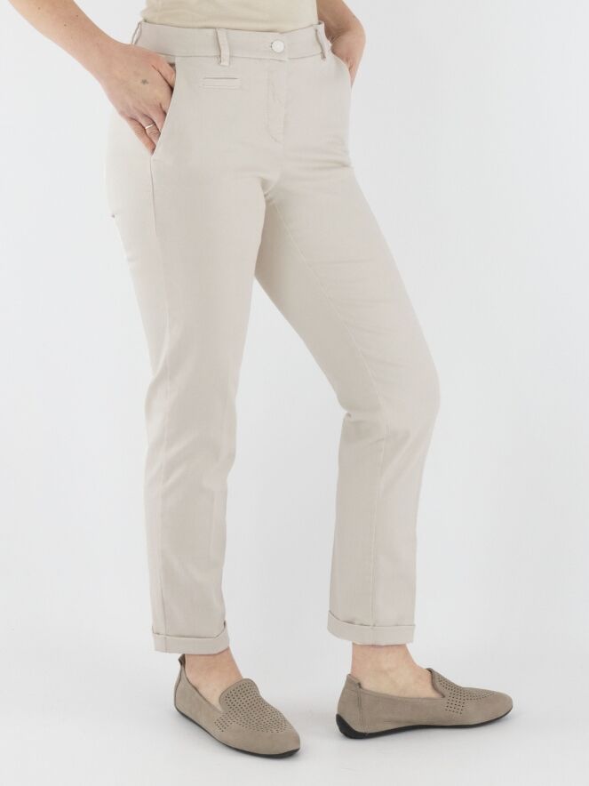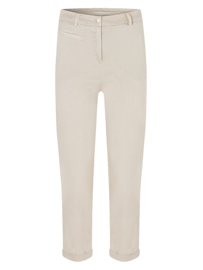 Eine Hose von Cambio in hellsandfarbener Ausführung. Die Hose hat Seitentaschen und einen kurzen Umschlag am Beinabschluss. Diese Hose kann bei 30 Grad gewaschen werden.