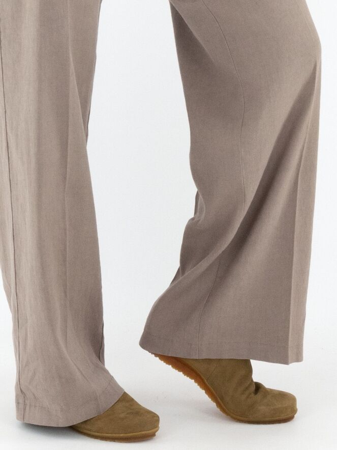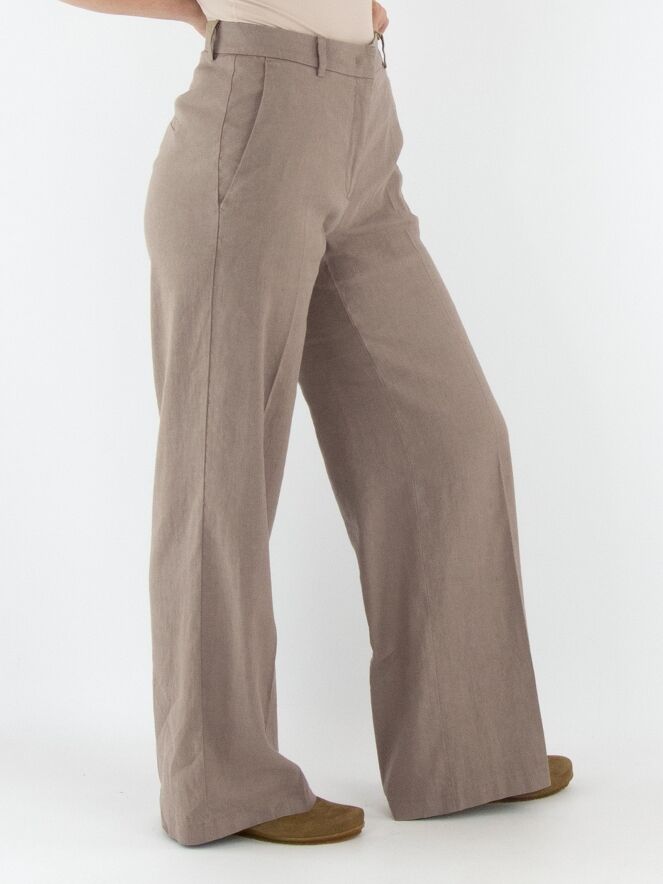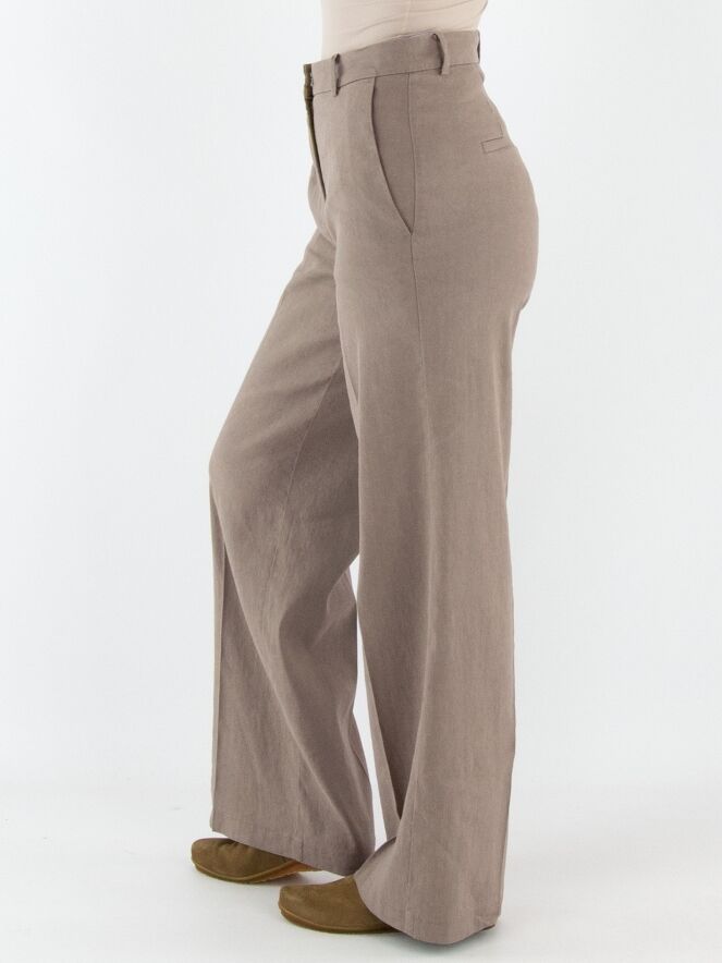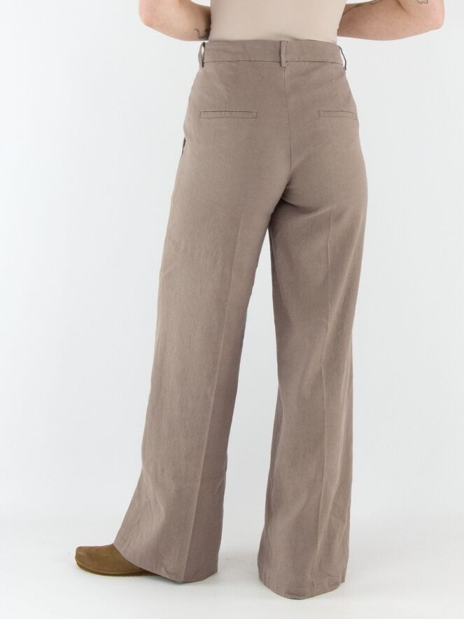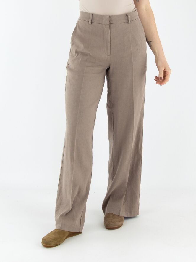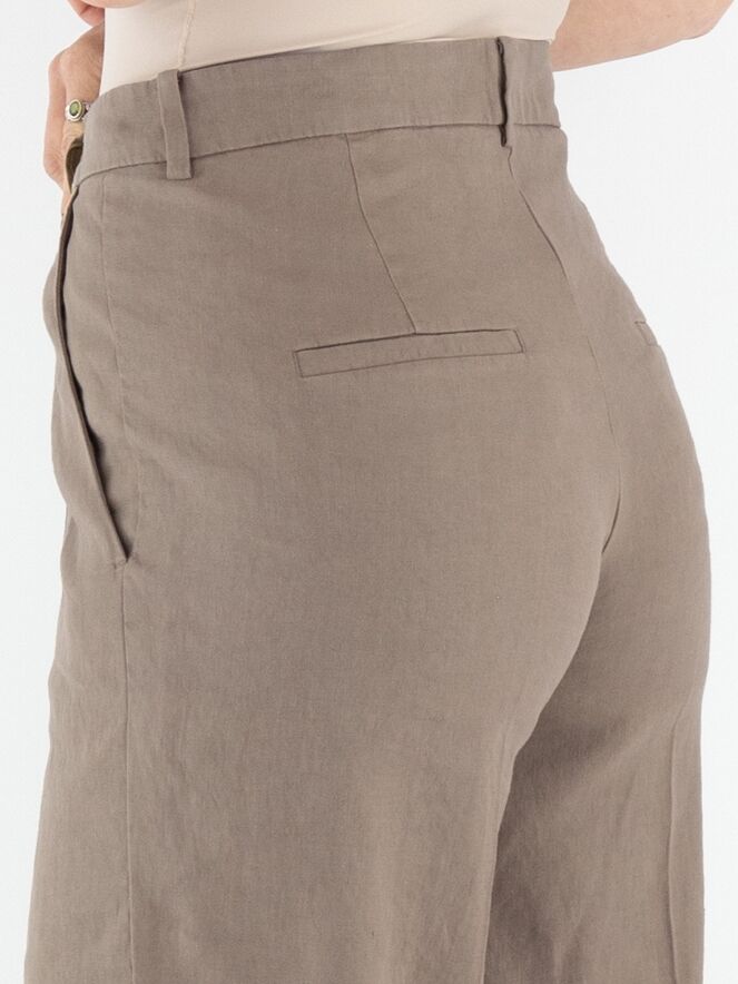 Eine Hose von Cambio in einem sanften Braunton. In der Mitte der gerade geschnittenen Hosenbeine verläuft sowohl vorne als auch hinten eine eingepresste Bügelfalte. Die Hose hat Seitentaschen und sollte per Hand gewaschen werden.