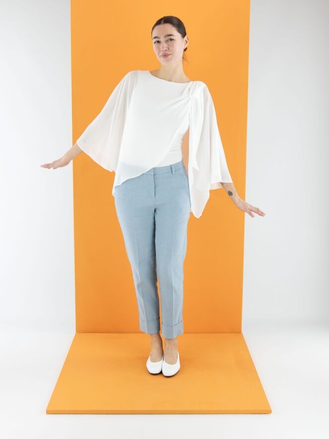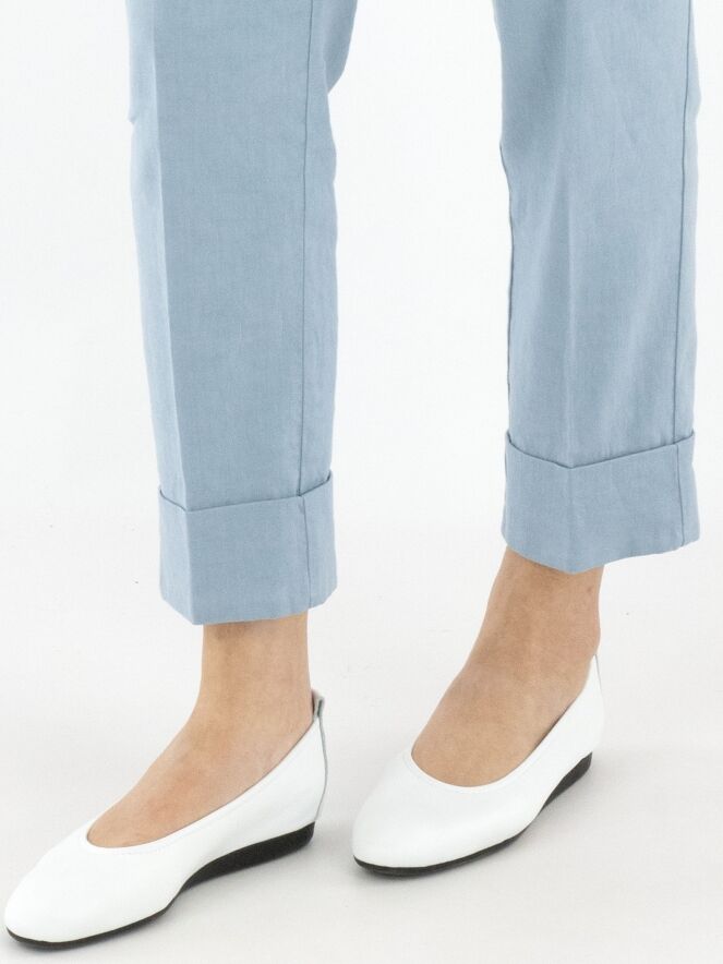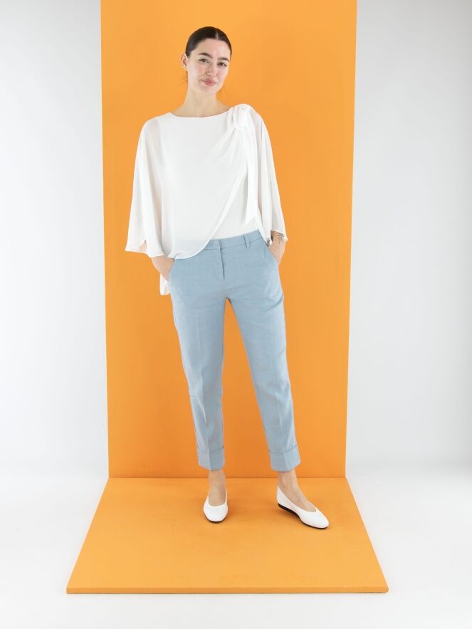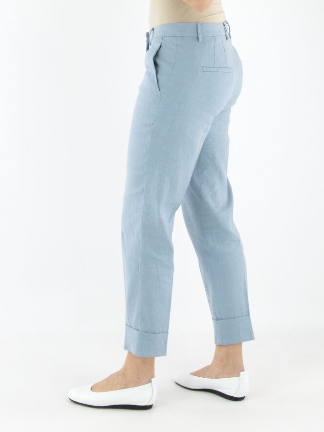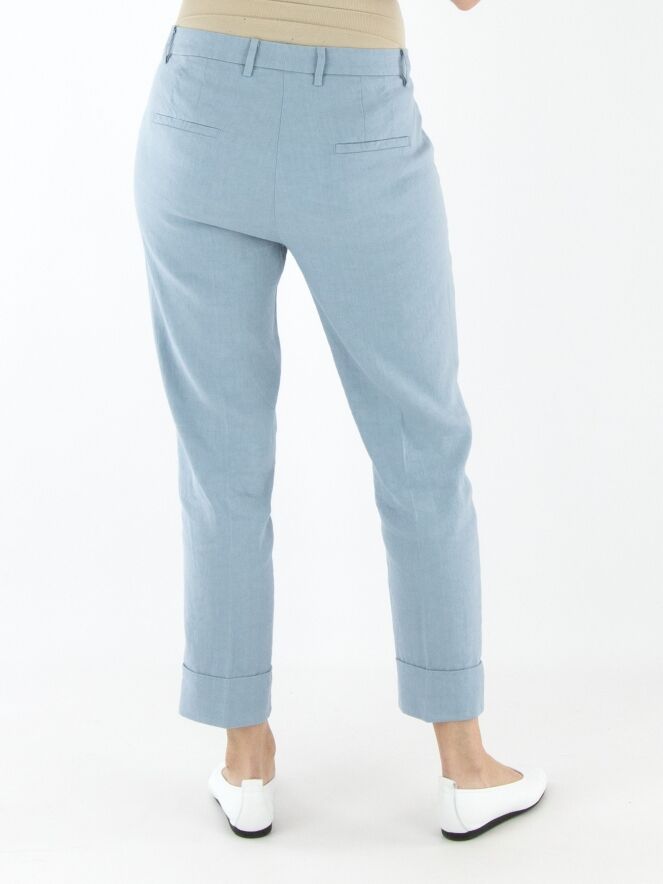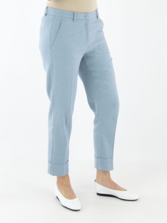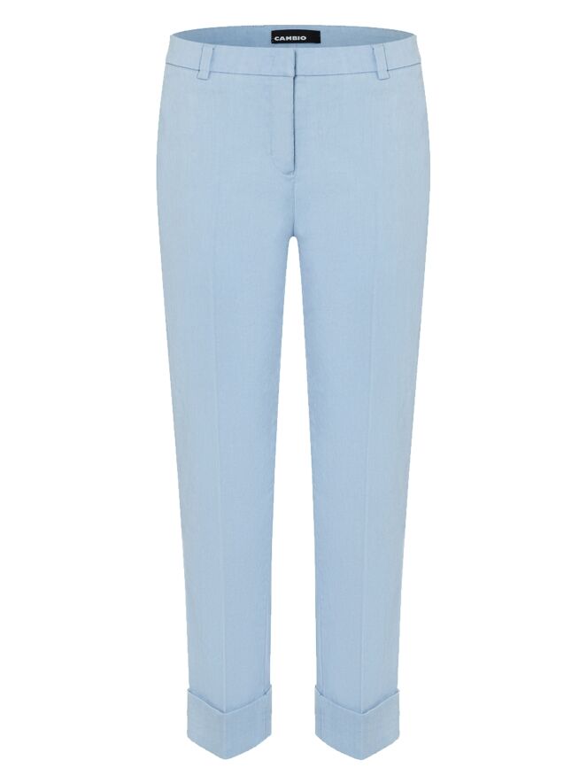 Eine Hose von Cambio in Hellblau. Am unteren Ende der Hosenbeine befindet sich ein breiter, festgesteppten Umschlag. Eine eingepresste Bügelfalte verläuft in der Mitte der Vorder- und Rückseite. Die Hose hat Eingrifftaschen und sollte von Hand gewaschen werden.