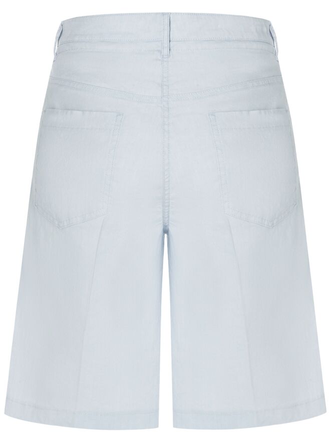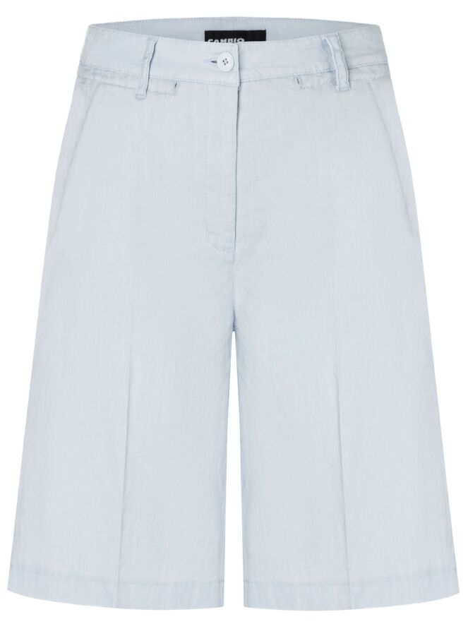 Eine Bermuda von Cambio in einem pastellblauen Farbton. Die Bermuda hat Eingrifftaschen und eine eingepresste Bügelfalte in der Mitte der Hosenbeine, sowohl vorne als auch hinten. Diese Hose sollte per Hand gewaschen werden.