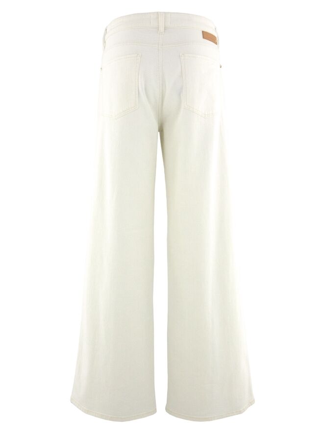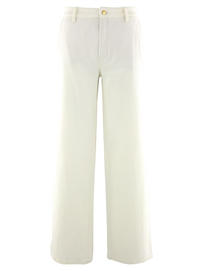 Eine weite Jeans von Cambio in Cremeweiß. Die Jeans hat Seitentaschen und kann bei 30 Grad gewaschen werden.