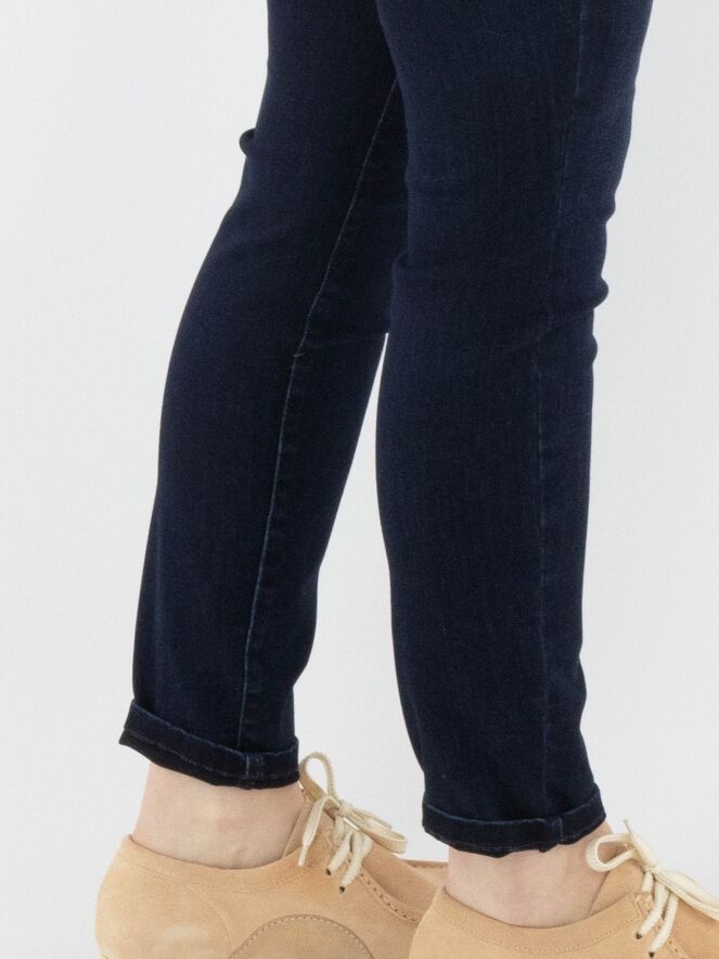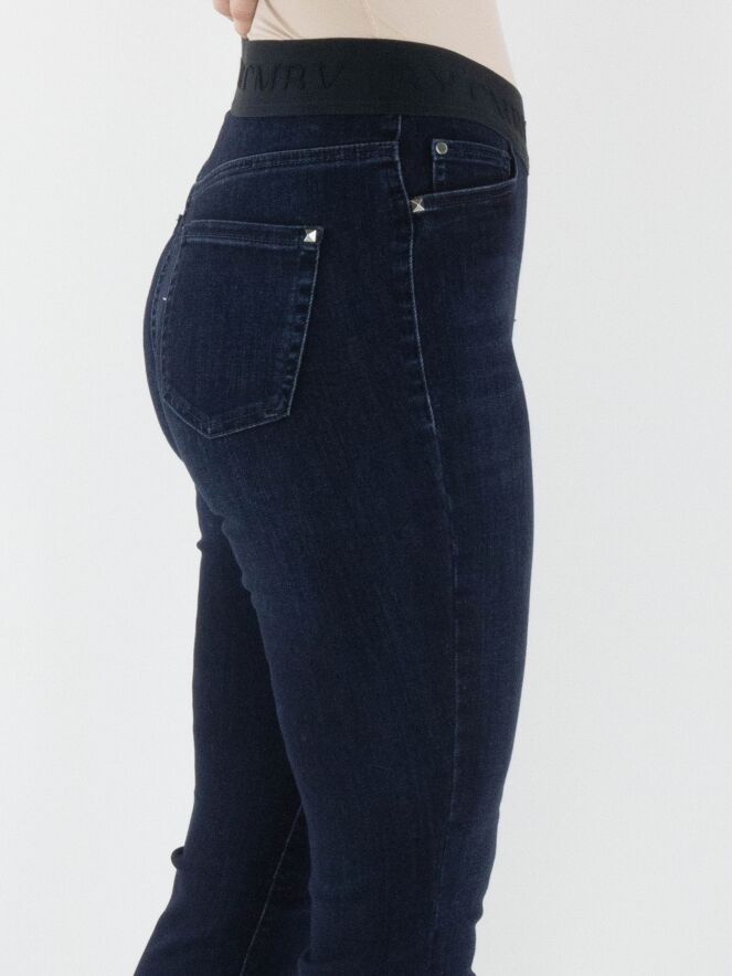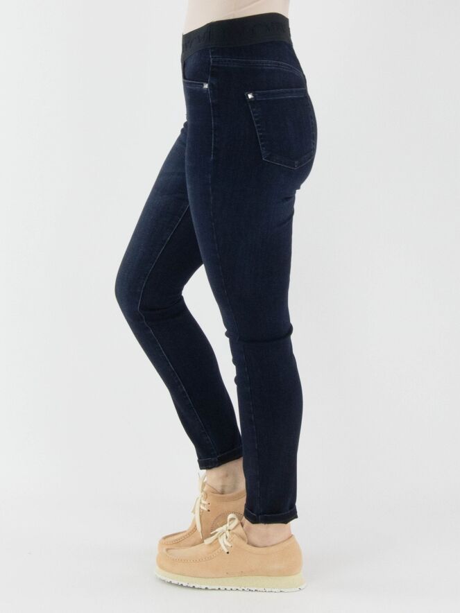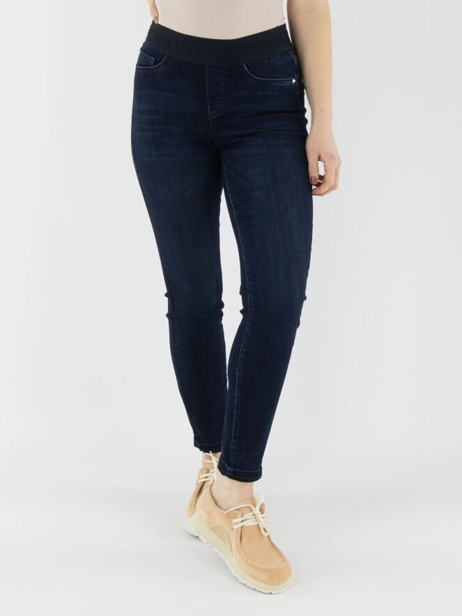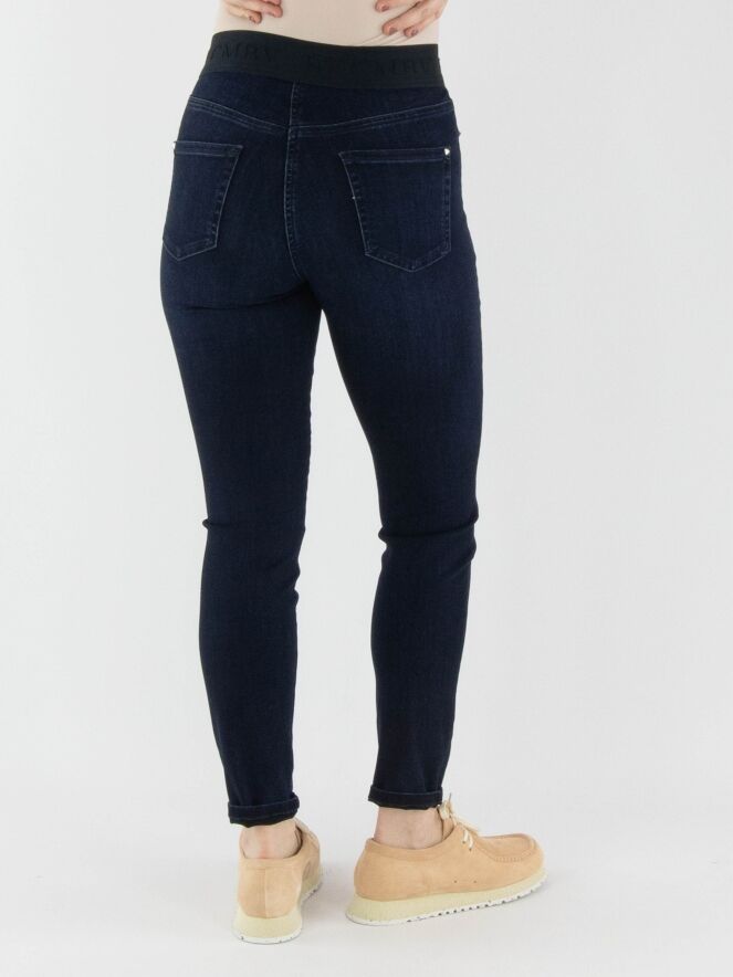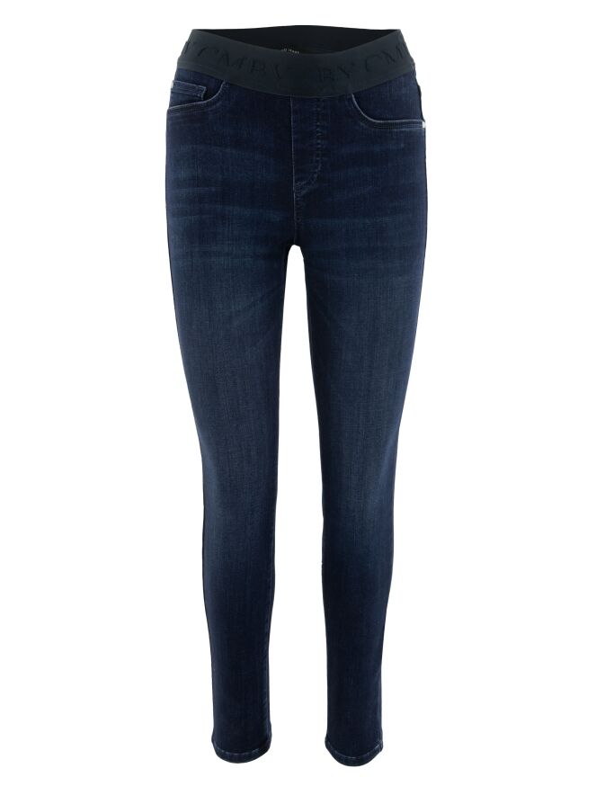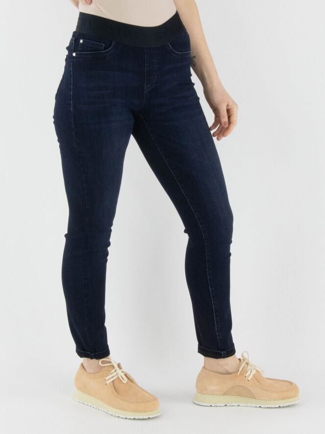 Eine Dark-Denim-Jeans von Cambio in einer dunklen Jeansfarbe. Der Bund ist mit einem schwarzen elastischen Band ausgestattet. Die Jeans hat ein 5-Pocket-Design und kann bei 30 Grad gewaschen werden.