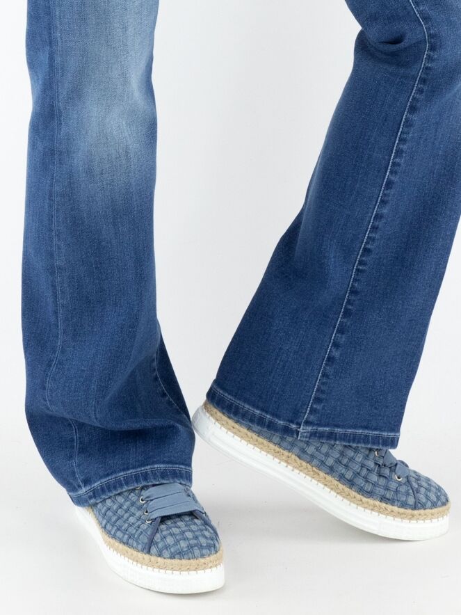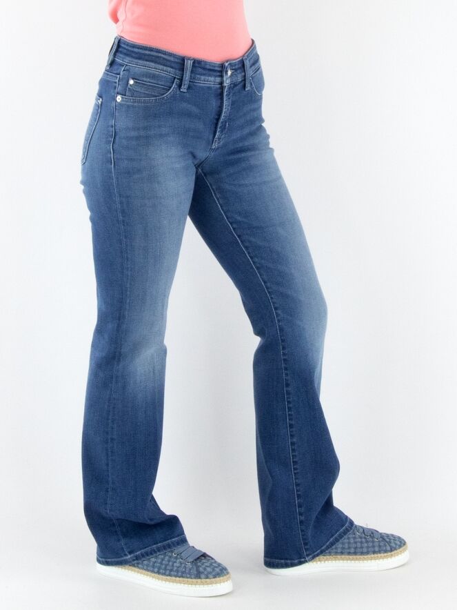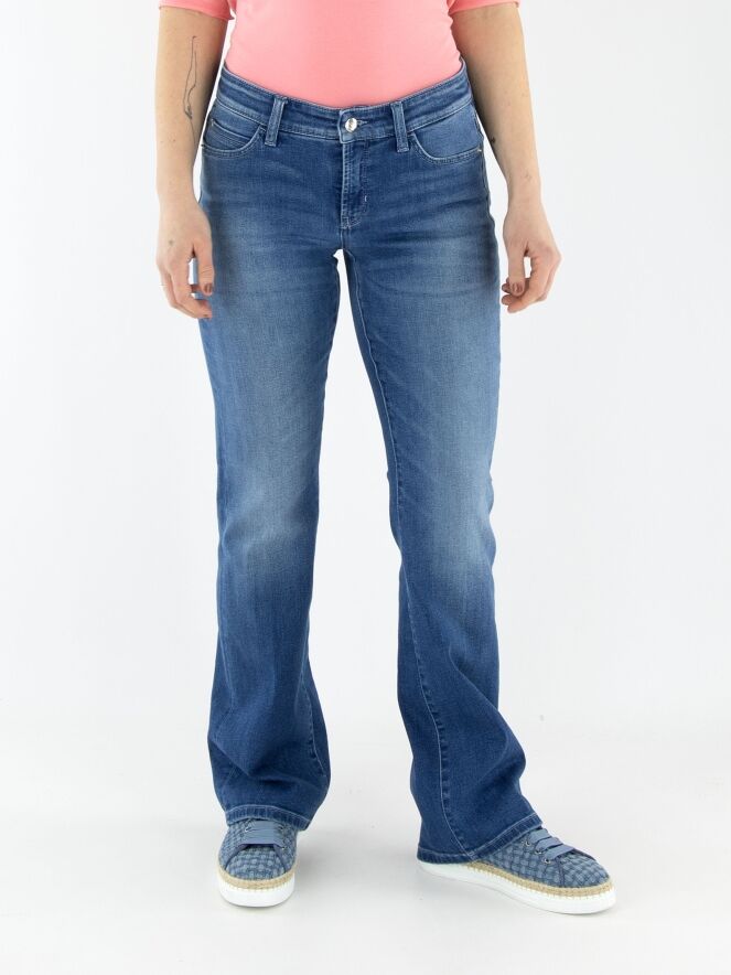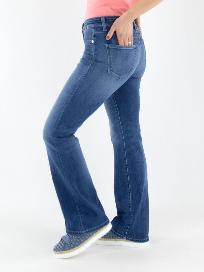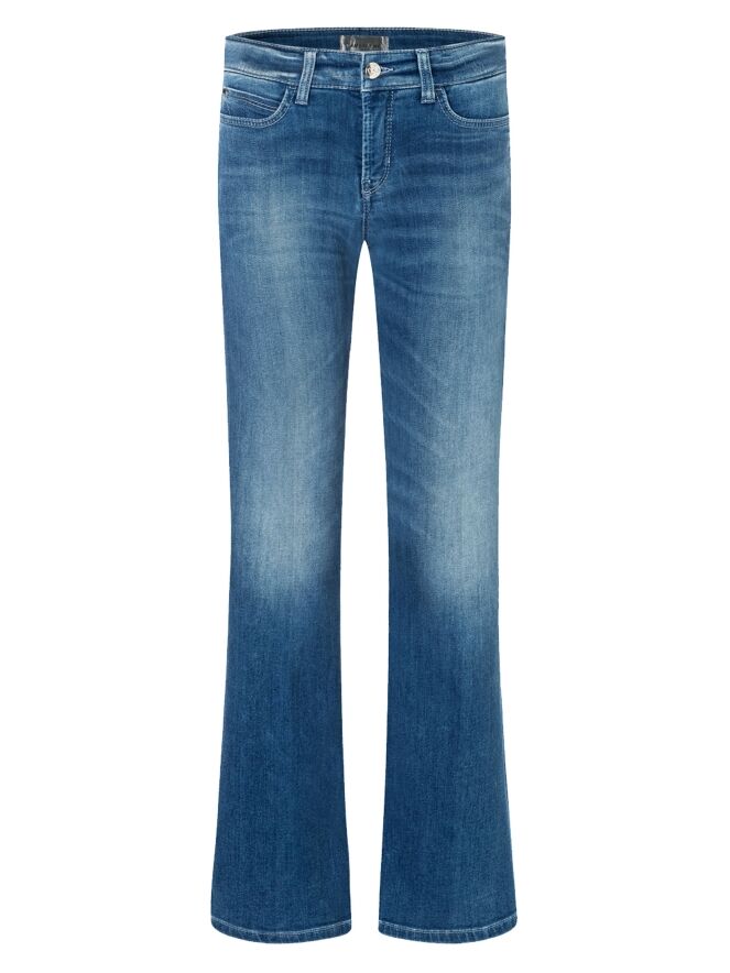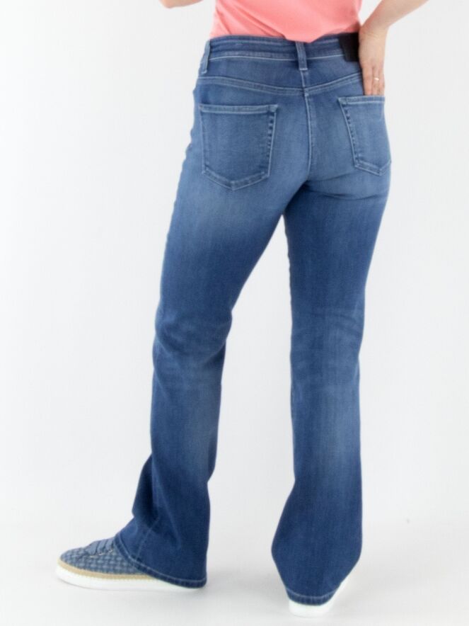 Eine gewaschene Flared-Jeans von Cambio in einer klassischen Jeansfarbe. Die Jeans hat ein 5-Pocket-Design und kann bei 30 Grad gewaschen werden.