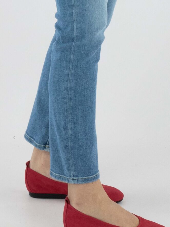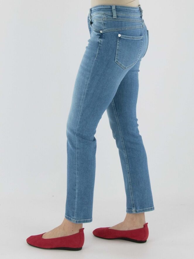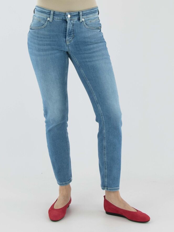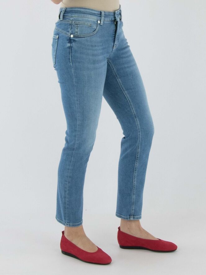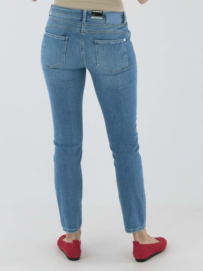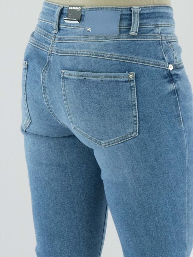 Eine gewaschene Jeans von Cambio in einer klassischen Denimfarbe. Diese Jeans kann bei 30 Grad gewaschen werden.