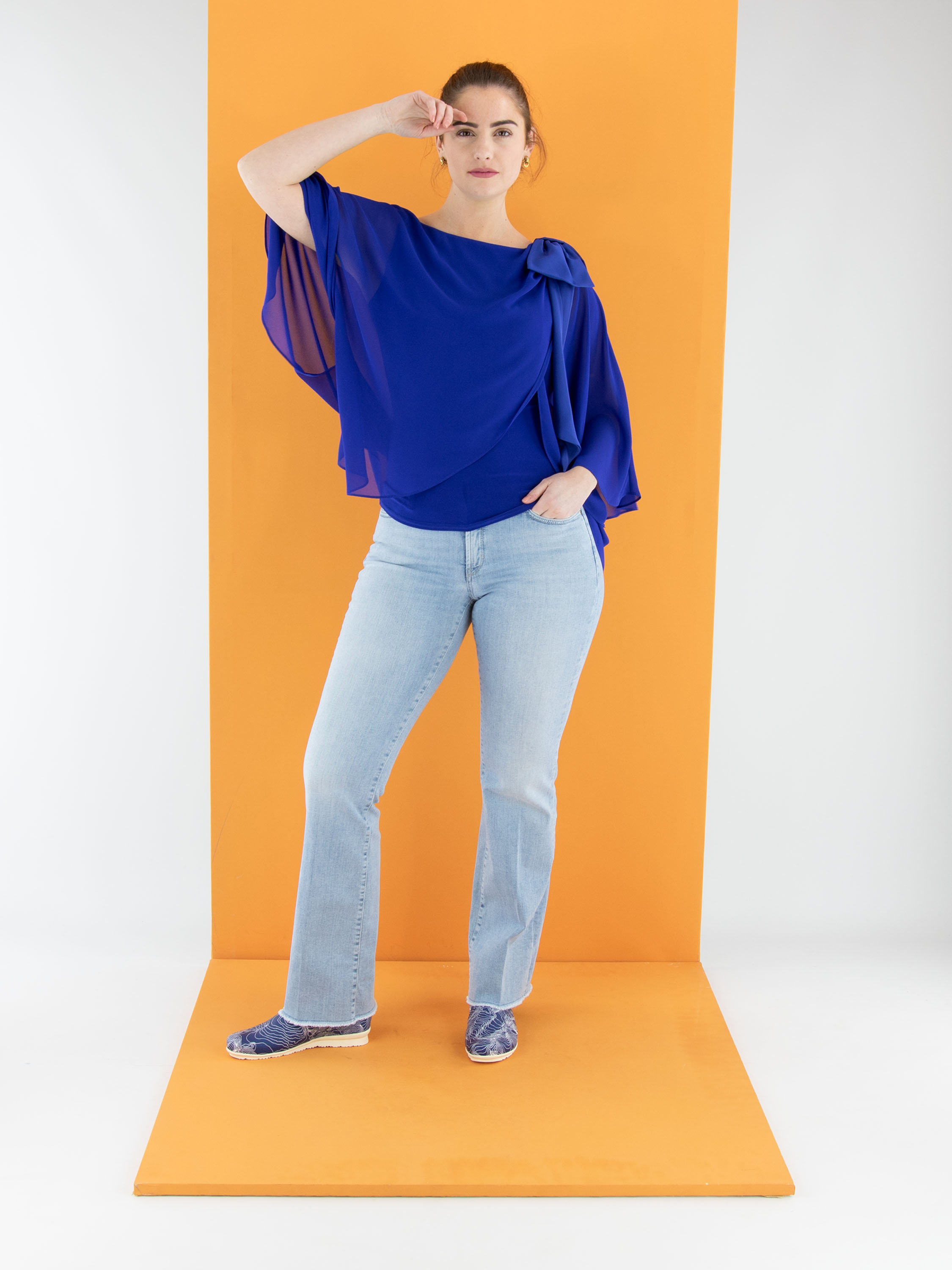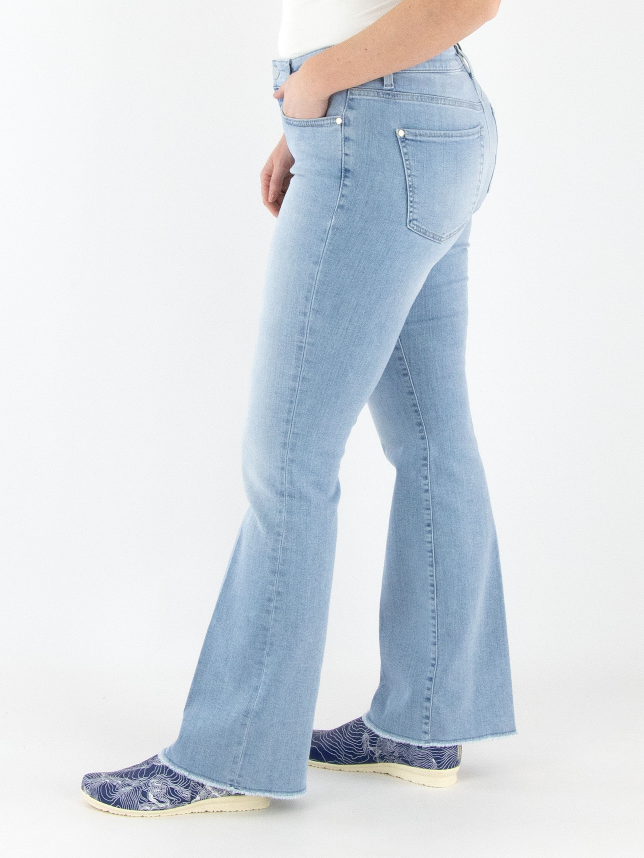 Eine Schlagjeans von Cambio in einer hellen Denimfarbe. Die Jeans ist im 5-Pocket-Stil gefertigt und hat fein ausgefranste Säume an den Beinabschlüssen. Diese Jeans kann bei 30 Grad gewaschen werden.