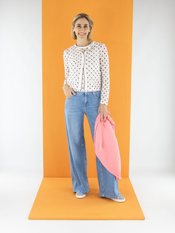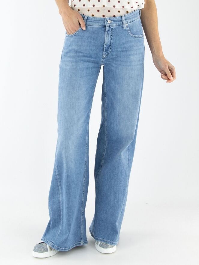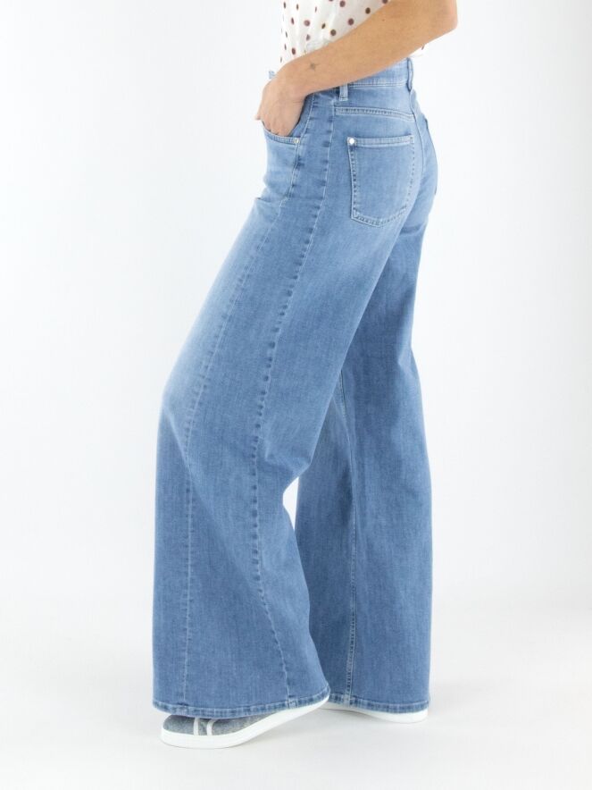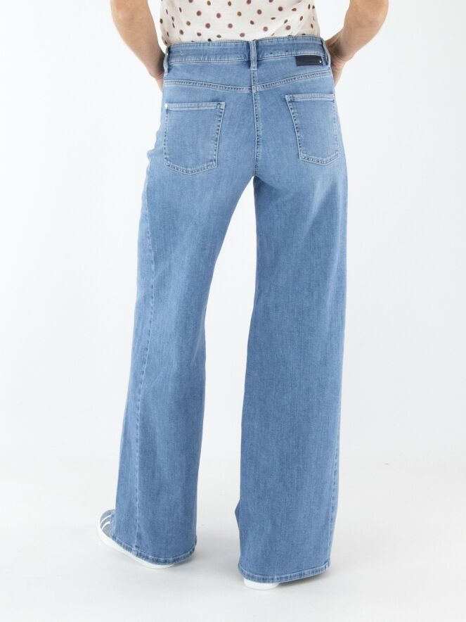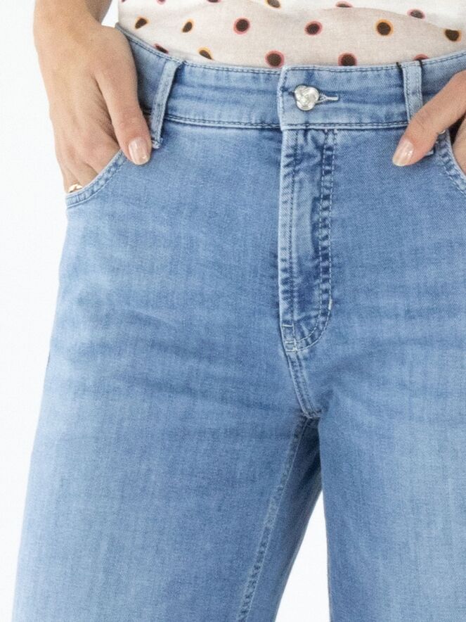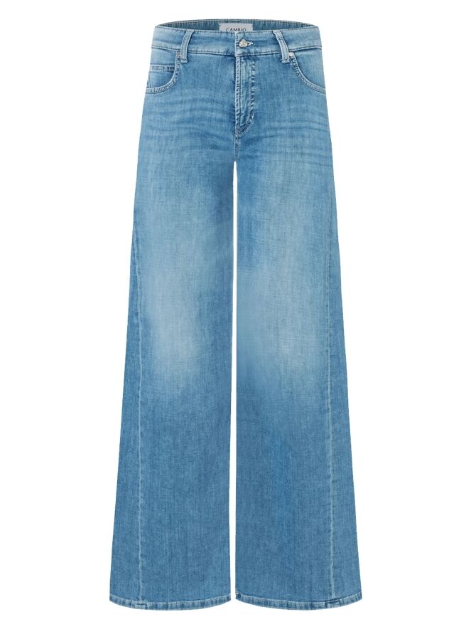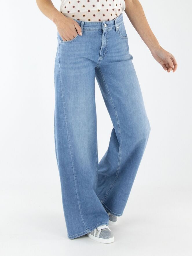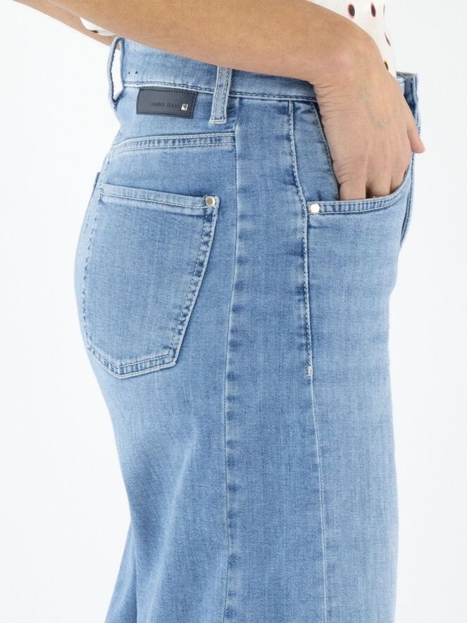 Eine weite Jeans von Cambio in einer hellen Jeansfarbe. Die Jeans hat ein 5-Pocket-Design und kann bei 30 Grad gewaschen werden.
