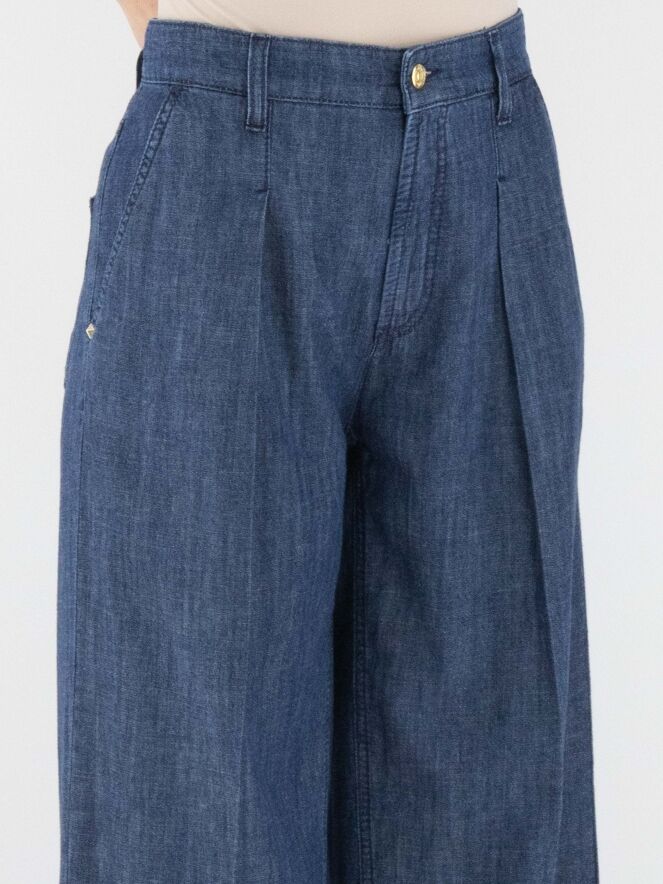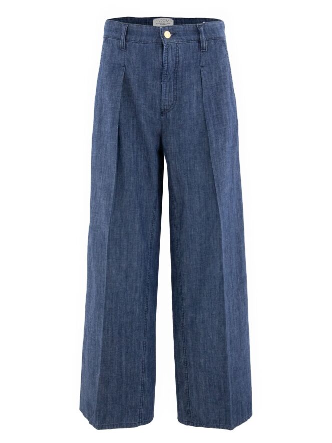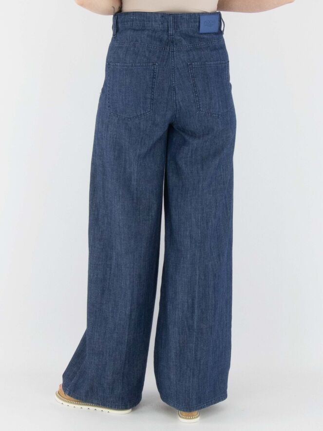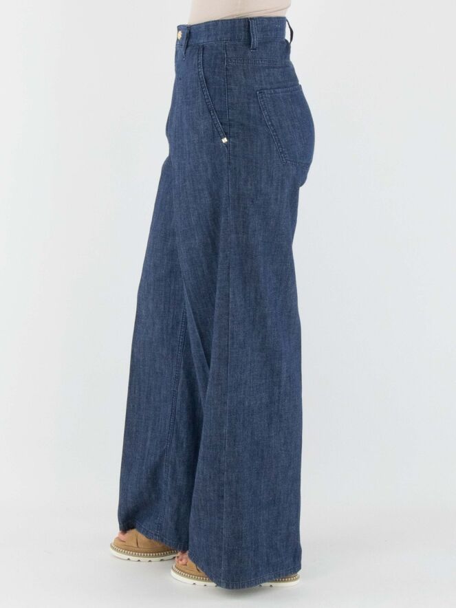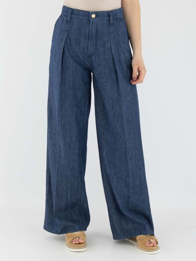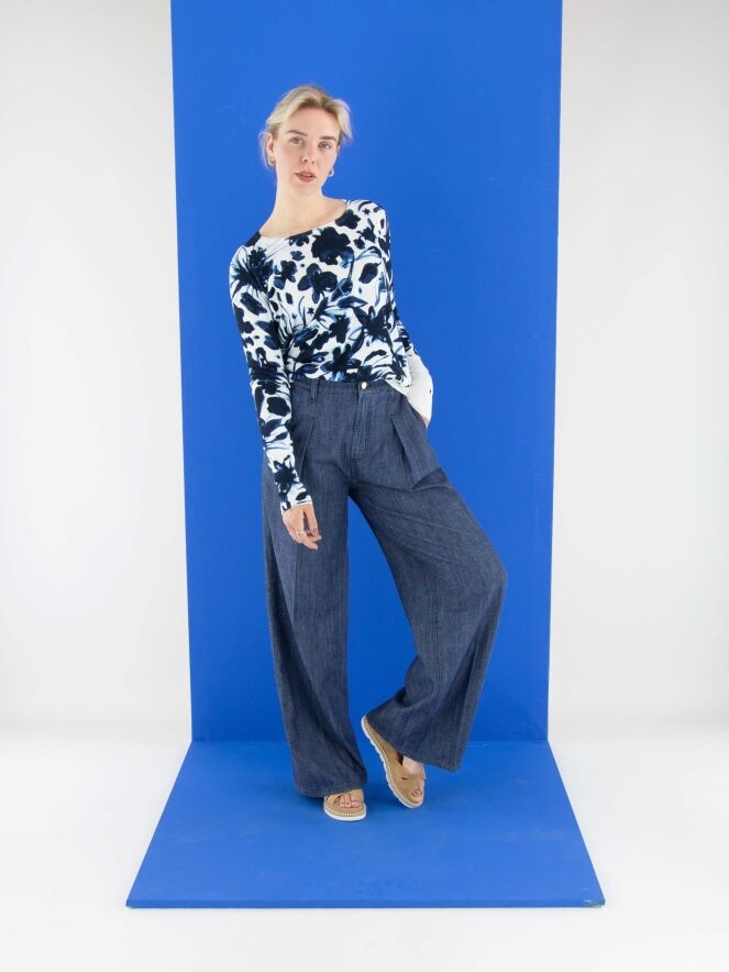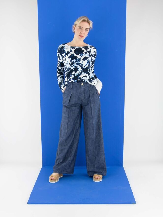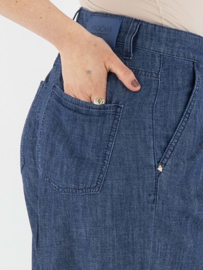 Eine weit geschnittene, melierte Hose mit Denim-Look in Jeansfarbe. Die Hose hat Seitentaschen und eine eingepresste Bügelfalte in der Mitte der Hosenbeine. Diese Hose kann bei 30 Grad gewaschen werden.
