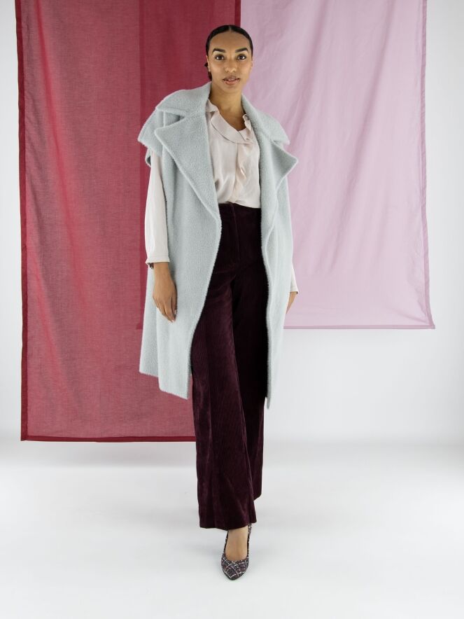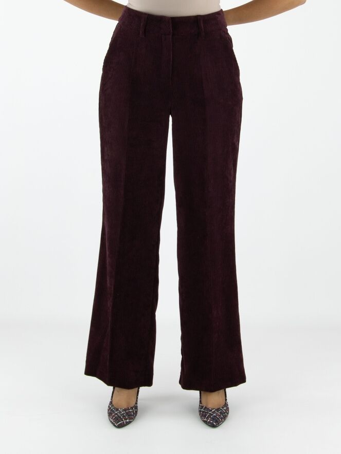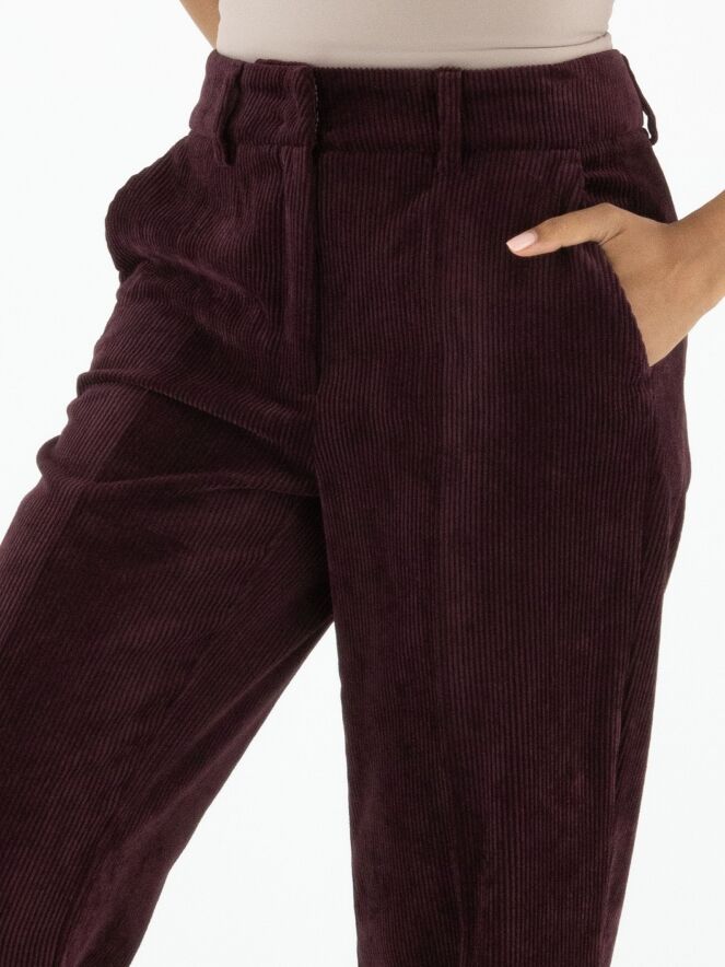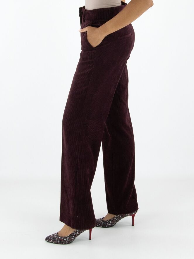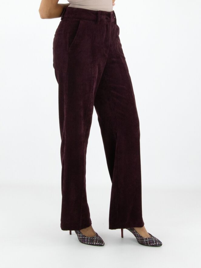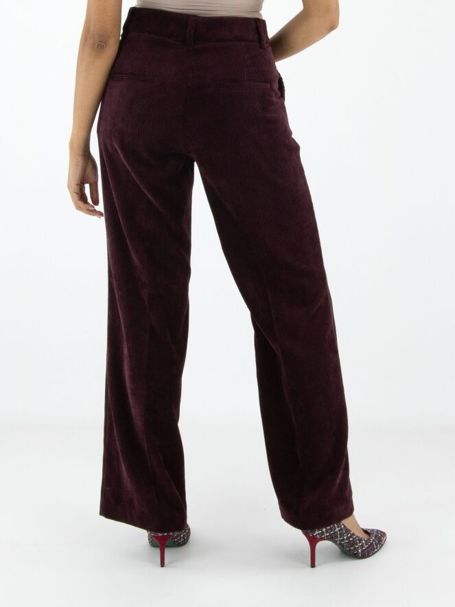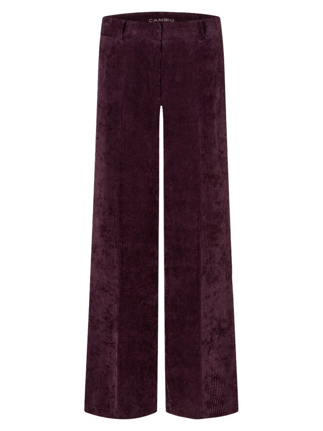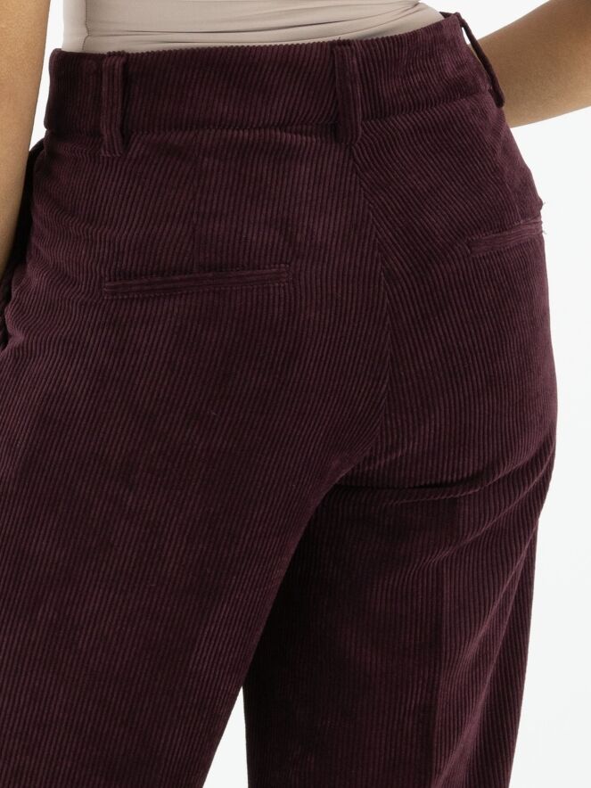 Luxuriöse, gerade geschnittene Cordhose von Cambio in Auberginerot. Eine gebügelte Bügelfalte verläuft mittig entlang der Hosenbeine. Die Hose hat Seitentaschen und sollte von Hand gewaschen werden.