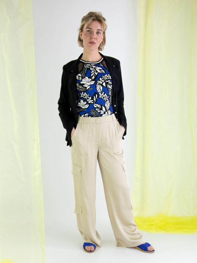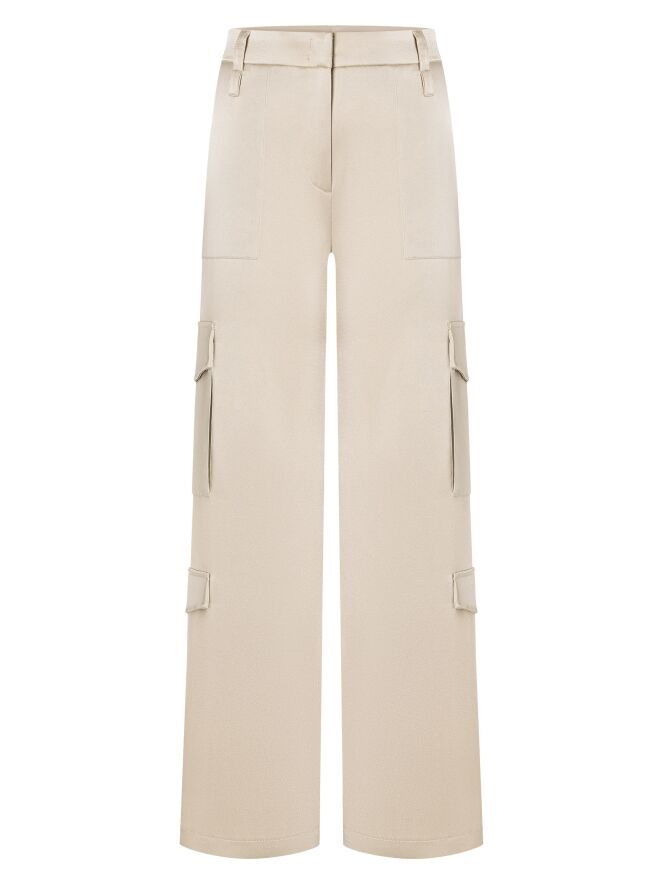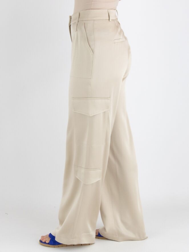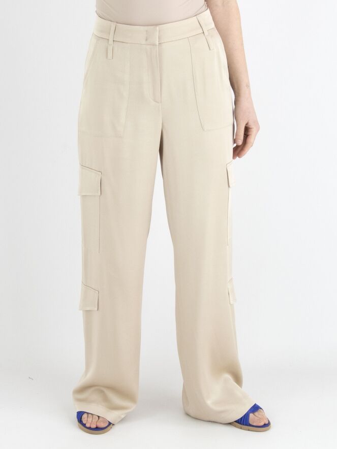 Eine weite Cargohose aus mattem Satin von Cambio in Beige. Die Hose hat Taschenklappen sowohl an den oberen als auch an den unteren Beinen. Unterhalb der Taille befinden sich auch Seitentaschen, und diese Hose kann von Hand gewaschen werden.