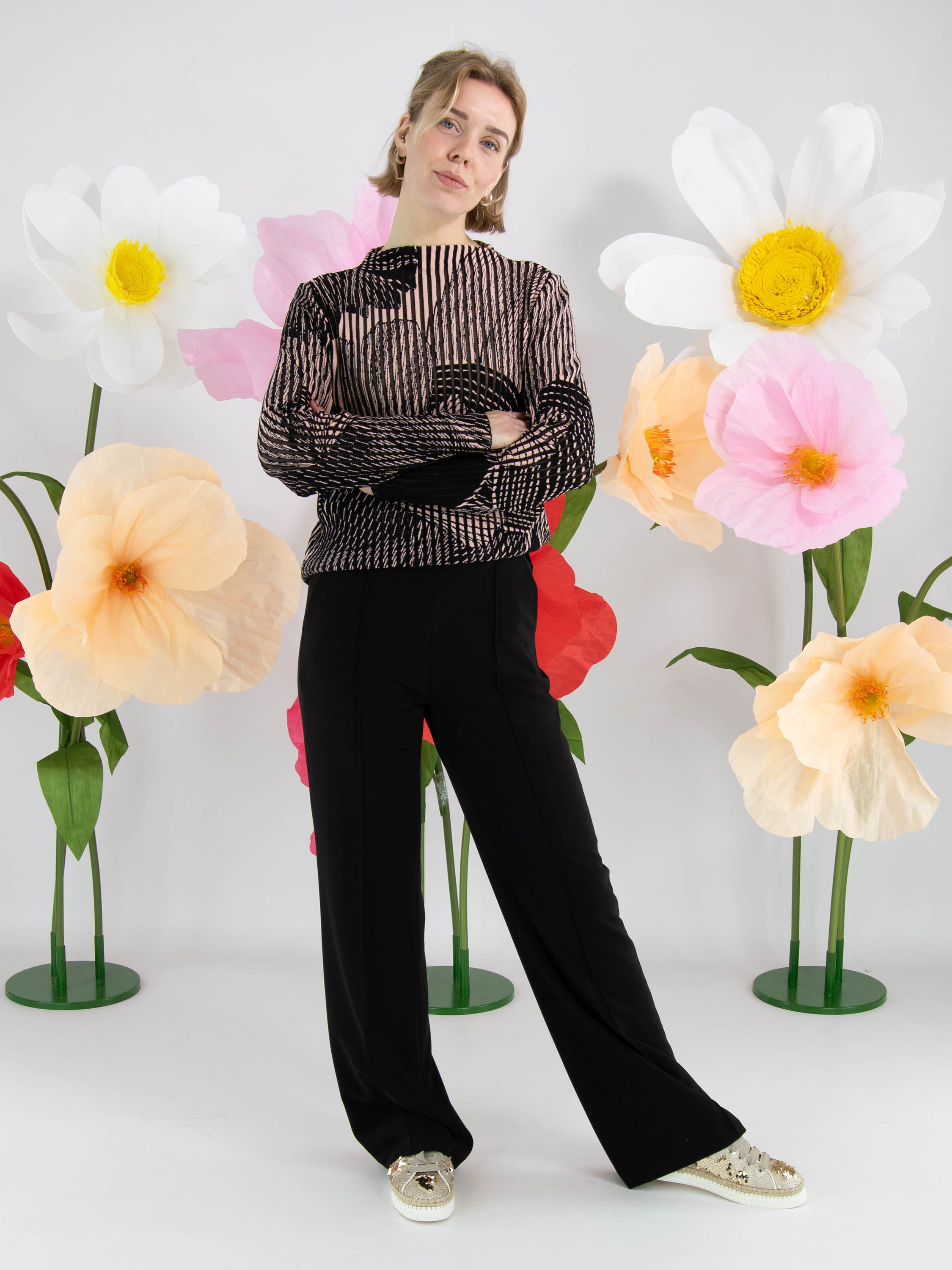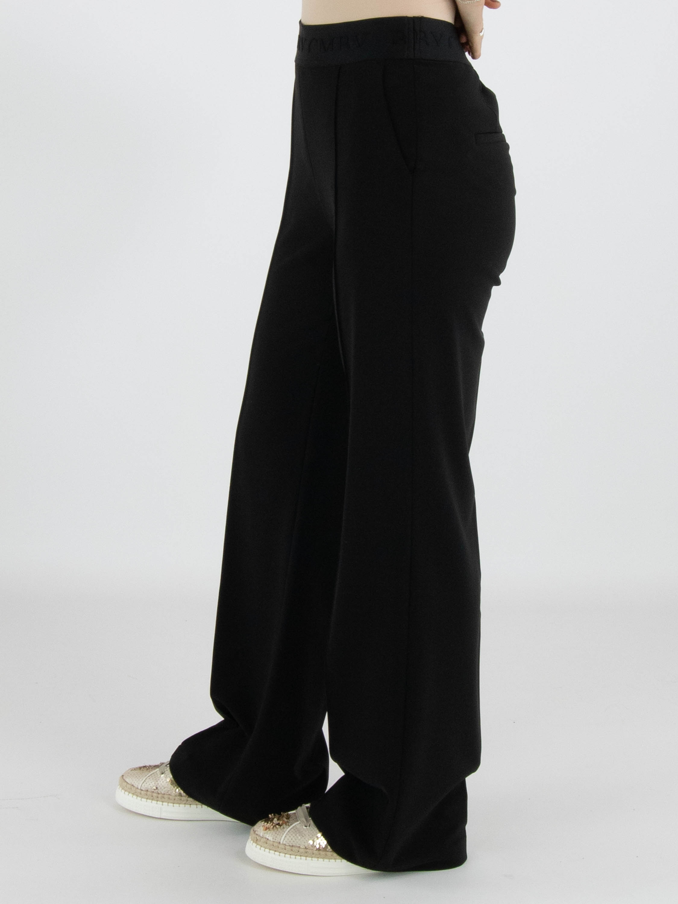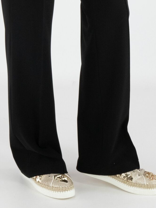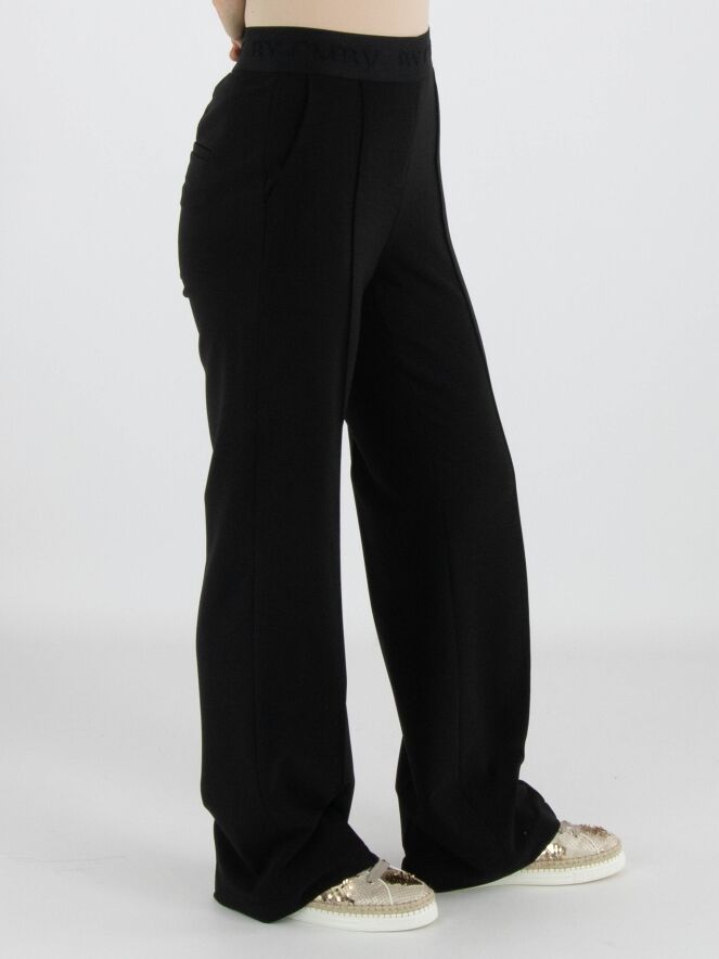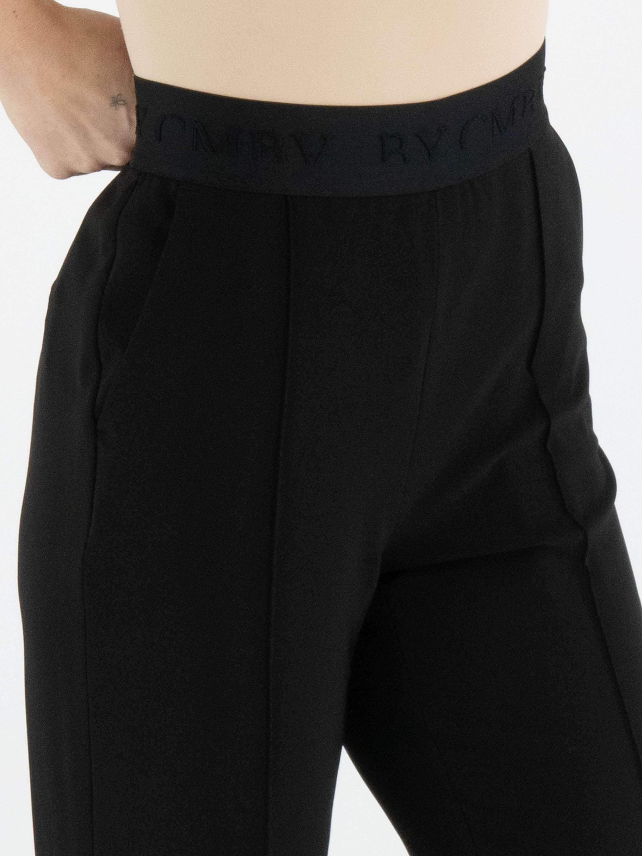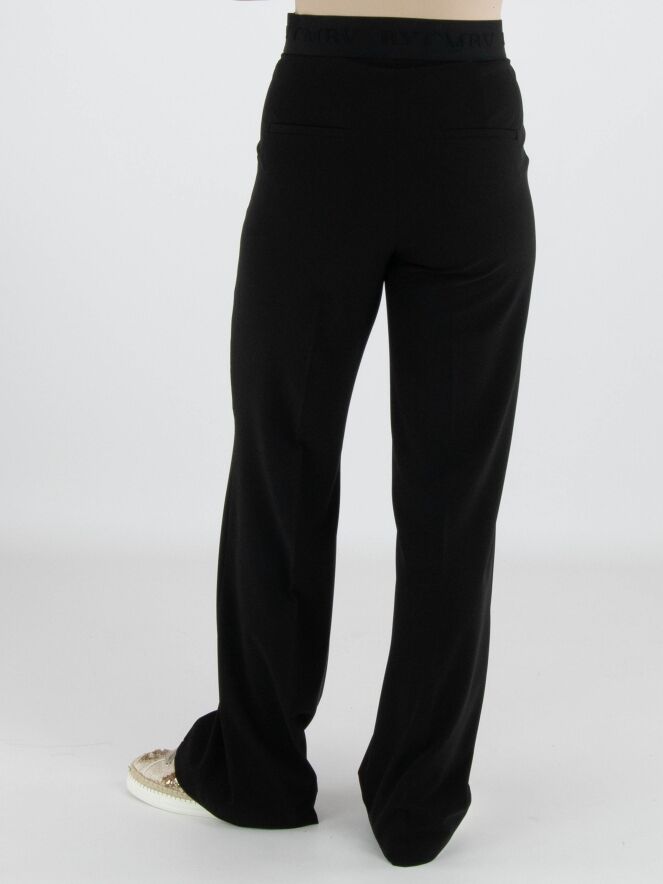 Eine luxuriöse Hose von Cambio in Schwarz. In der Taille befindet sich ein elastischer Bund mit eingewebten Buchstaben. Die Hose hat Eingrifftaschen und auf der Vorderseite der Hosenbeine verläuft eine mittige Naht. Diese Hose kann bei 30 Grad gewaschen werden.