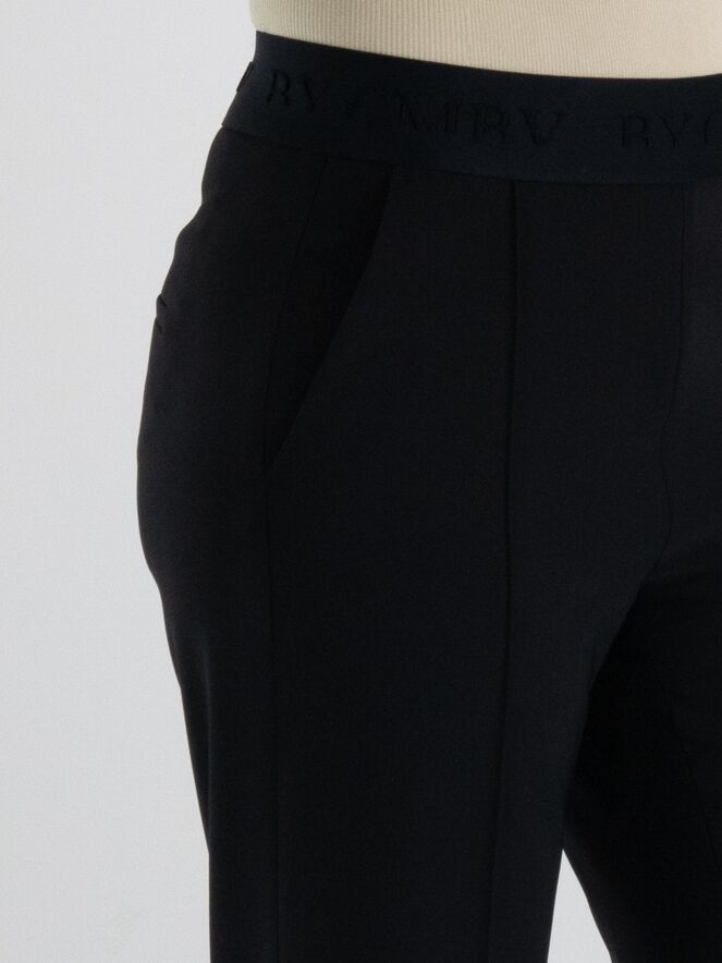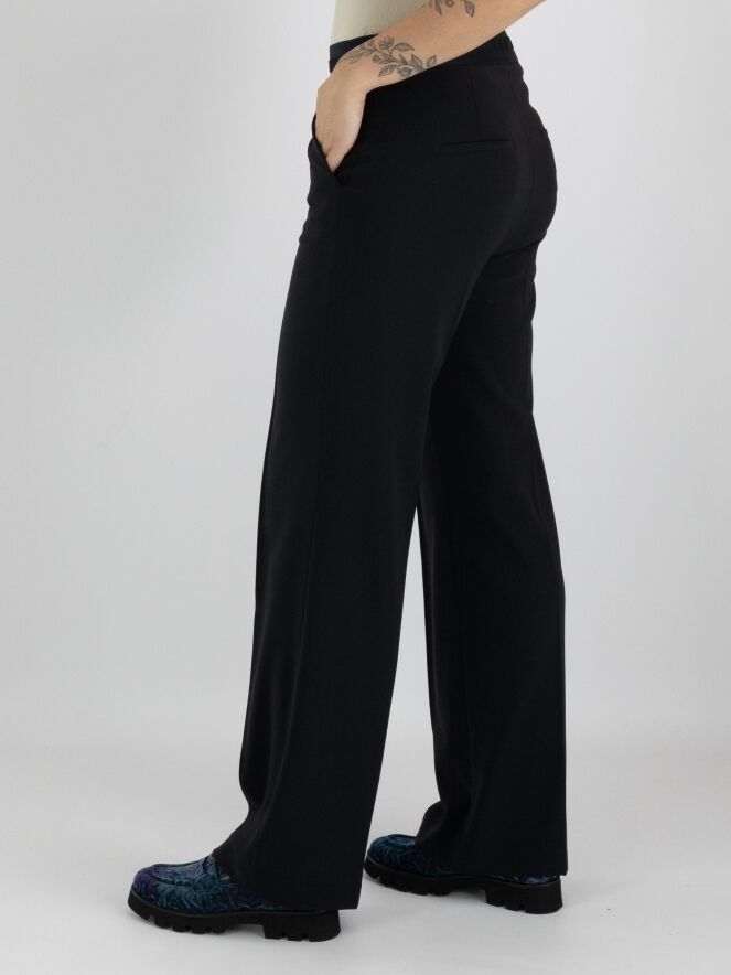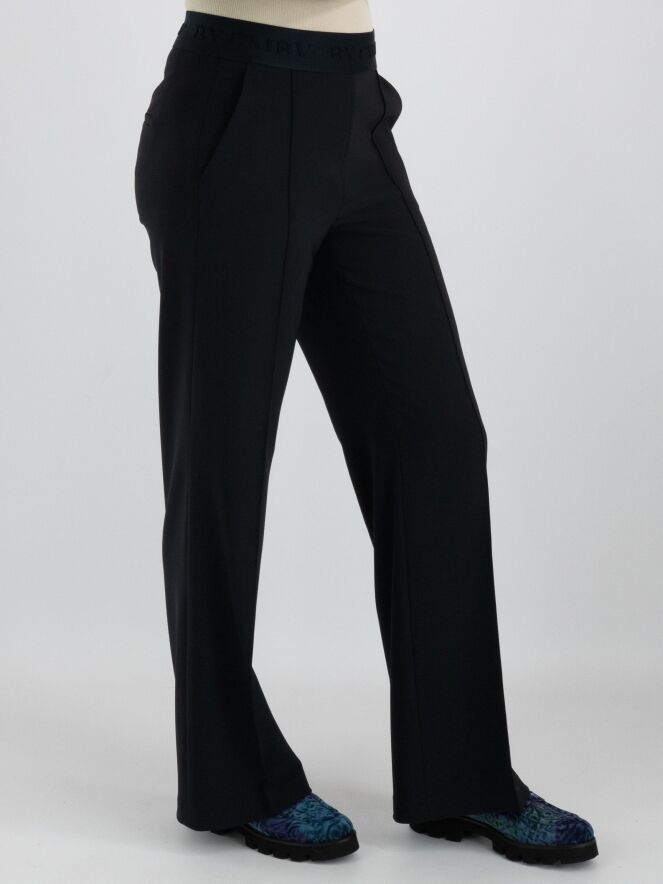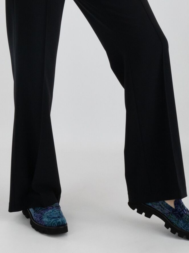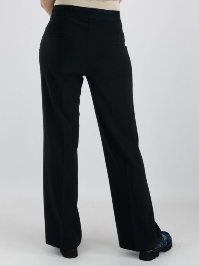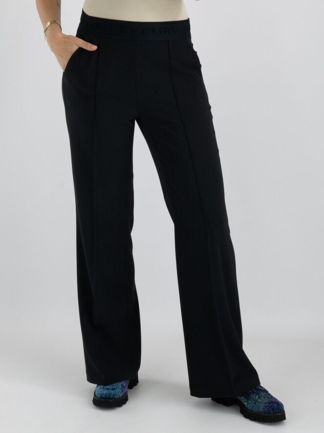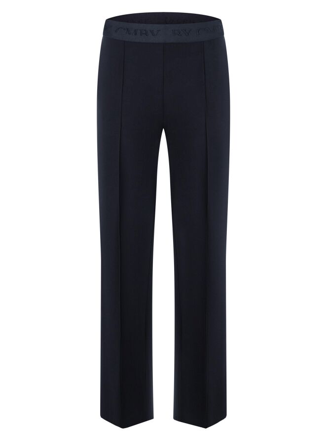 Eine luxuriöse Hose von Cambio in Blau. Am Bund ist ein elastisches Band mit eingewebten Buchstaben. Die Hose hat Seitentaschen und eine Naht, die vorne in der Mitte der Beine verläuft. Diese Hose kann bei 30 Grad gewaschen werden.
